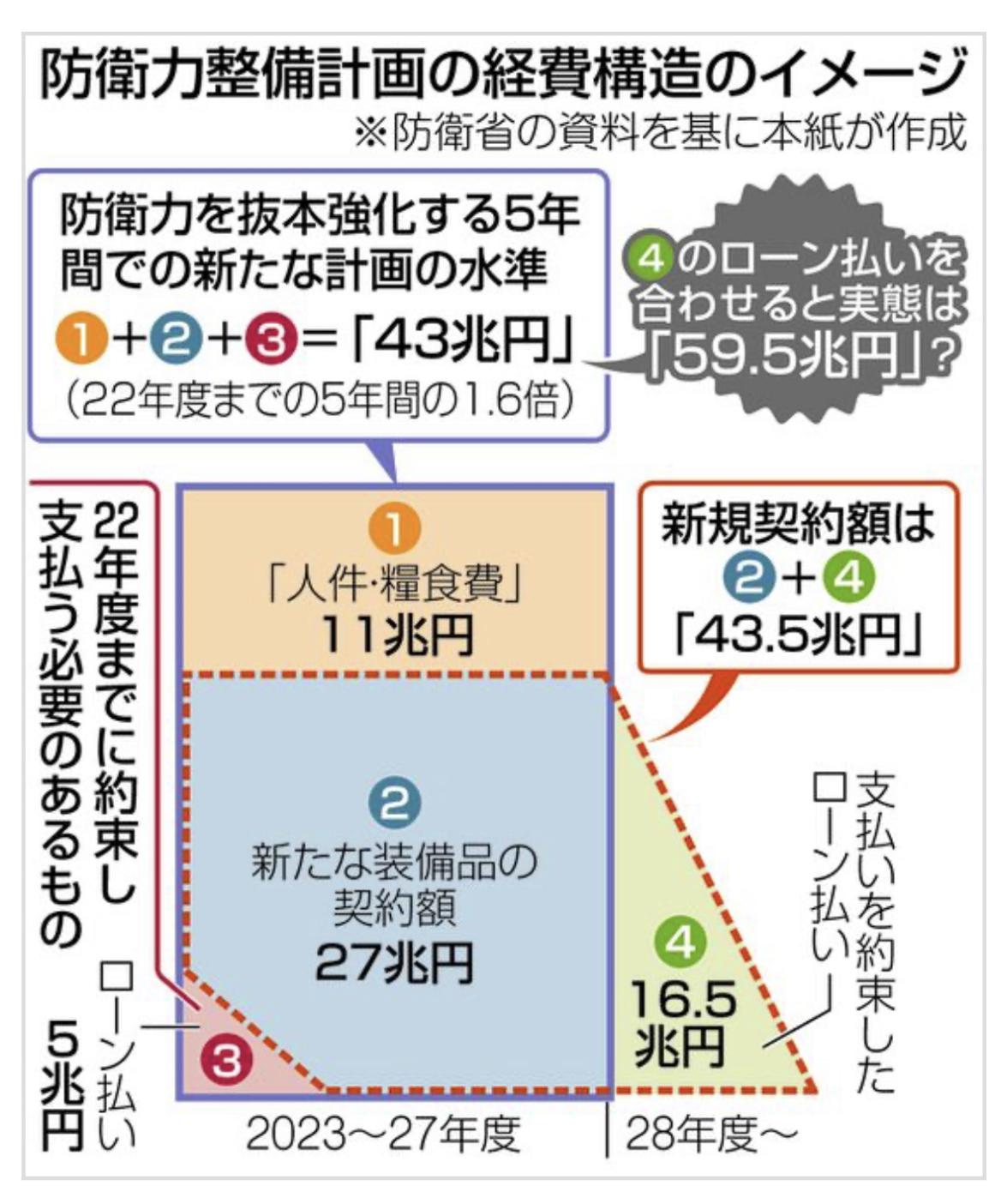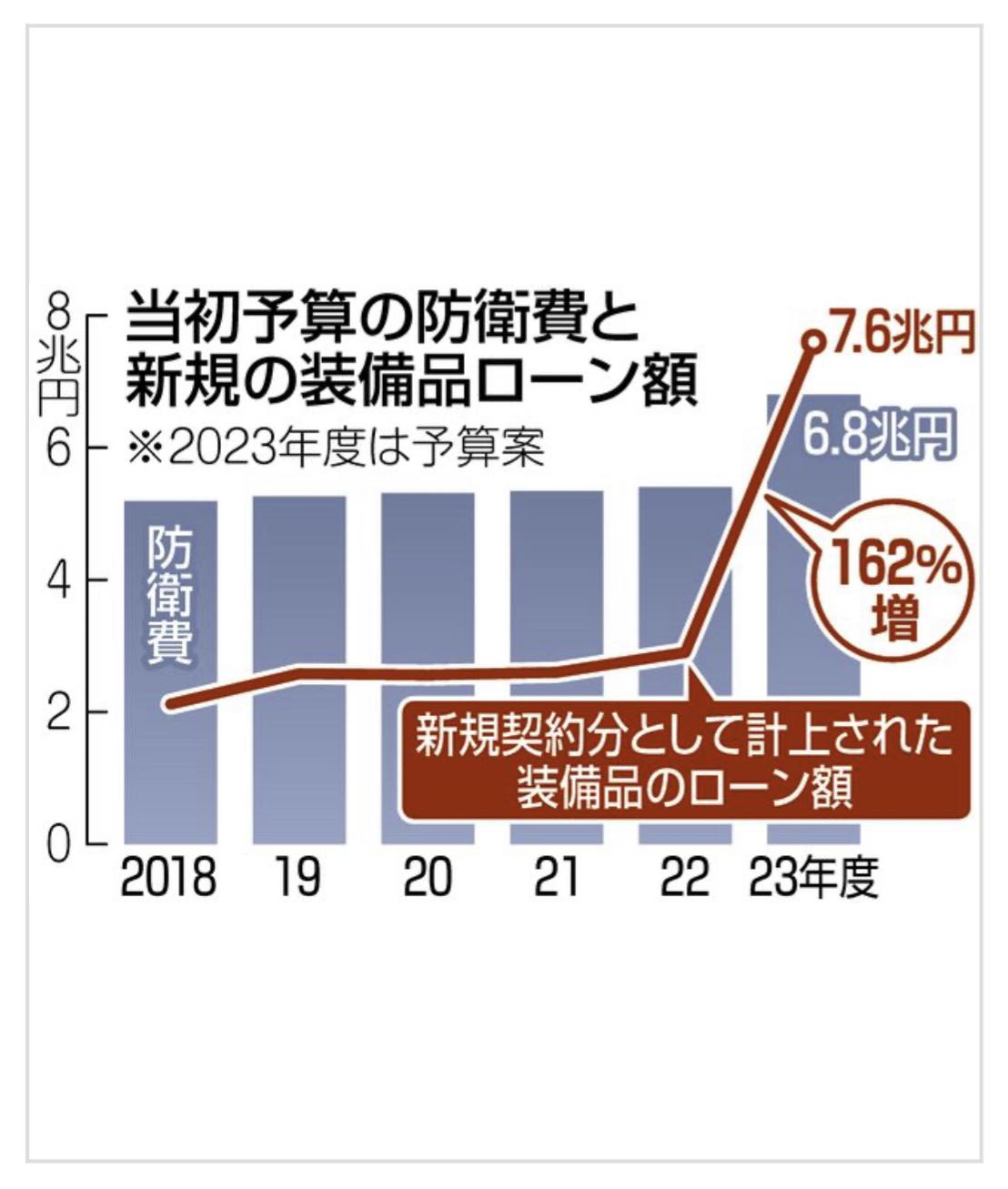 防衛省から2023年版防衛白書が報告され、中国、ロシア両軍による日本周辺での共同活動に「重大な懸念」が表明されました。中ロや北朝鮮の軍備増強を巻頭で特集し「戦後、最も厳しく複雑な安全保障環境に直面している」とのことで、27年度までの5年で約43兆円に増やされます。5年間に組む新たなローンの総額は、現計画の17兆円から43兆5000億円へ2.5倍にはね上がり、実際は60長円近くに拡張するとも言われています。