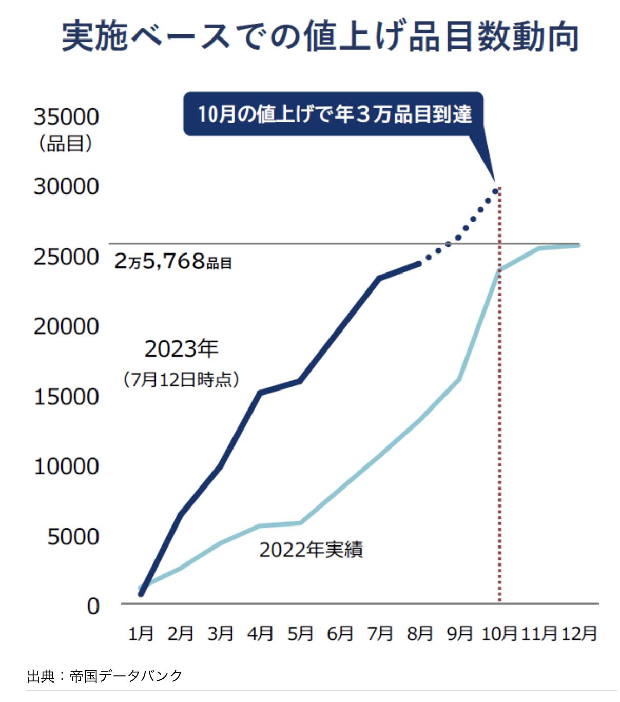 そうした中、今年7月には、2023年に値上げされる食品数が10月に過去最大 の3万品目を超えると発表されました。品目数は前年の約1.5~2倍のペースで増加しています。3万品目を超えるのはバブル崩壊以降の30年間で異例のこととも言われています。