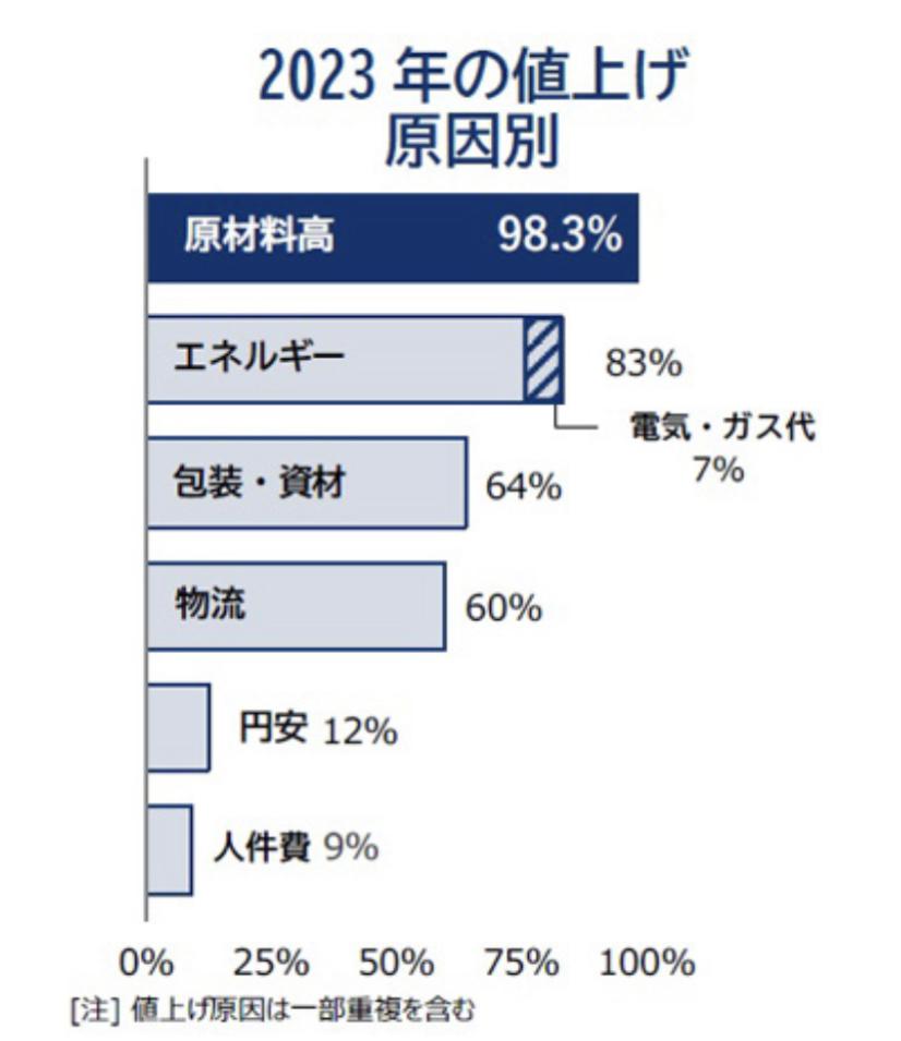 原因は原材料高騰とエネルギーが多くを占めていることから、ウクライナ戦争や経済制裁の影響が大きいと考えられます。