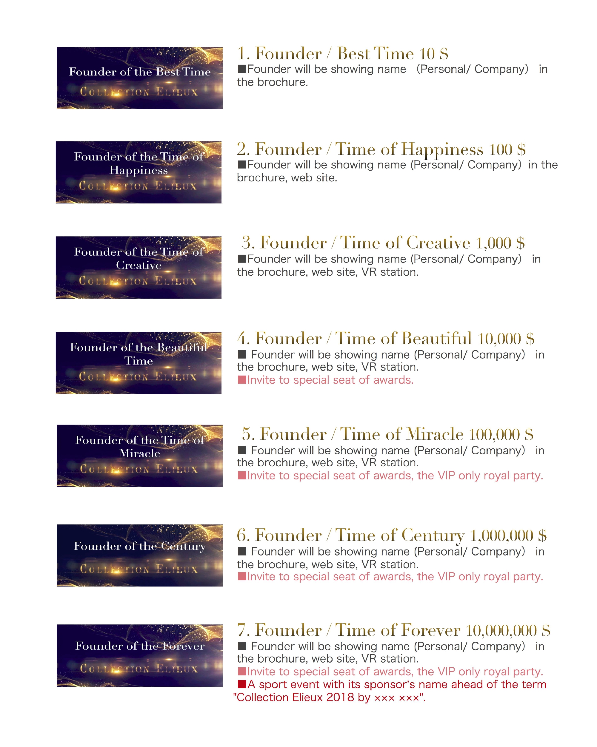 We will honor those who contributed the most to the foundation of the award (the donors) by including the names of the individuals and companies in the event titles.
