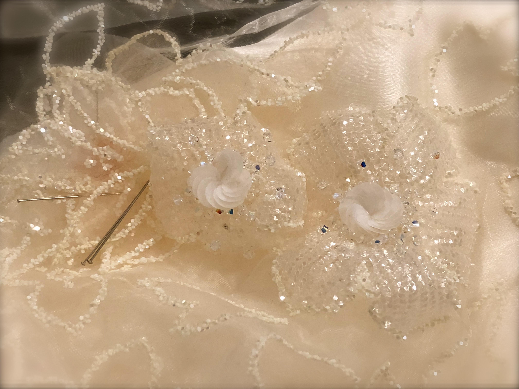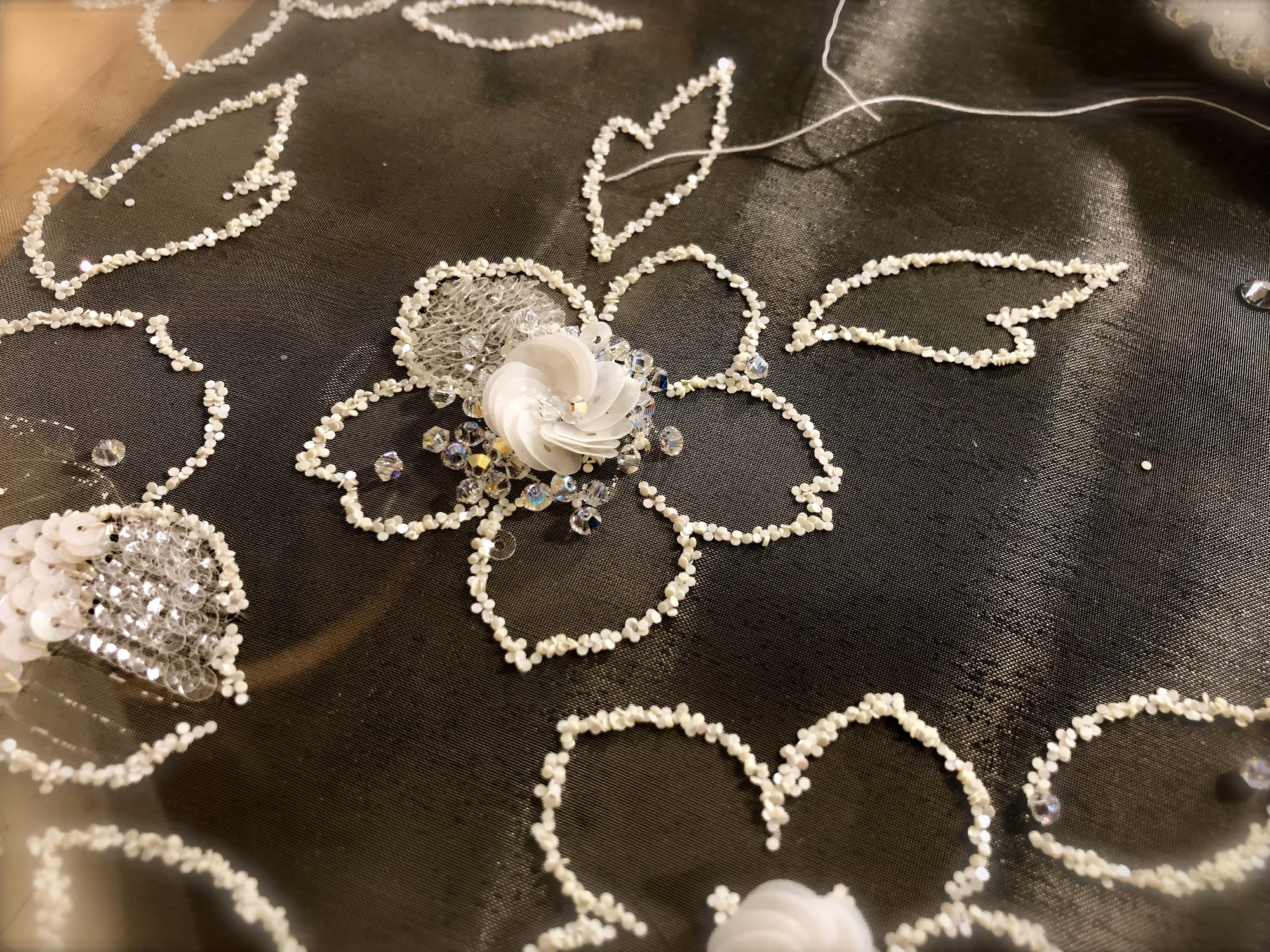 スペシャリストコースでは、それぞれの課題に取り組みました。応用課題でスパンコール刺繡のドレス制作に挑戦された方のドレスが完成しました。キラキラした柔らかな透明感の中に夢が詰まっているようです。胸元に何種類かの大小のスパンコール刺繡をしたドレス→
