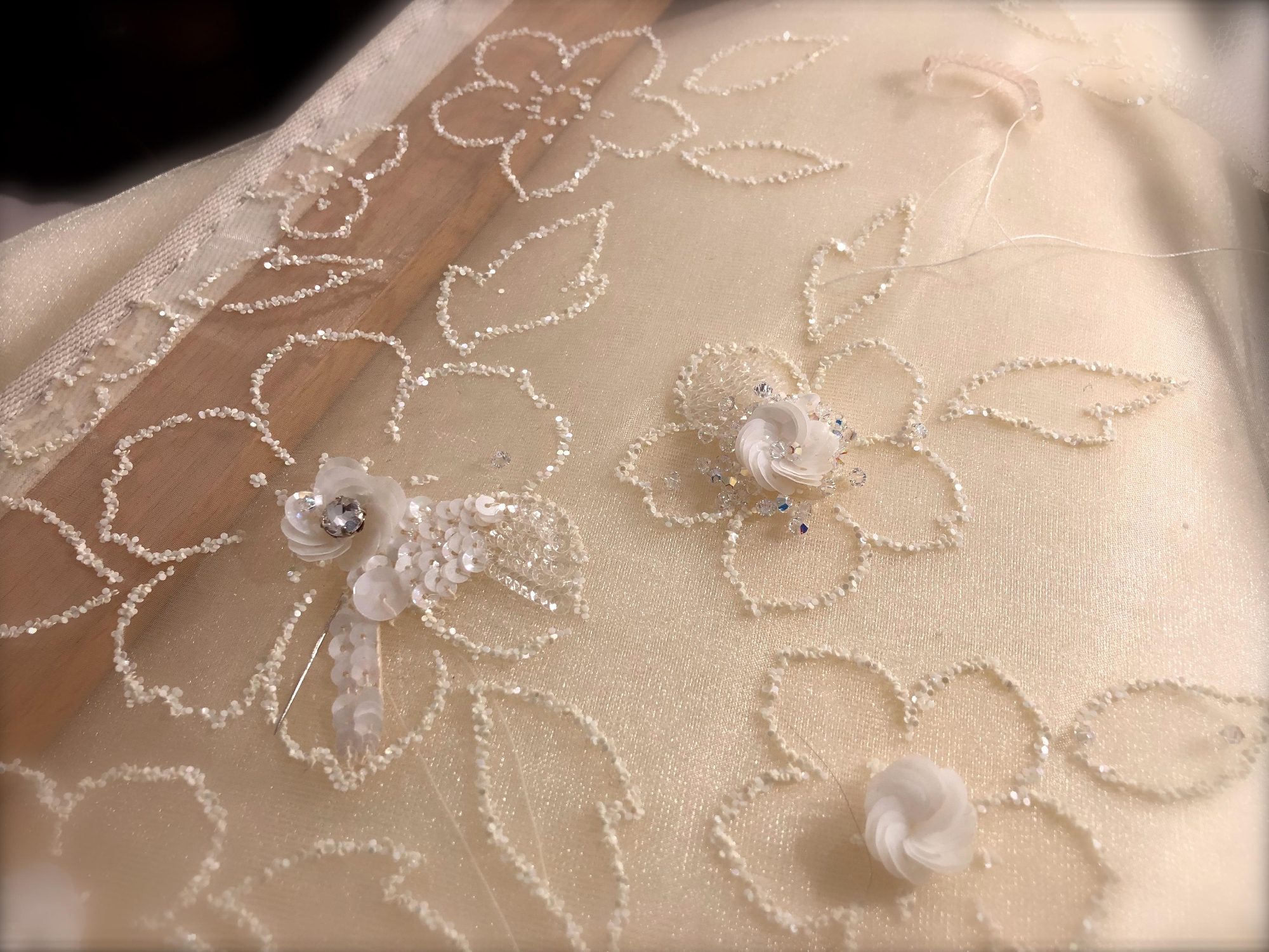 ドレスを仕 立てるとき、そこにあしらうビーズやスパンコールは、わずかな違いの色彩や、0.数㎜単位のサイズ、光沢感の種類といった、微妙なニュアンスを見ていきま す。いくつもの試作を作り、その中から光るものを紡ぎ出していくような仕事。それは、「技術」が単なる物体を形成していく一工程なのではなく、心でイメー ジしたものをより豊かに魅力的に形にしていくエッセンスに満ちている事を思い知らされます。そこには、その創り手にしか出来ない、それでいて無限の可能性 に満ちた創造の瞬間が凝縮されています。