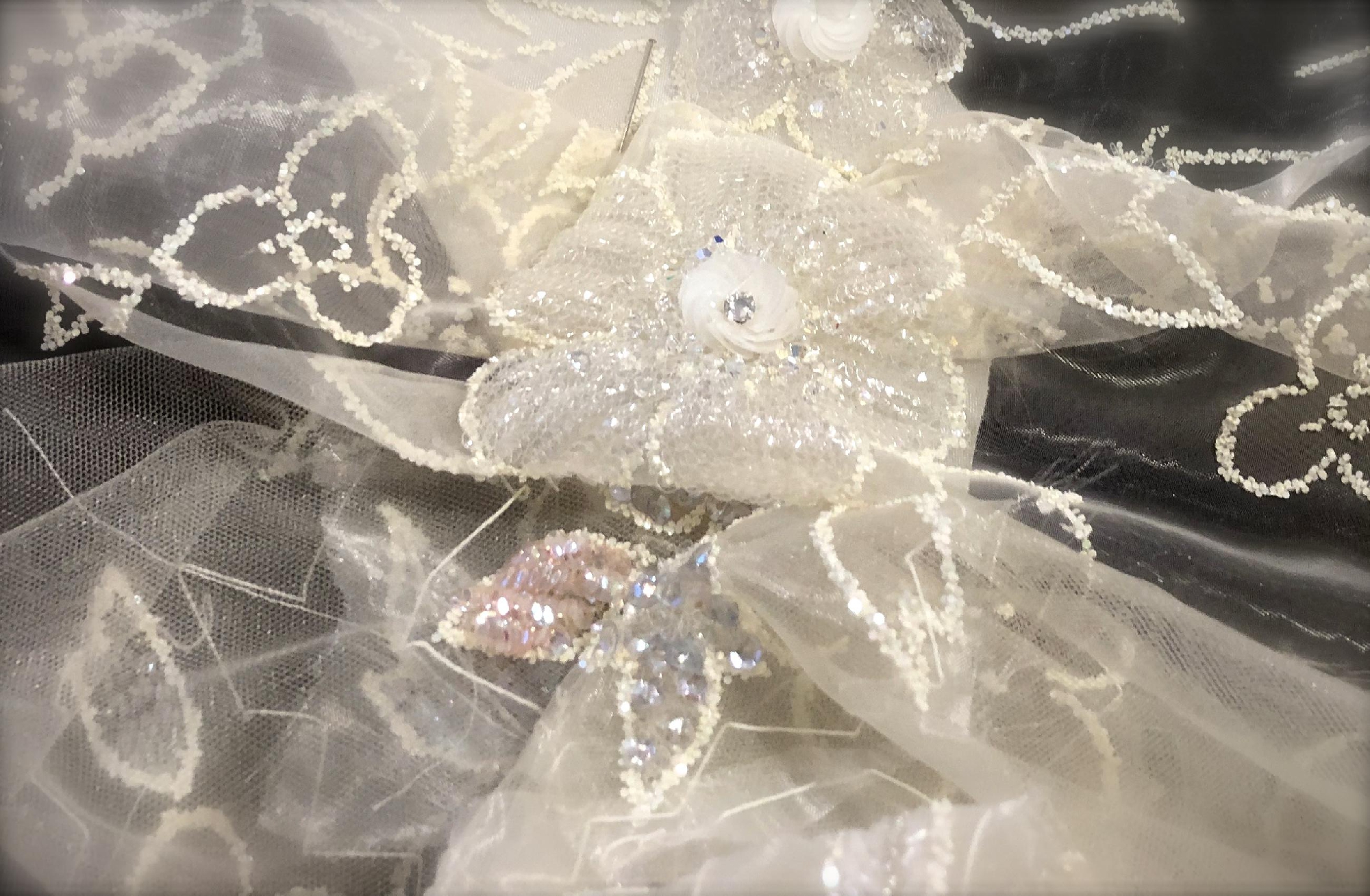 スペシャリストコースでは、それぞれの課題に取り組みました。応用課題でスパンコール刺繡のドレス制作に挑戦された方のドレスが完成しました。キラキラした柔らかな透明感の中に夢が詰まっているようです。胸元に何種類かの大小のスパンコール刺繡をしたドレス→