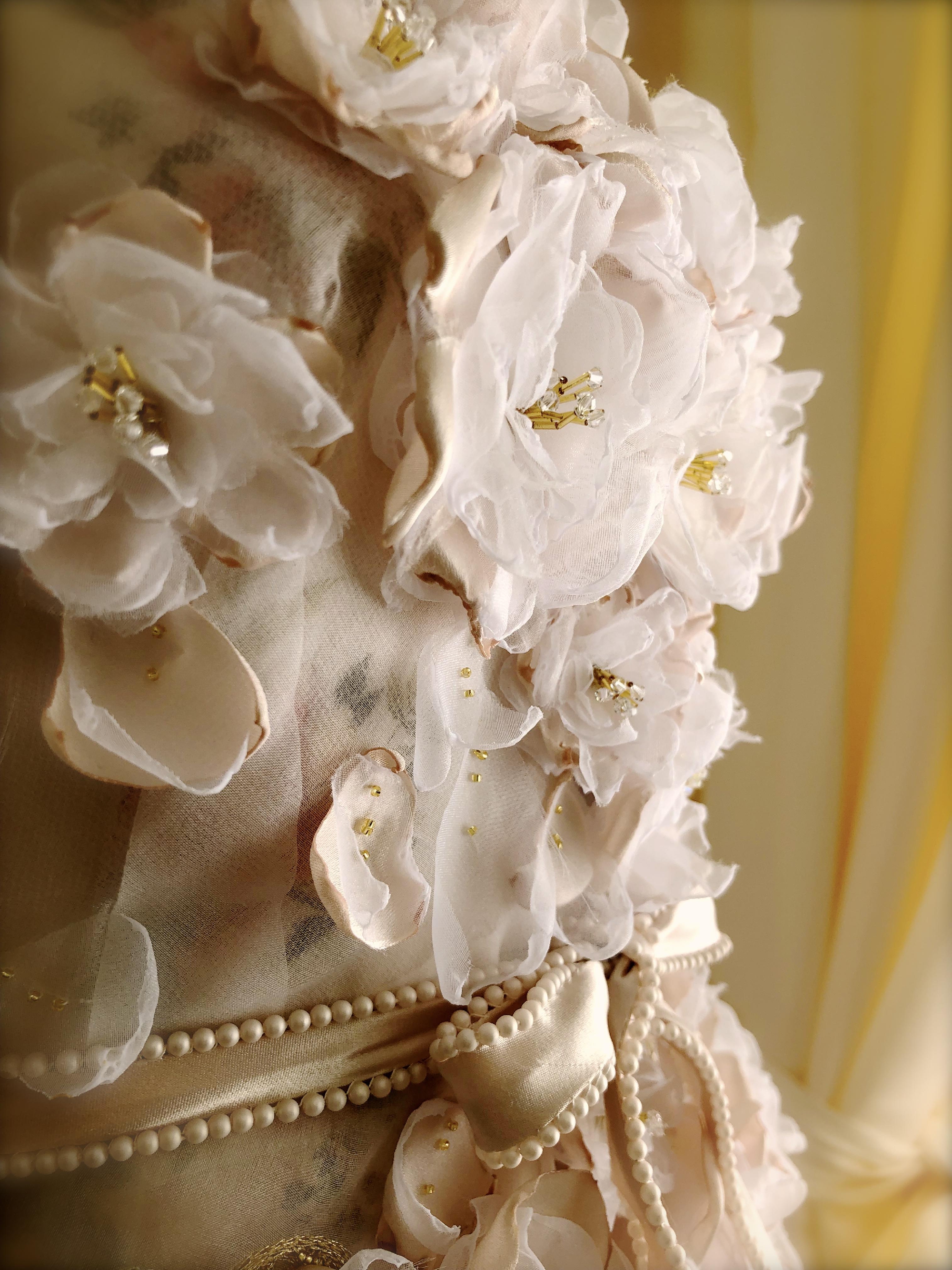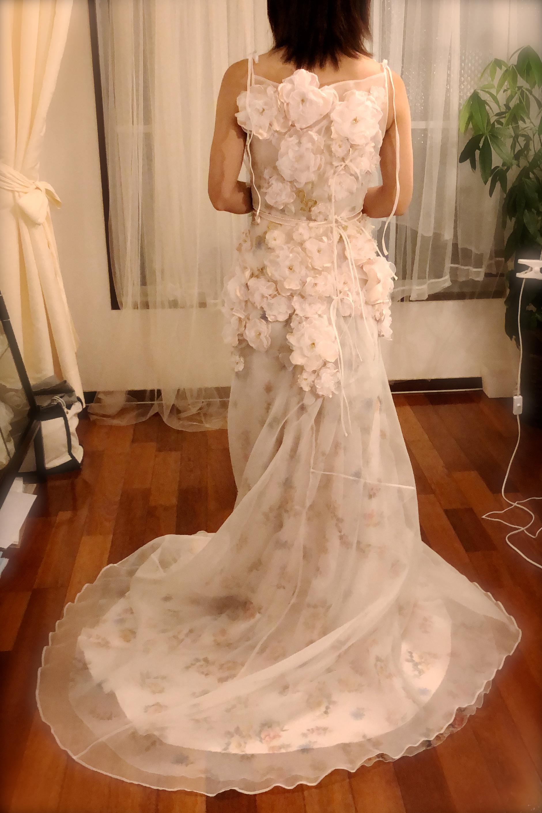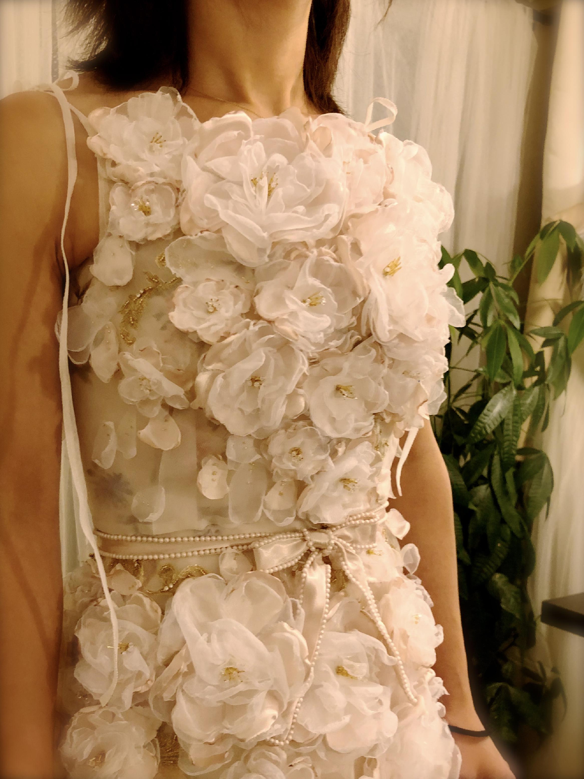 オートクチュールスペシャルコースでは、いよいよ期日となりドレスが完成しました。透明感のある立体的な花のモチーフが、一杯に咲きみだれるインナーと花のアウターの2wayドレスです。所々に金の刺繡もちりばめられ、生き生きとした作品に仕上がりました。