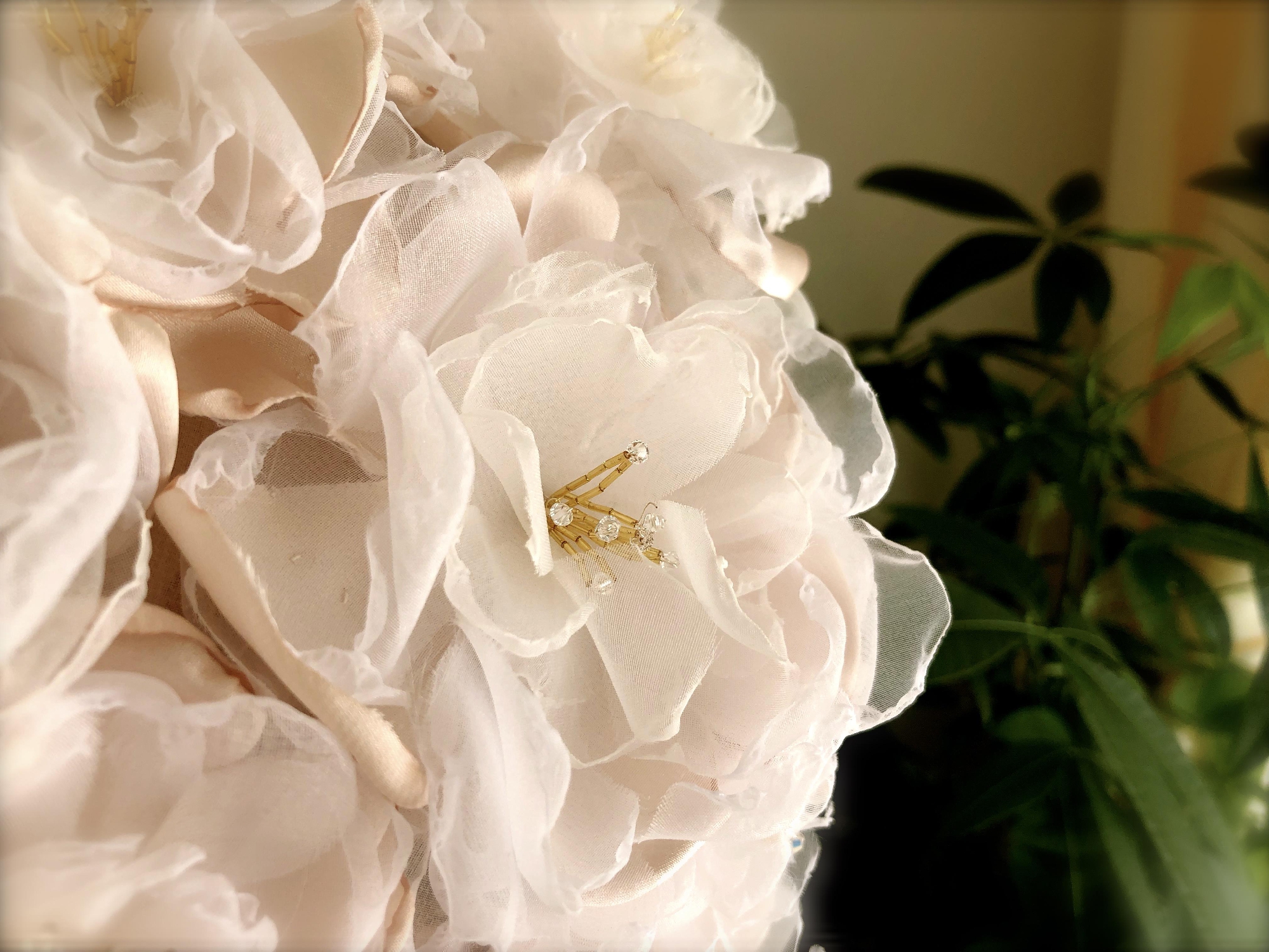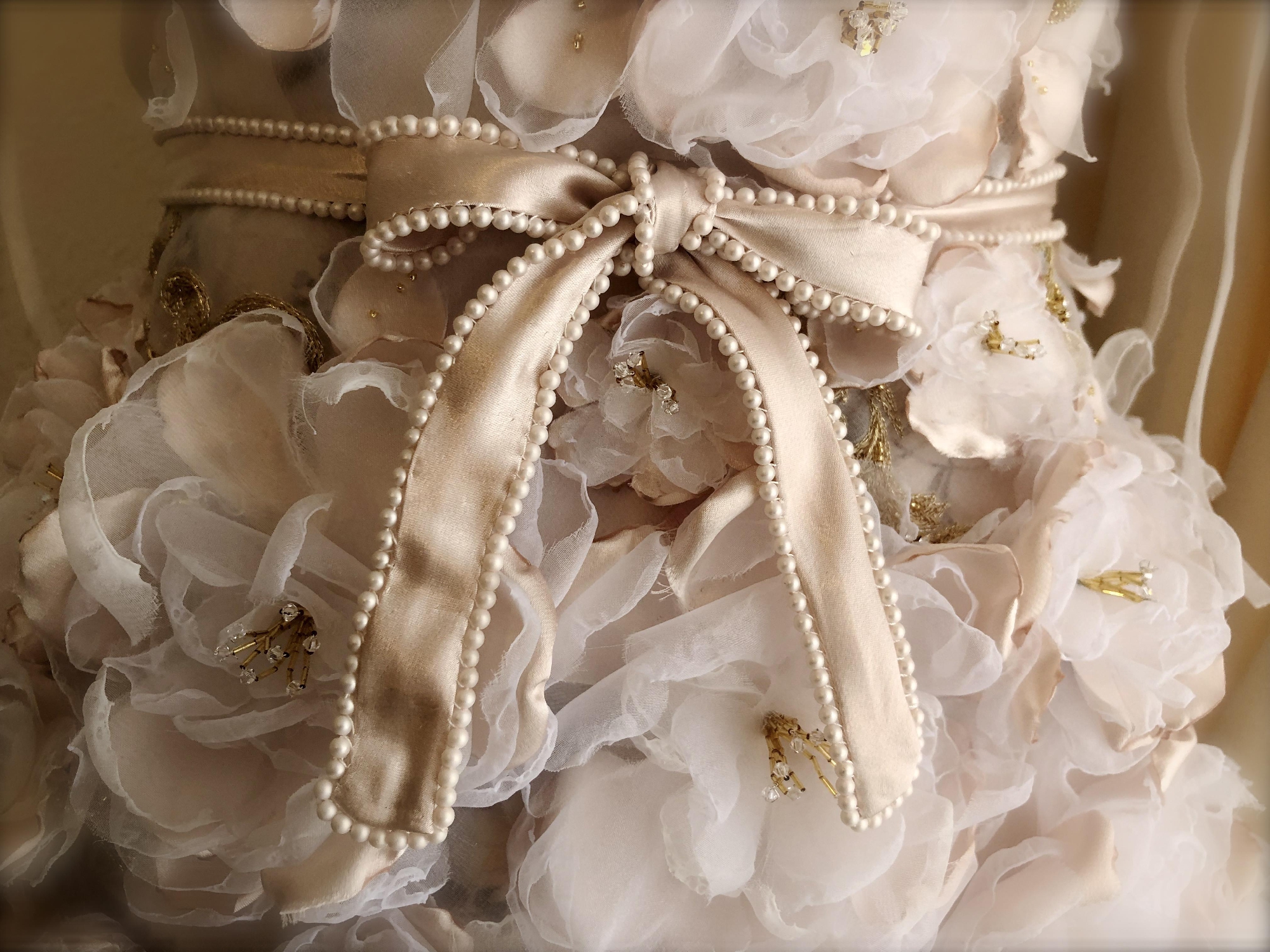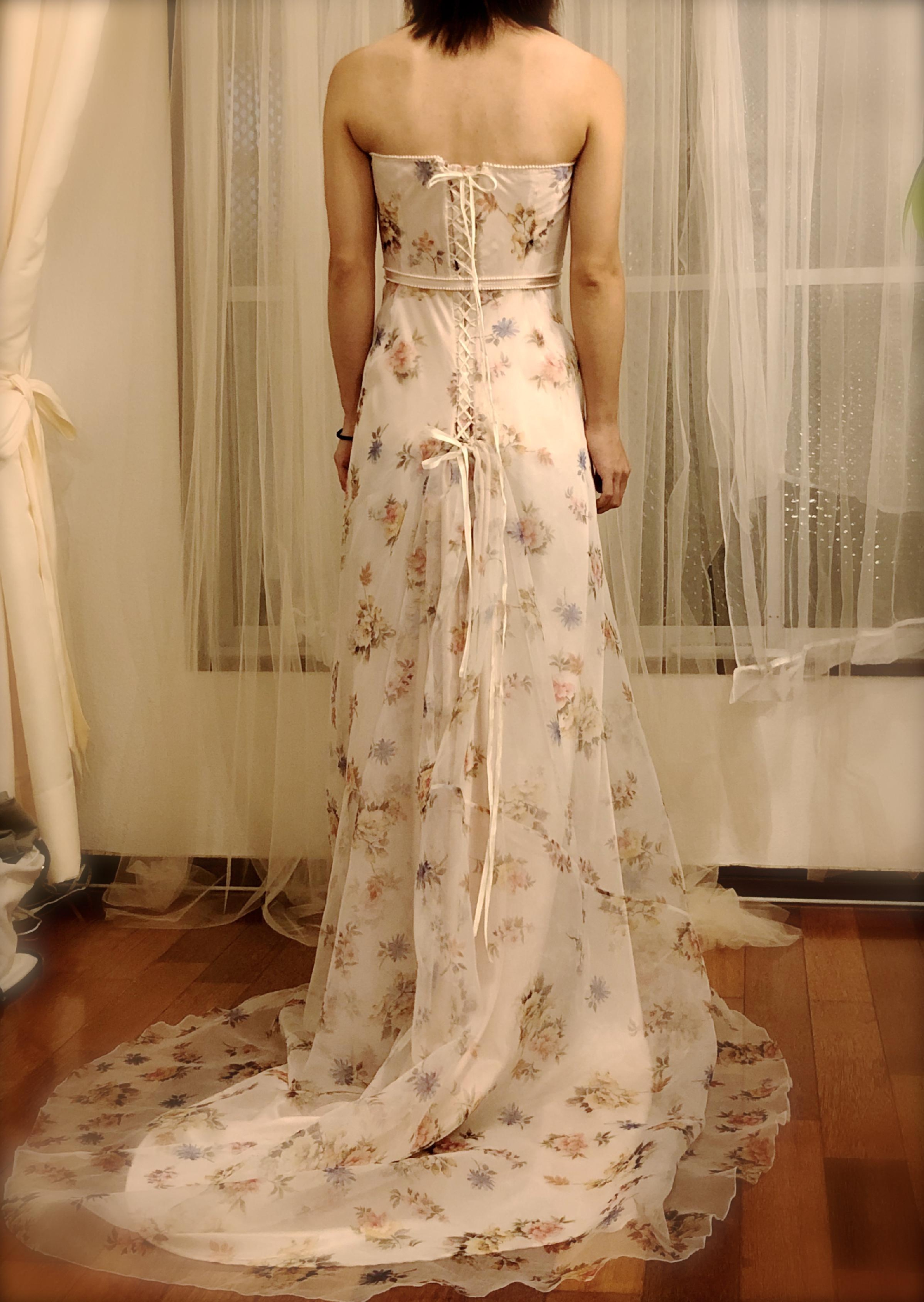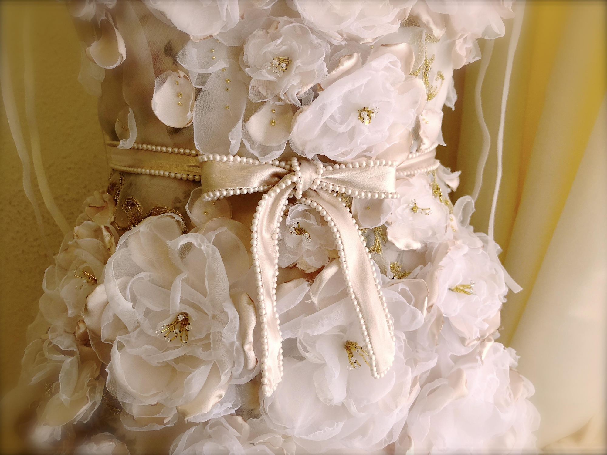 オートクチュールスペシャルコースでは、いよいよ期日となりドレスが完成しました。透明感のある立体的な花のモチーフが、一杯に咲きみだれるインナーと花のアウターの2wayドレスです。所々に金の刺繡もちりばめられ、生き生きとした作品に仕上がりました。