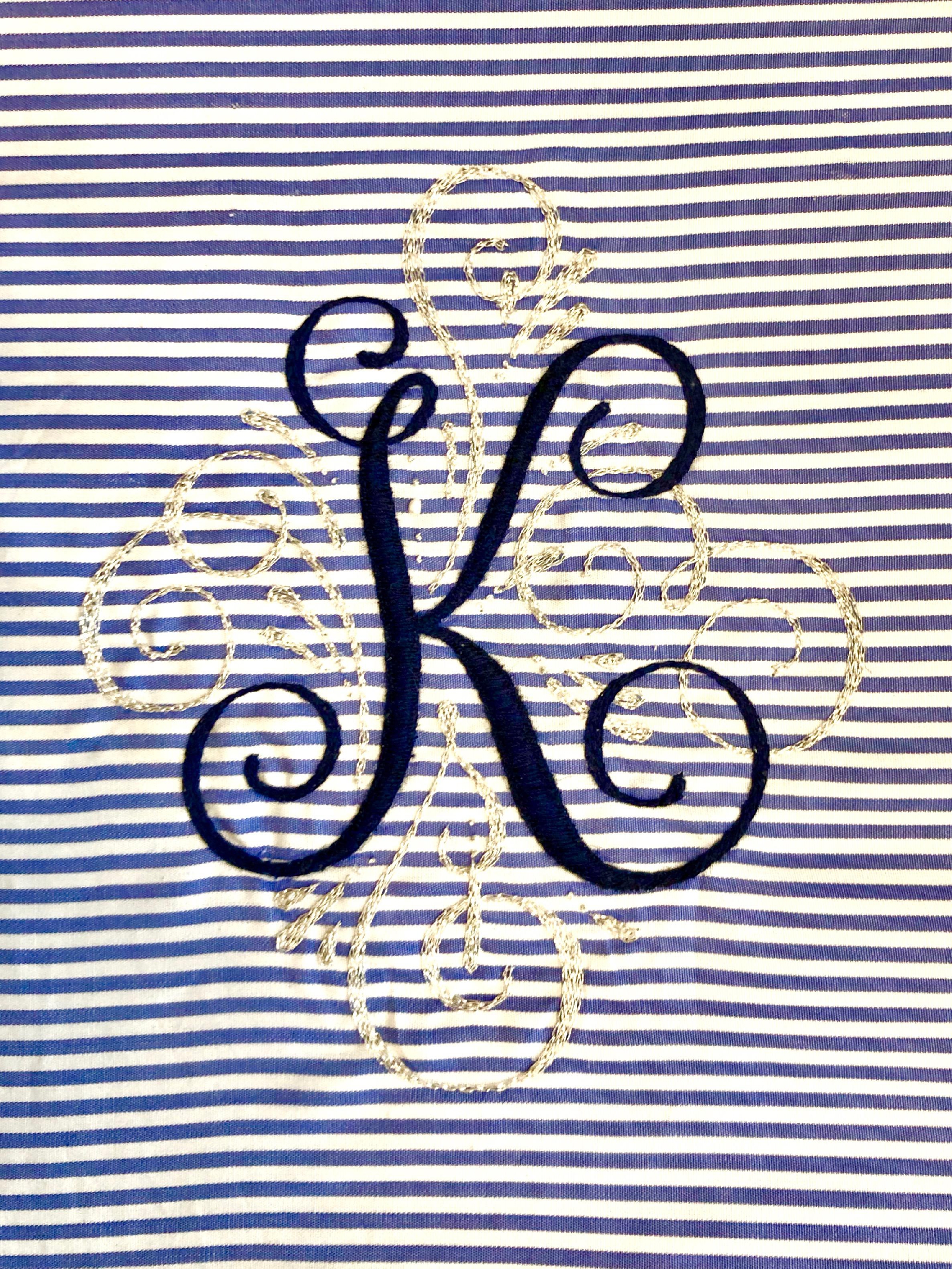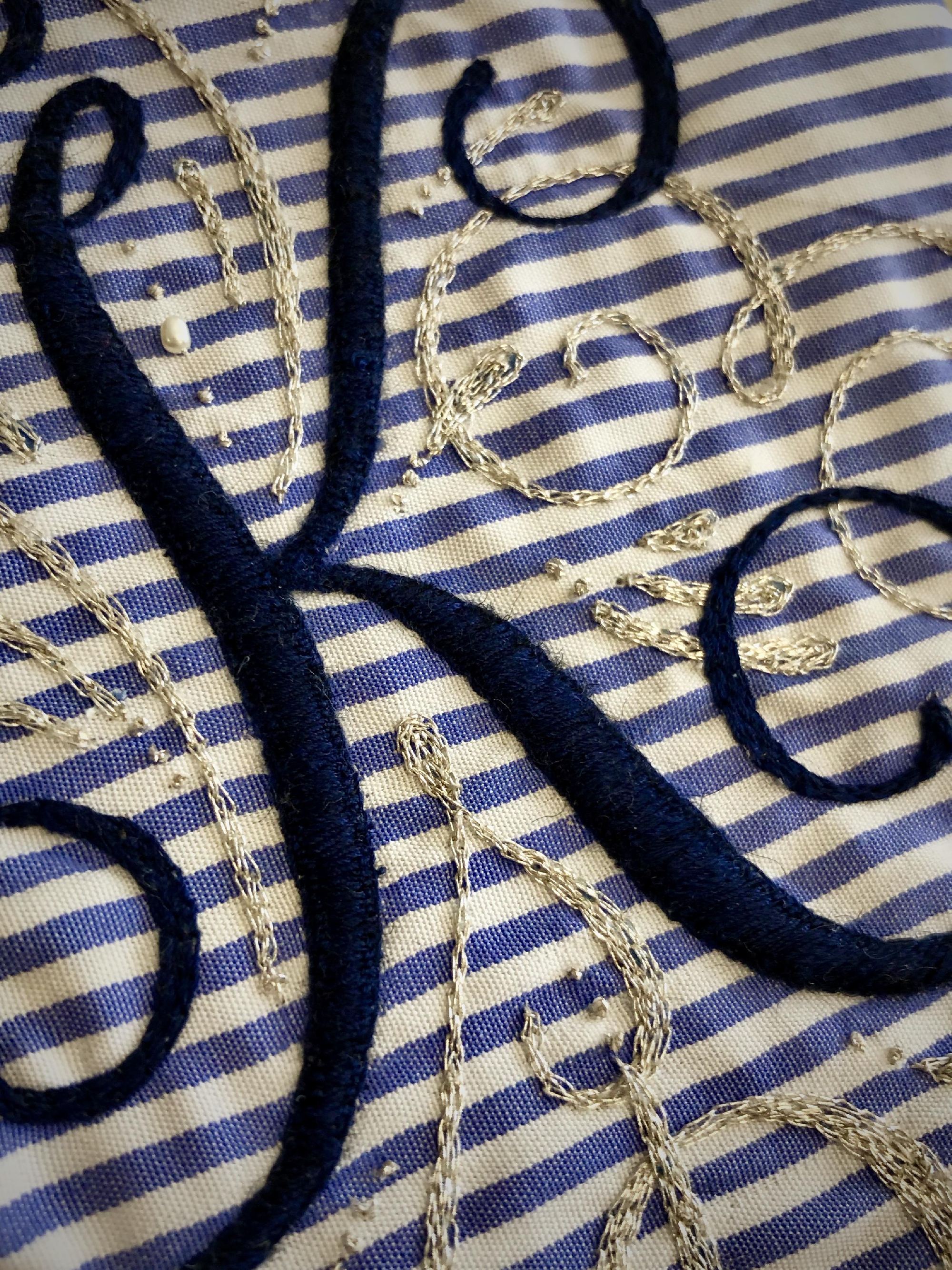 そしてイニシャルの刺繍も完成されました。この横方向のステッチで綺麗なラインに仕上げるのは難しいですが、やり直ししながらも美しいラインで仕上げる技術を身につけていかれました。生地の雰囲気と溶け合った素敵な作品が完成しました。この課題は素材や糸は自分で選びますが、センスも感じられる作品になりました。