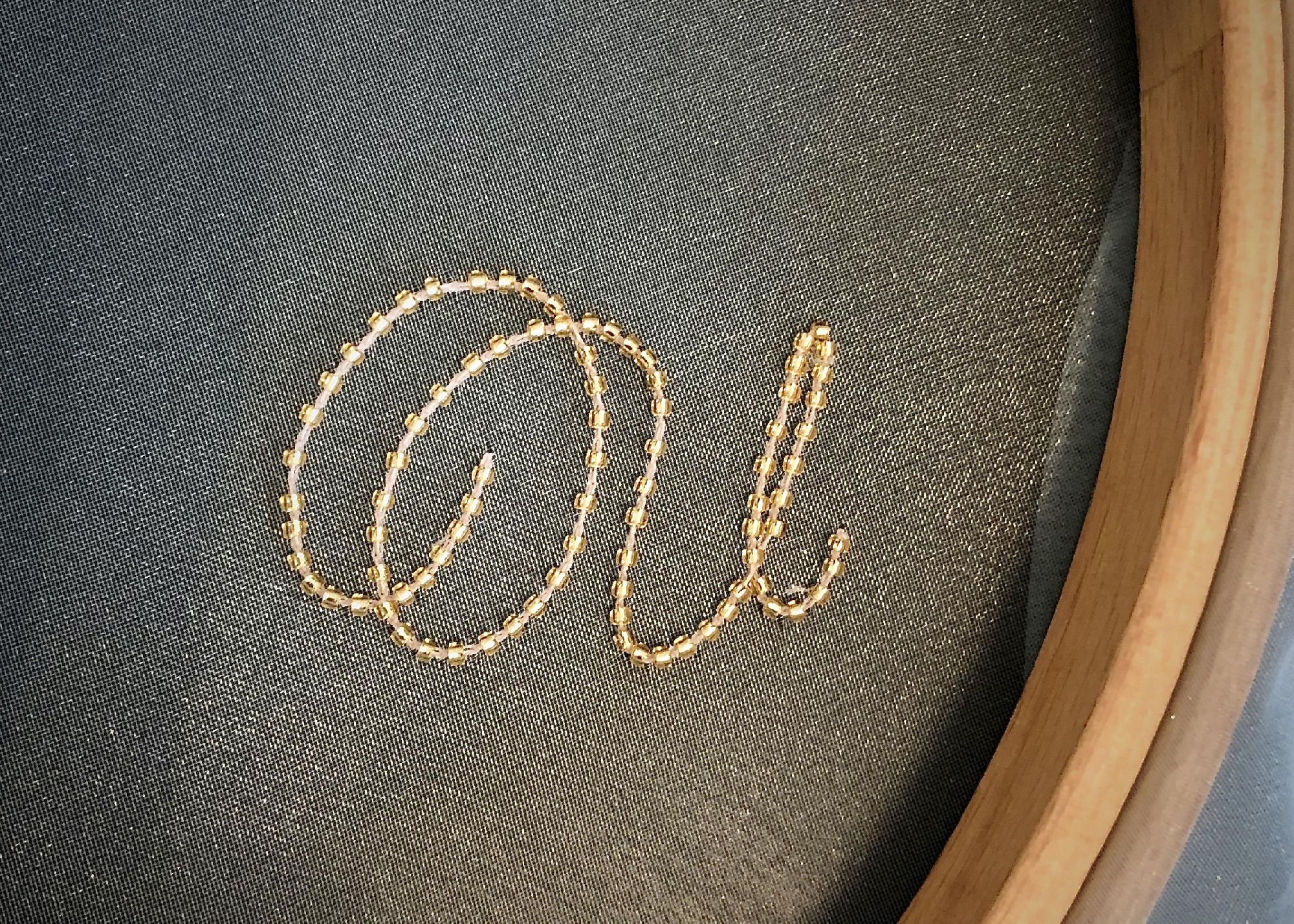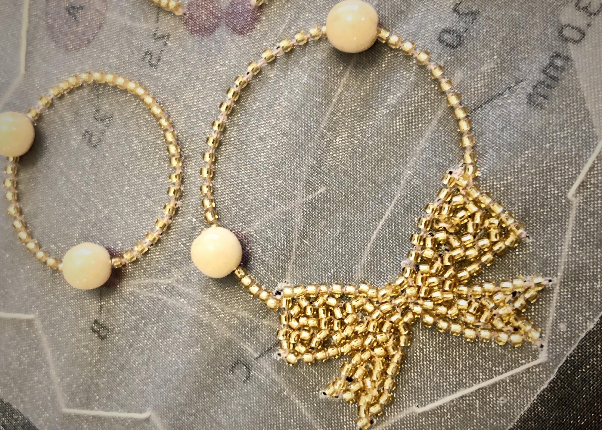 ビーズ刺繍は、右手の針の引き上げだけでなく、左手でもビーズを送っていかなければならないため、慣れるまでは大変ですが、繰り返していきますと自然に両手が絶妙なタイミングで流れていくようになります。以下の写真はまず基本課題で、丁寧に美しいカーブのラインを描かれました。
