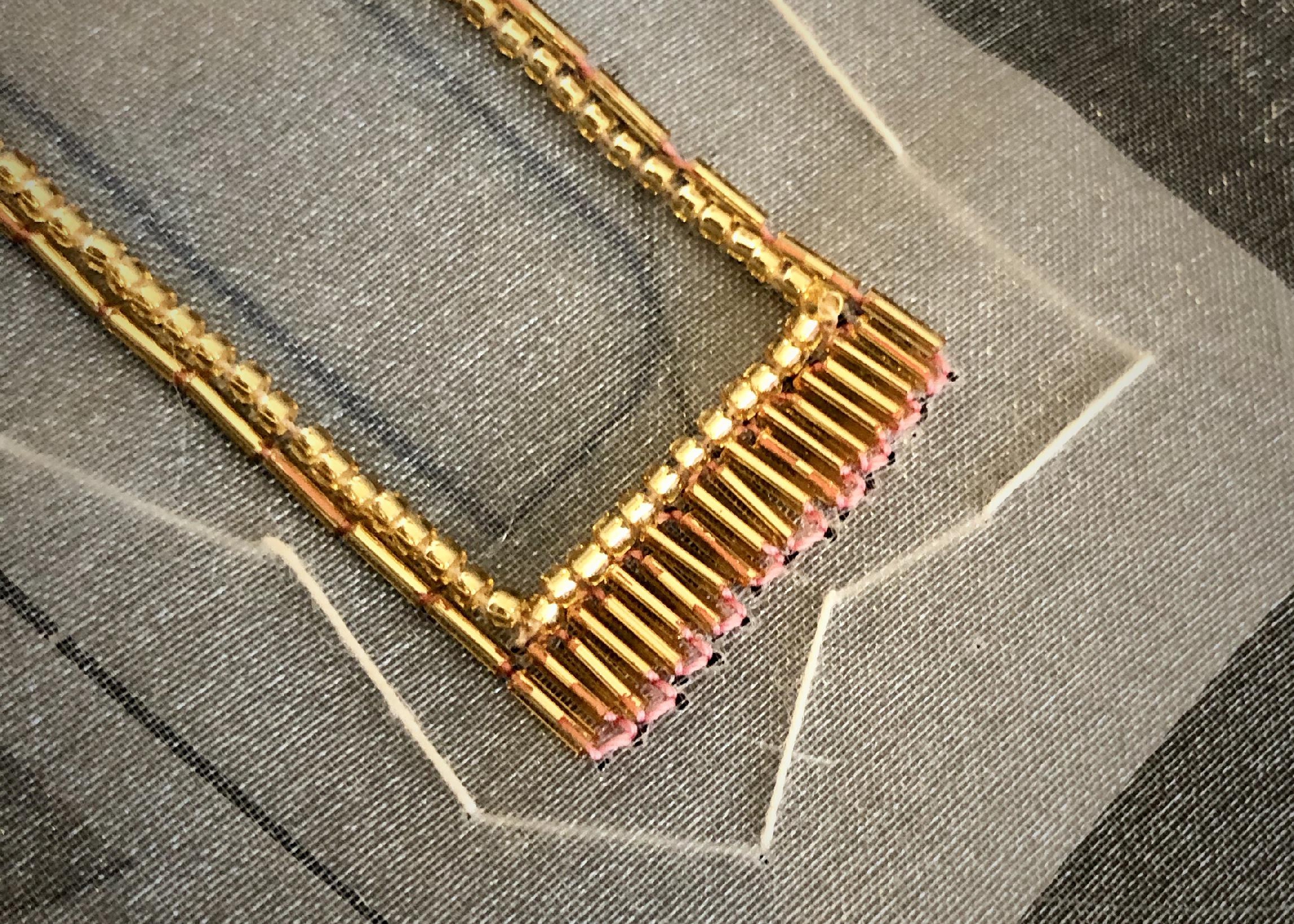 次の写真は竹ビーズを並べていくステッチです。等間隔で揃えていく難しさもありますが、ビーズの大きさがかすかに違うのでそれを考慮しながら、柄端の針を刺していく位置を一定にしていくことで、見え方が変わってきます。