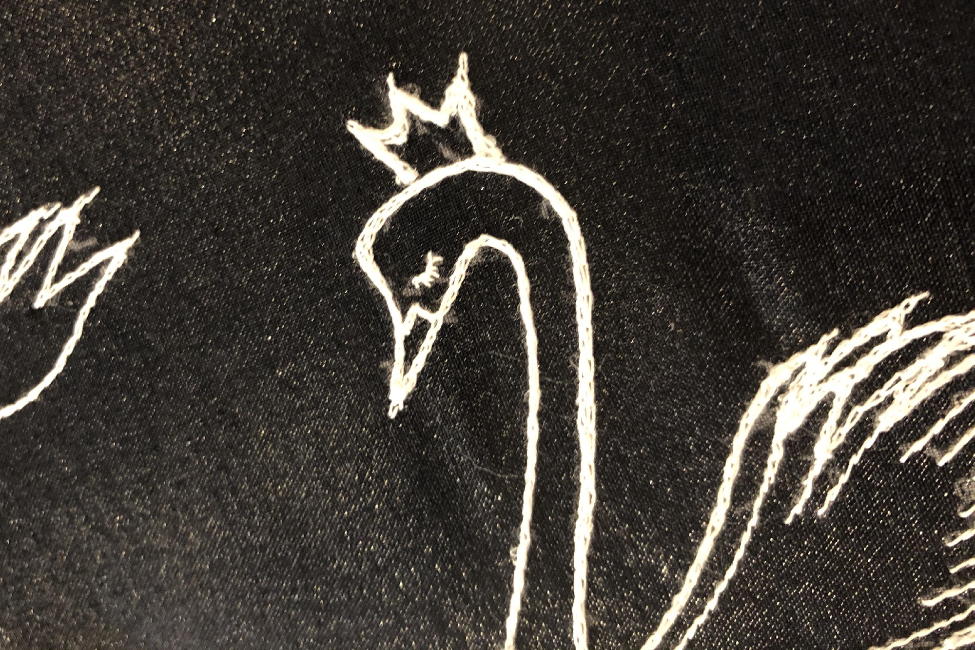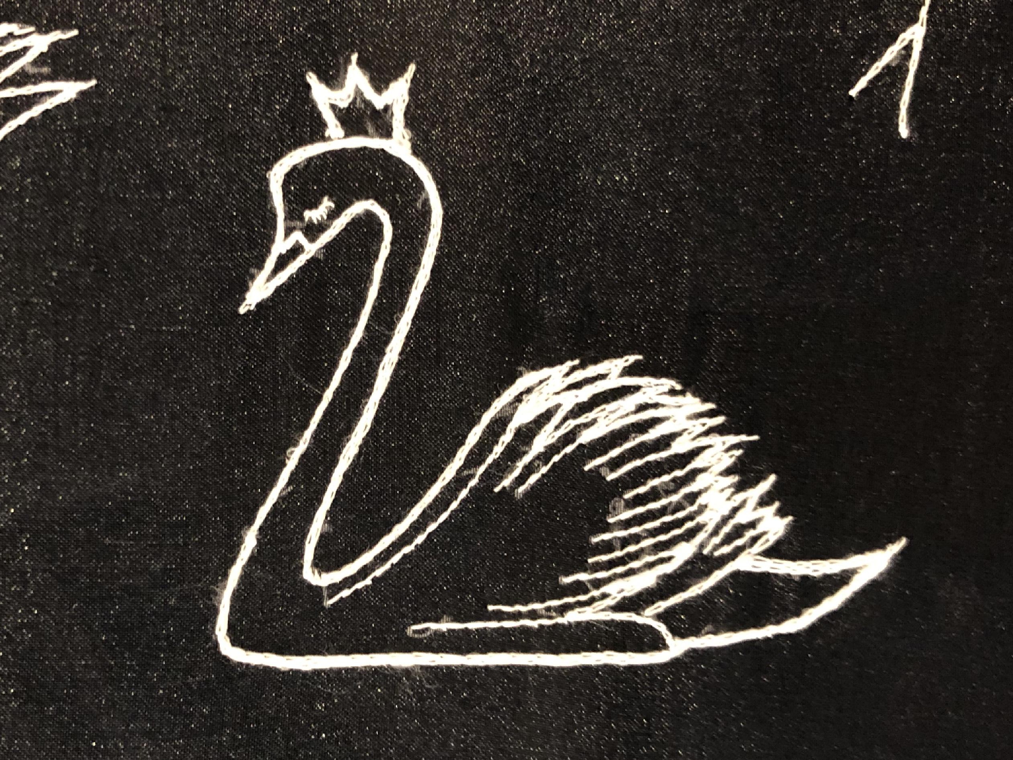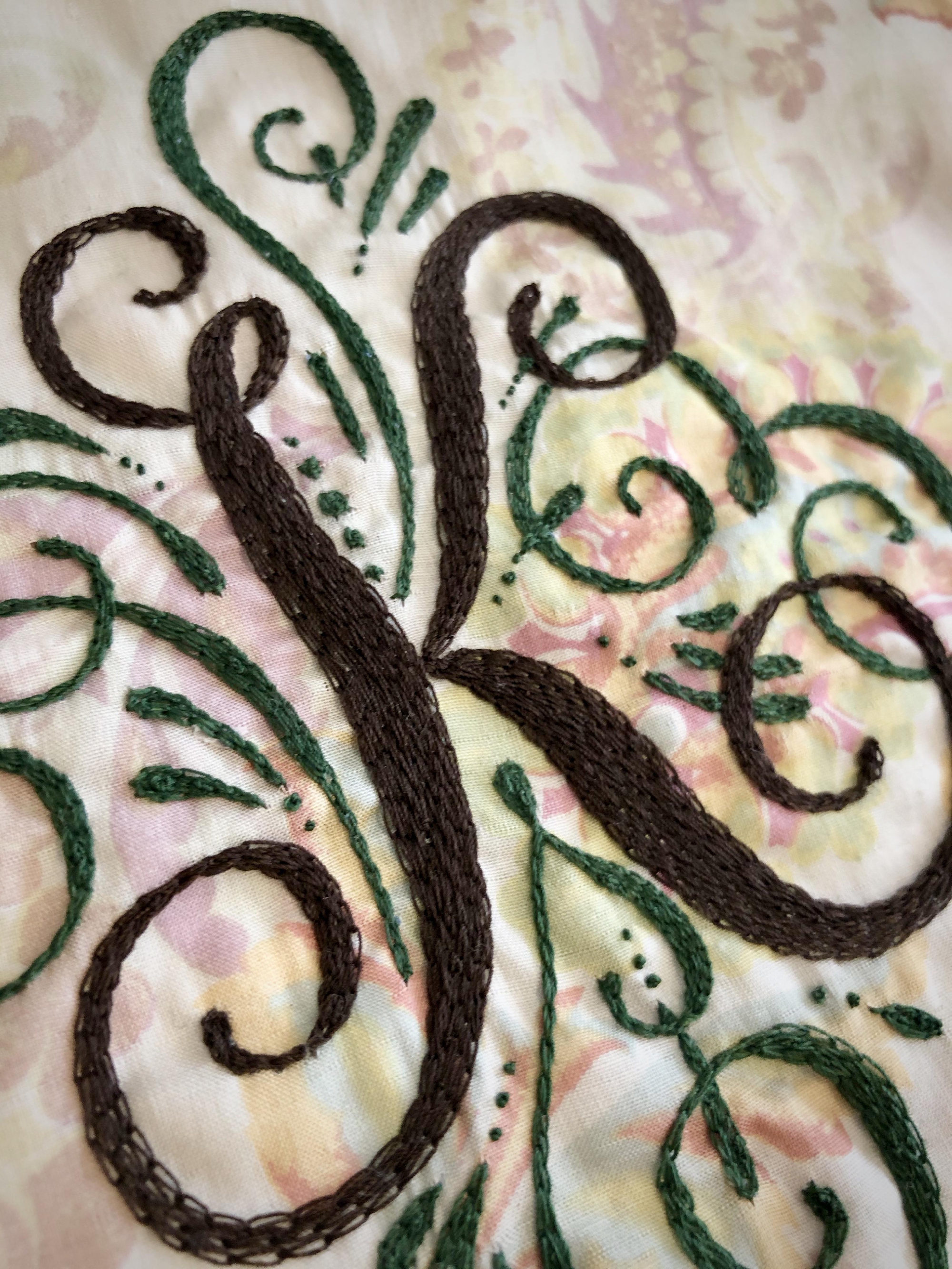スワンの刺繍を終えられた方々は、かなり糸の引き上げがスムーズになってきました。繊細な部分の刺繍の仕上げで作品のインプレッション(印象)が変わってきます。針が生地に引っかかることもなくなってきています。糸始末は手間もかかりますが、数もこなされしっかり身につけられました。次のイニシャルの刺繍も、それぞれの方の個性が感じられるデザインになり、これからが楽しみです。まずは輪郭を丁寧に埋めていきシートを外していきましょう。