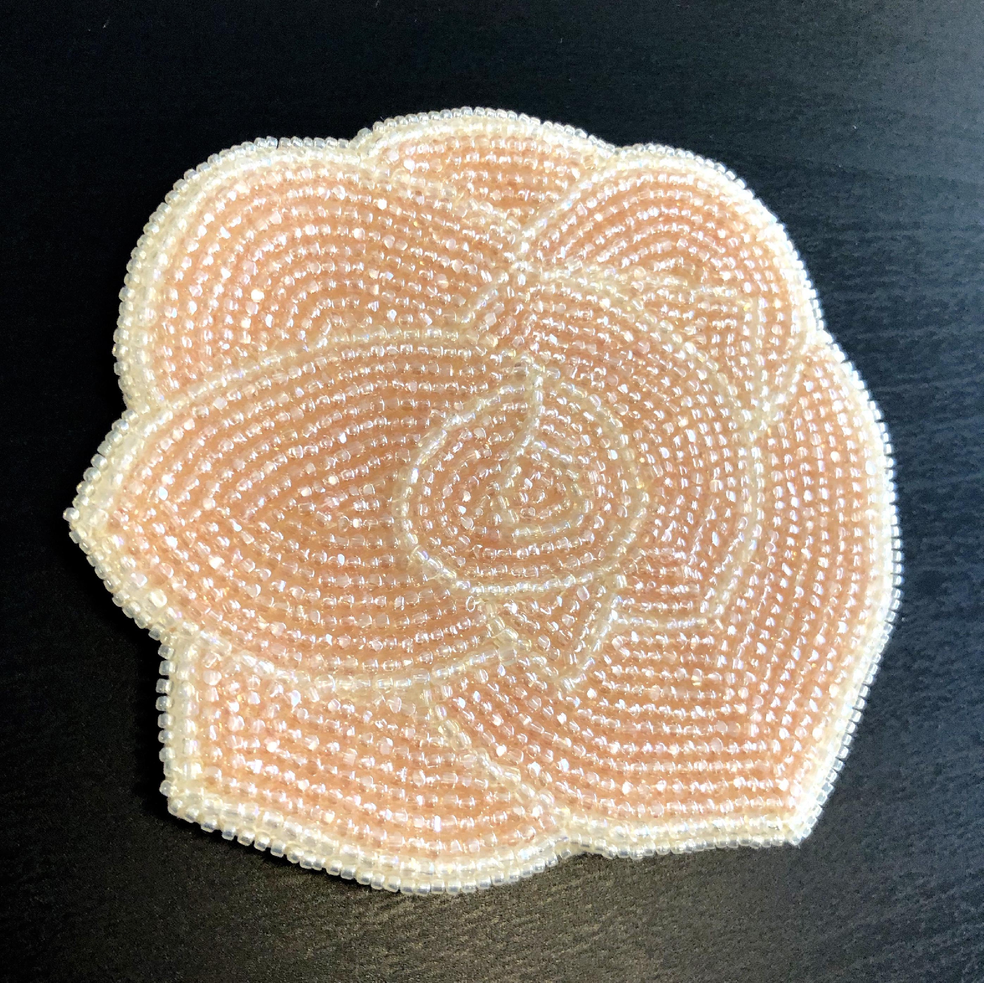 練習を兼ねて作られたビーズ刺繍のコースターは、少しビーズの寄りすぎた箇所を気にされていましたが、少しビーズの間隔にゆとりを持たせると解消されます。柔らかさと透明感のある美しい仕上がりになりました。素敵ですね!