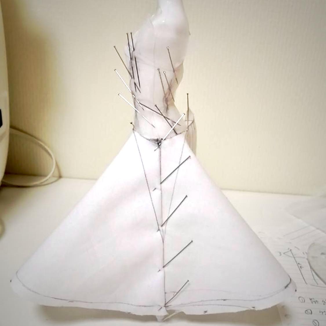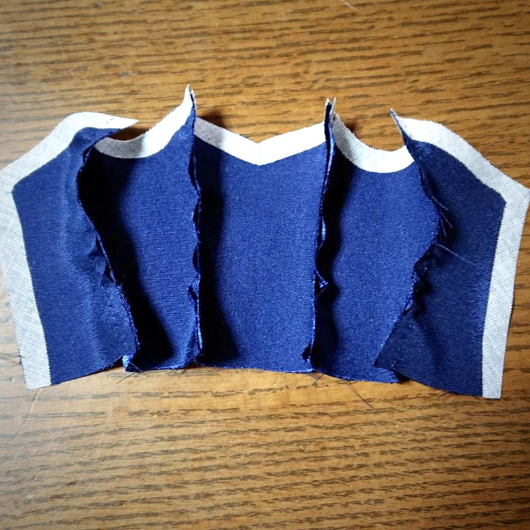 1パーツ1パーツの縫い合わせやステッチの縫い上がり寸法はズレないよう注意をはらいます。そうずる事でボーンを入れた時にボーンがねじれたりせず、しっかりと表地の刺繍やドレープなどを支えます。何度かやり直しもありましたが、その分さらに美しい仕上がりになりつつあります。