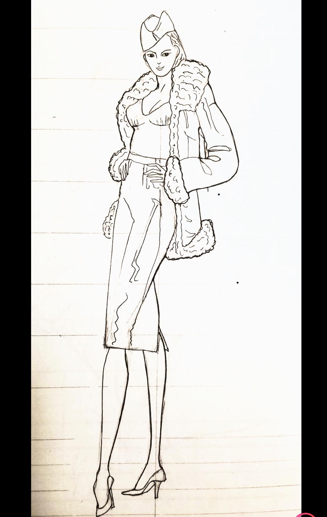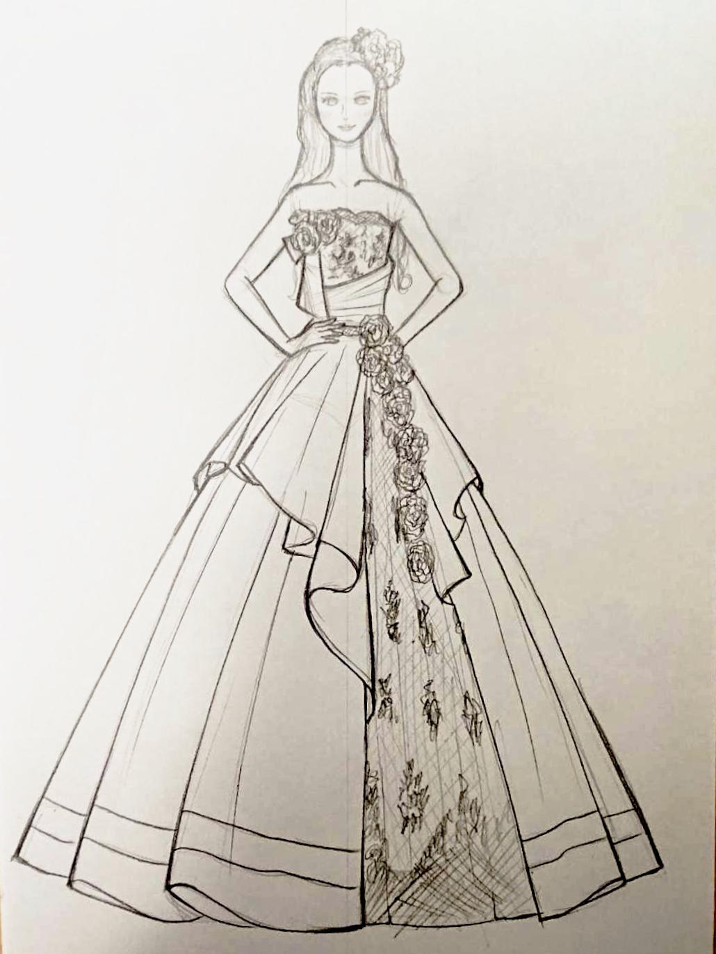 デザイン画のレッスンは選択制となっています。今のクラスでは、全員の方が受講されていらっしゃり、初めてデザイン画を書いたという方も多いですが、毎日少しずつ練習を重ね、着々を変化されています。刺繍と同じで、針で糸を引き上げていくことに慣れると、とても楽になりますが、デザイン画も手がラインやバランスの感覚を掴んでいくと、自由自在に表現の幅が広がっていきます。こちらは写真でご紹介します。