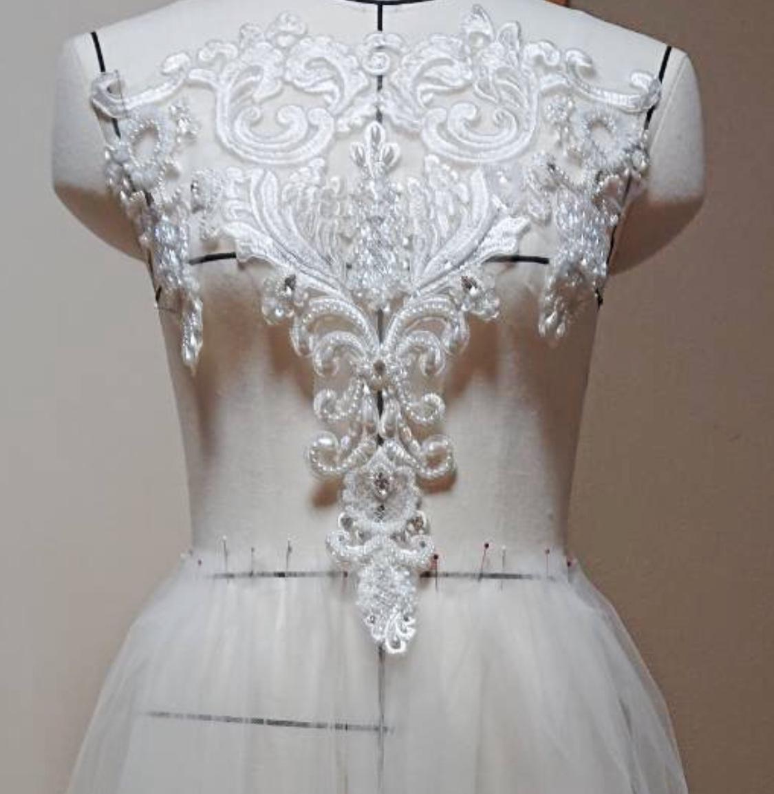 レースへの刺繍は針さばきが難しくレースの繊維を引っ掛けないように刺していく必要があります。スパンコールやビーズのわずかな角度によって表現される立体的な美観が輝いていきます。