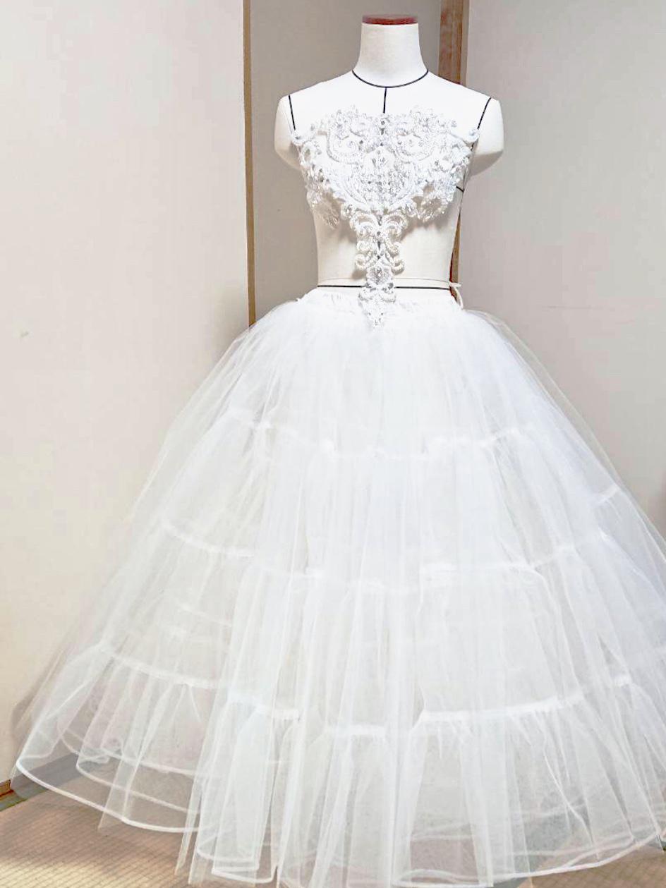 ホワイトドレスは様々なパーツのレースへの刺繍が施され、生き生きとした美しさが煌きます。その迫力に負けないボリュームのパニエは、刺繍に負けないほど多くの時間と手仕事を必要としました。ギャザーを寄せる作業だけでも100メートル以上の長さがあり、チュールは1反以上使用しました。