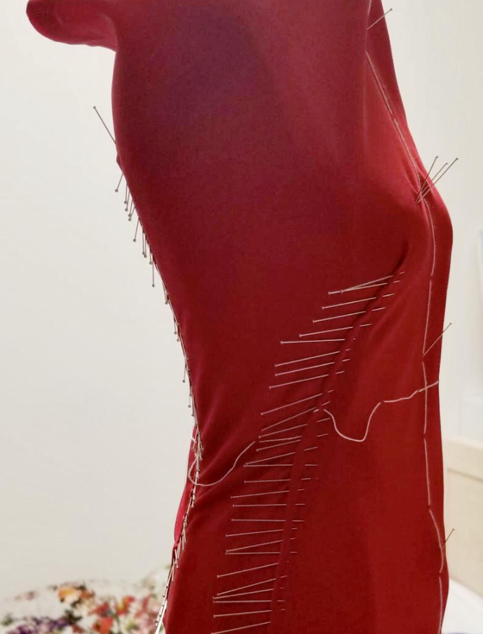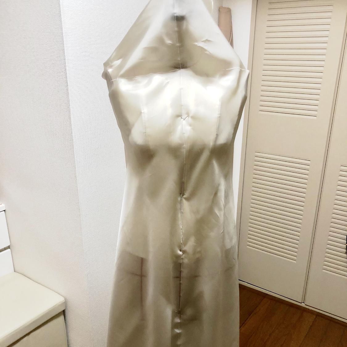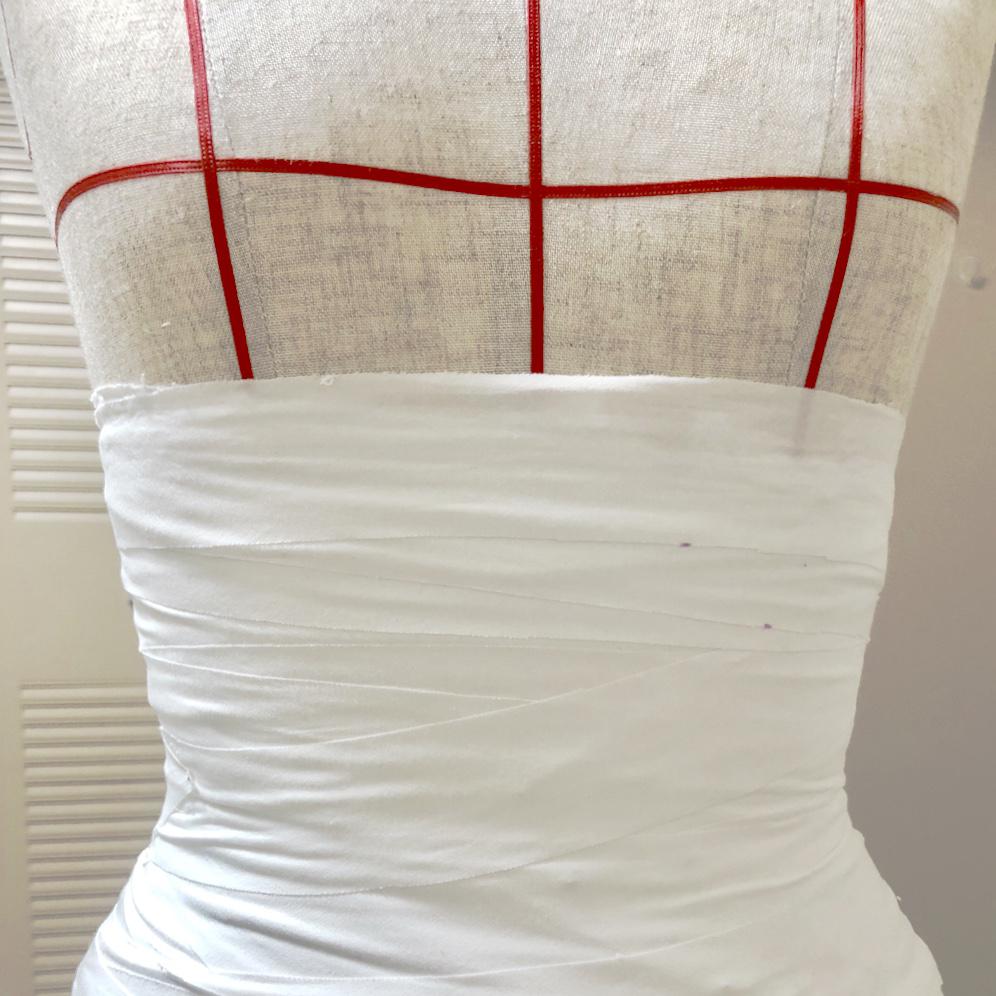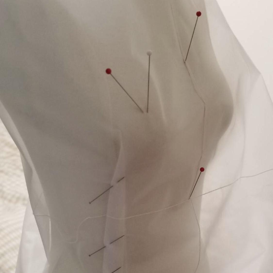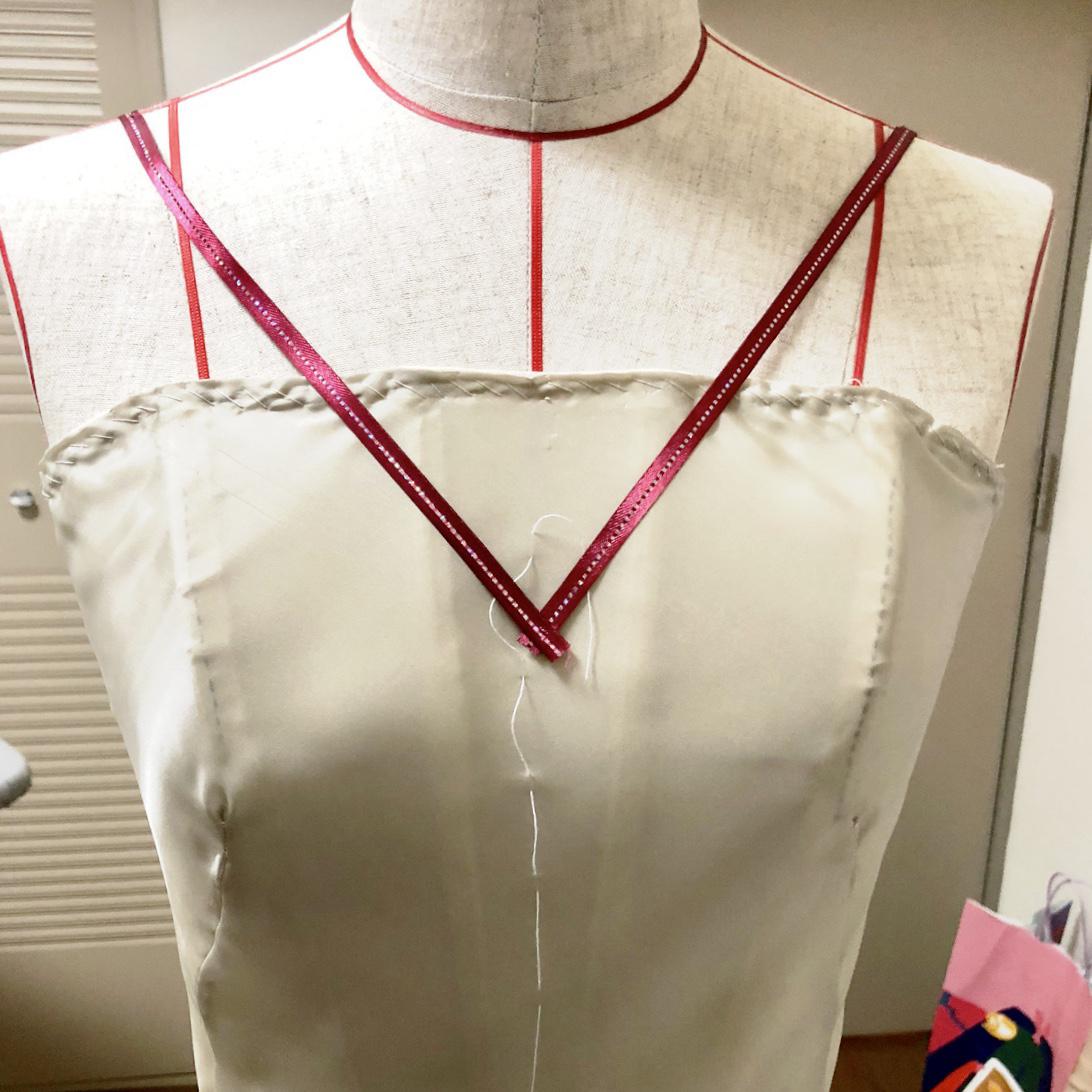 一点ものドレスで体型がデザインやシルエットに影響するドレスは、ドレーピングのボディラインも修正が必要です。人が着用した状態でドレーピングをするのがベストですが。自分のものを作る場合はそういう訳にもいきません。バイアス状にカットした布を巻きつけ、修正して整えていきました。ドレーピングも進み、3枚のオーガンジーが重なり合うニュアンスのあるデザインは、形になっていくのが楽しみです。