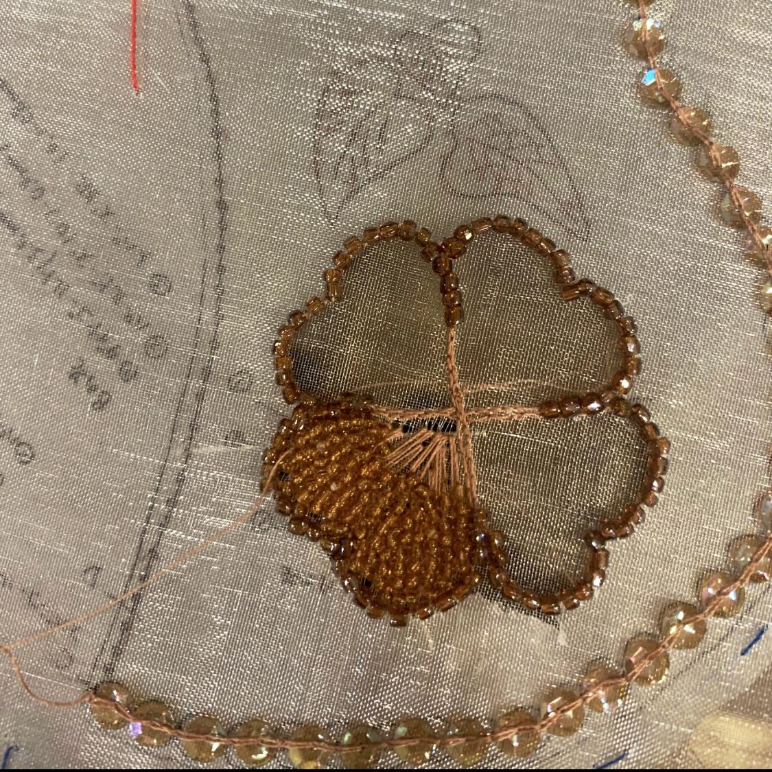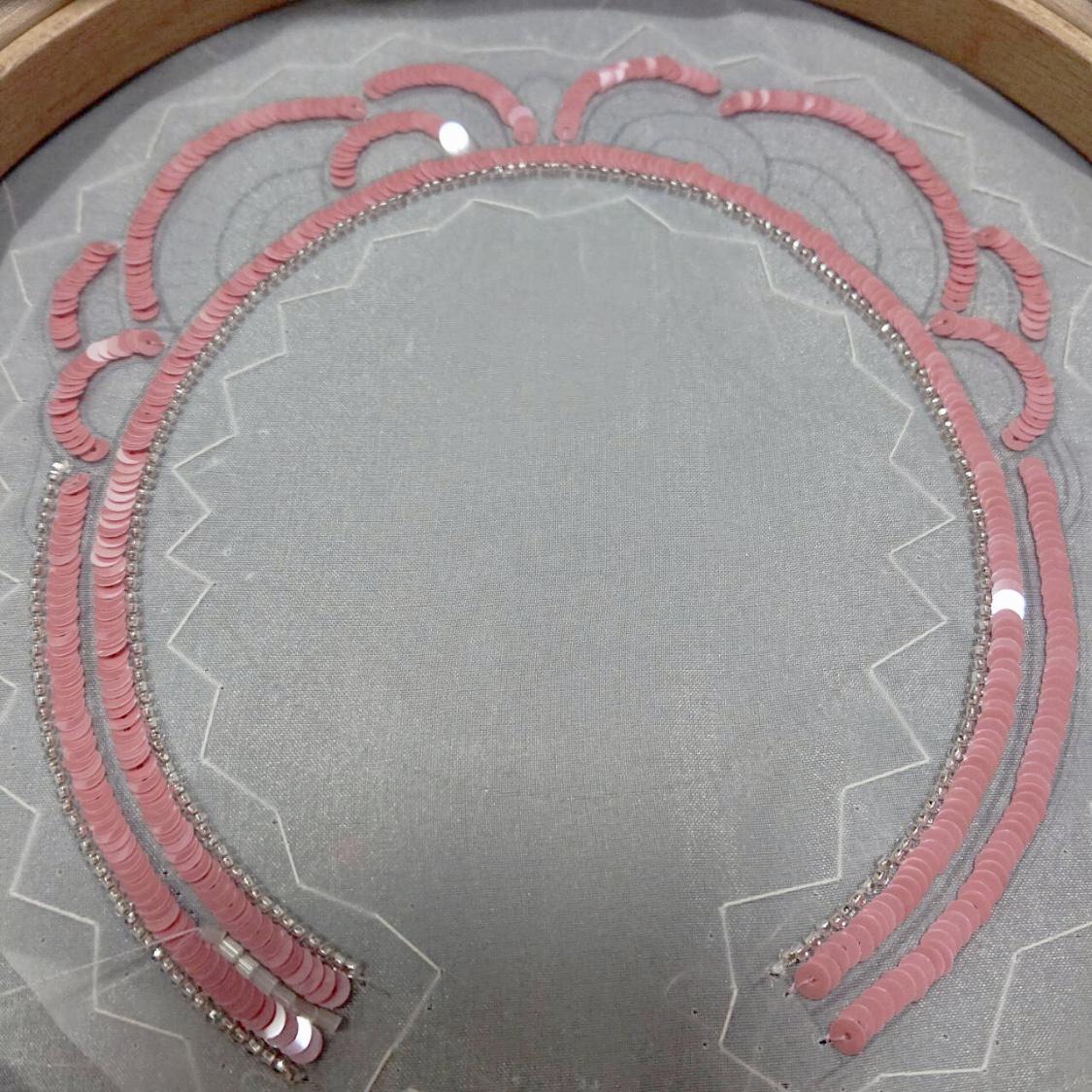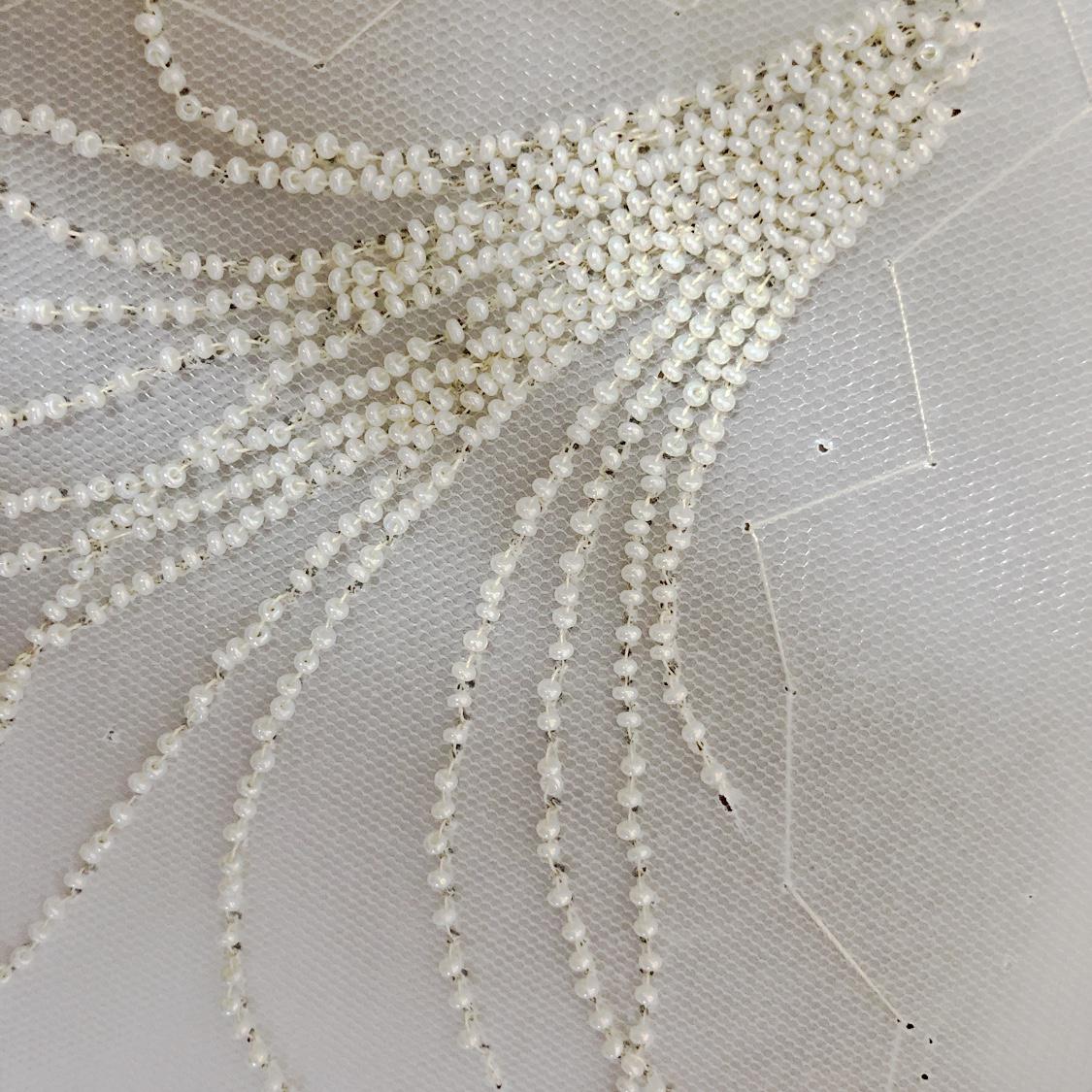 一番早い方は、半年目の試験の時点で2ヶ月ほど先の写真の課題まで進まれています。ストレッチ性のあるチュールの伸縮性に合わせた緩みを持たせなければなりません。やり直しなどもされながら、きつすぎずまた緩すぎない糸調子で作品のクオリティも磨かれています。マンツーマンですので多くの内容を進めていただいても構いません。オートクチュール刺繍は、一年ではこなしきれない奥行きと広がりのある技術でもあります。