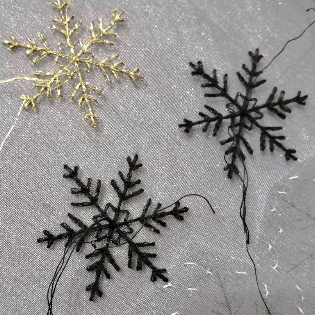 スクールでも、応用課題を重ねながらそうした新しい発想のデザインが受講生の中から生み出されていくたびにワクワクします。また、技術を突き詰めていくと、デザインの洗練につながる瞬間にも出会います。写真の蝶の刺繍も、スパンコールが立ち上がったりするデザインを図面から作り上げた応用課題ですが、アイデアソースになったモチーフに負けない美しい仕上がりになりました。その他の皆さんの応用課題も、それぞれに素敵なものになっていますので、まだ途中段階のものもありますがご紹介します。