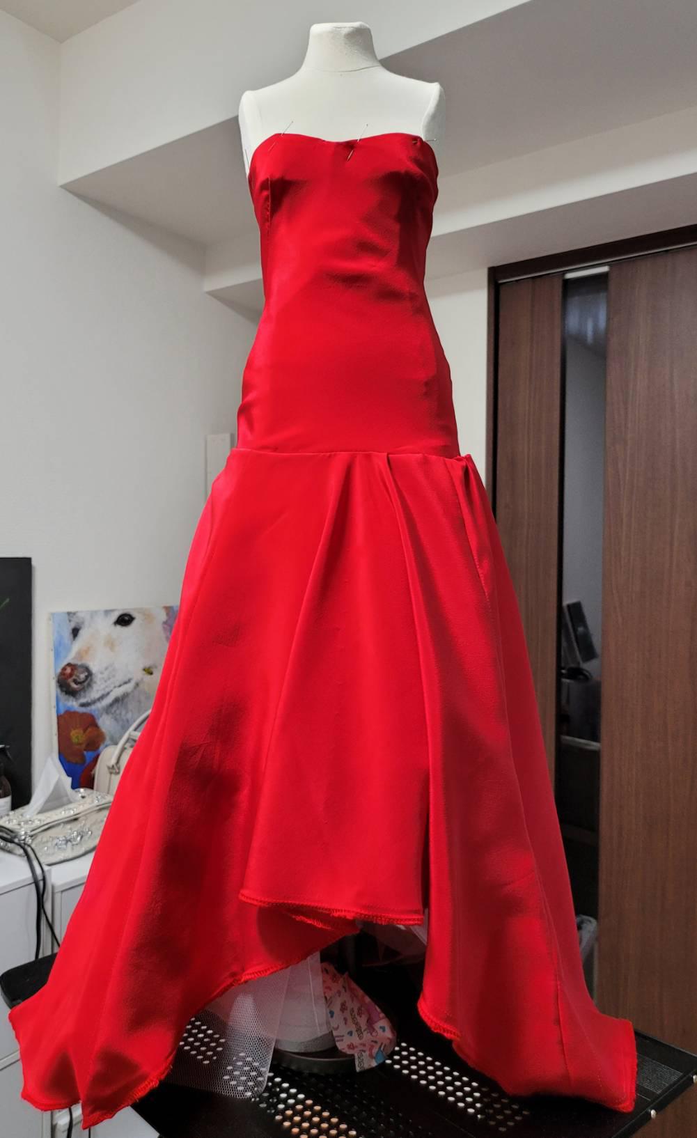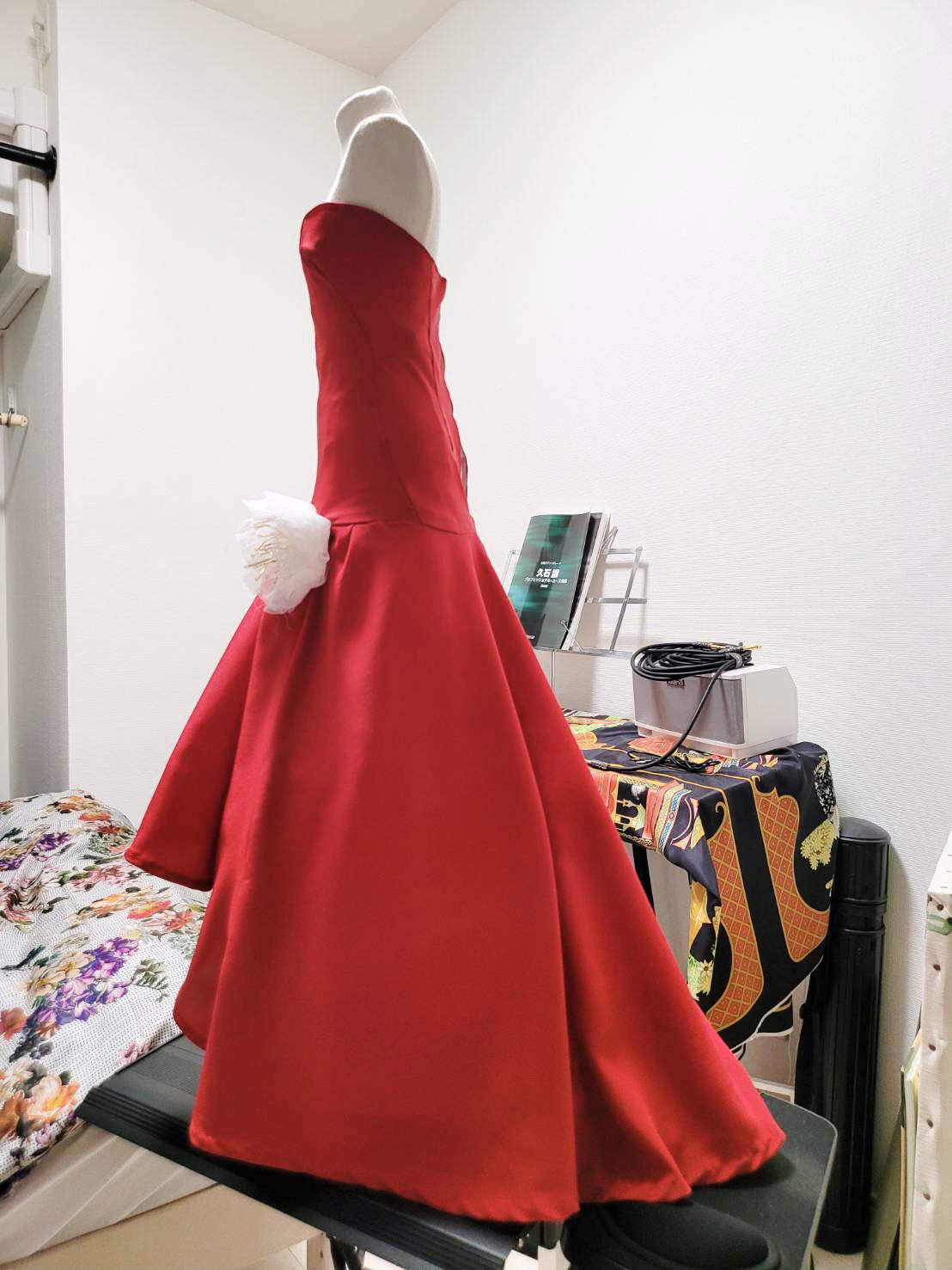 素敵なコサージュもてずくりされたラインの美しいレッドドレスが完成しました。細部まで何度もやり直したりしながら、初めてとは思えない内部までしっかり仕立てられたドールのドレス。それでも細部の縫いあがりを気にされていたこだわり感は、今後の技術力UPの可能性も感じさせられました。ボディに着せても今にも着歩き出しそうな魅力的な一着になりました。