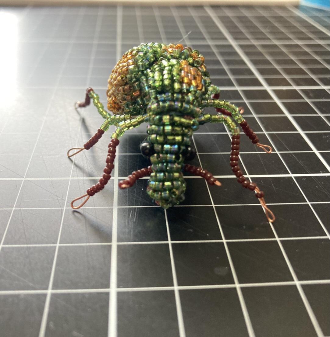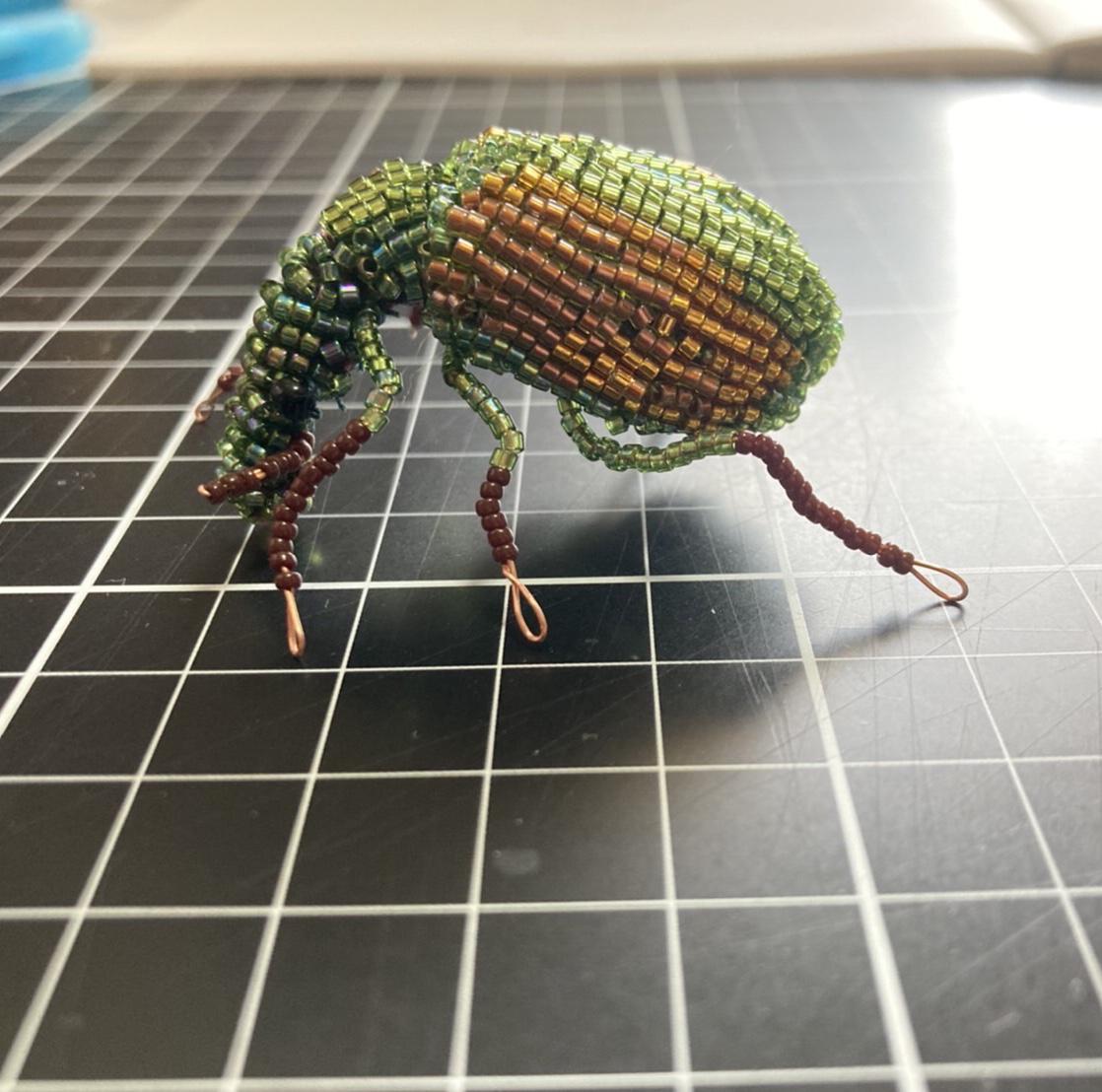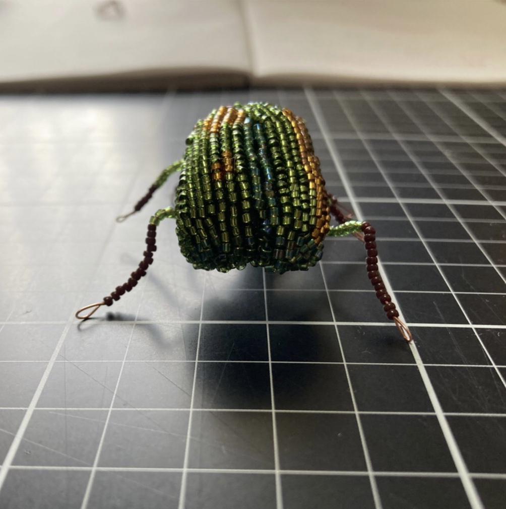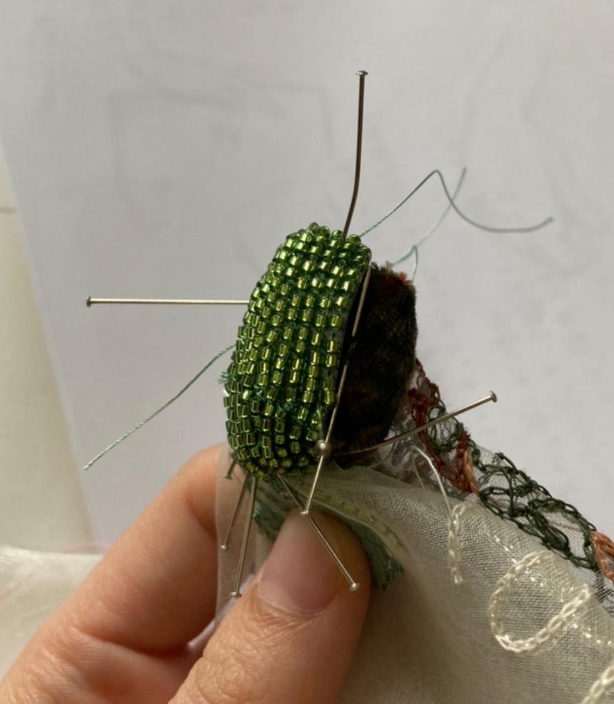 今回はスペシャリストコースのリュネビル法のビーズ刺繍の生徒作品をご紹介します。。平面ではなく立体的な丸みを形にすることを踏まえて図面を作成し、昆虫のシルエットが形作られました。
