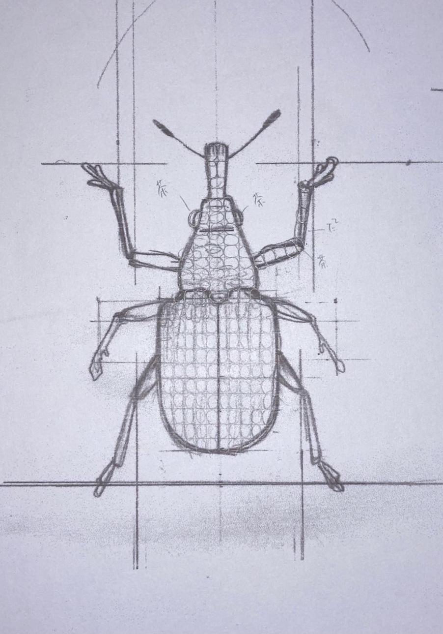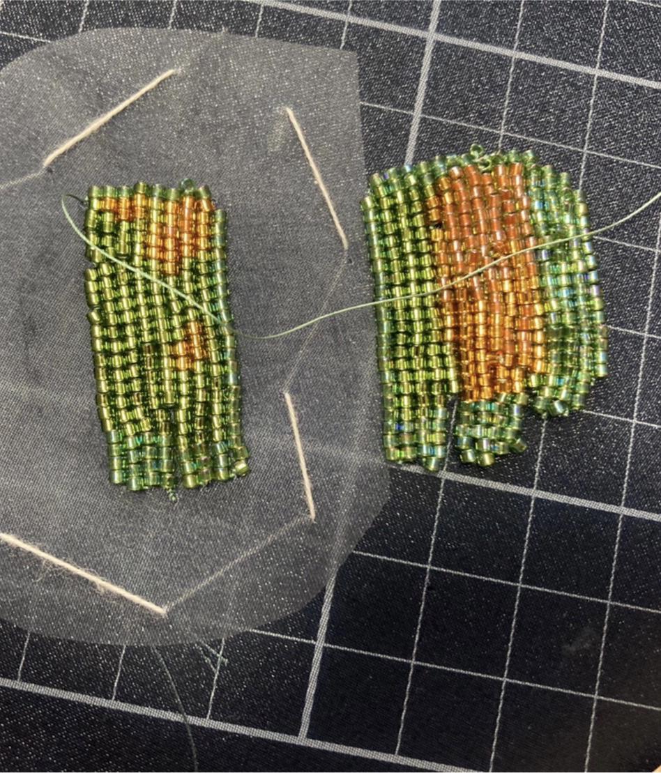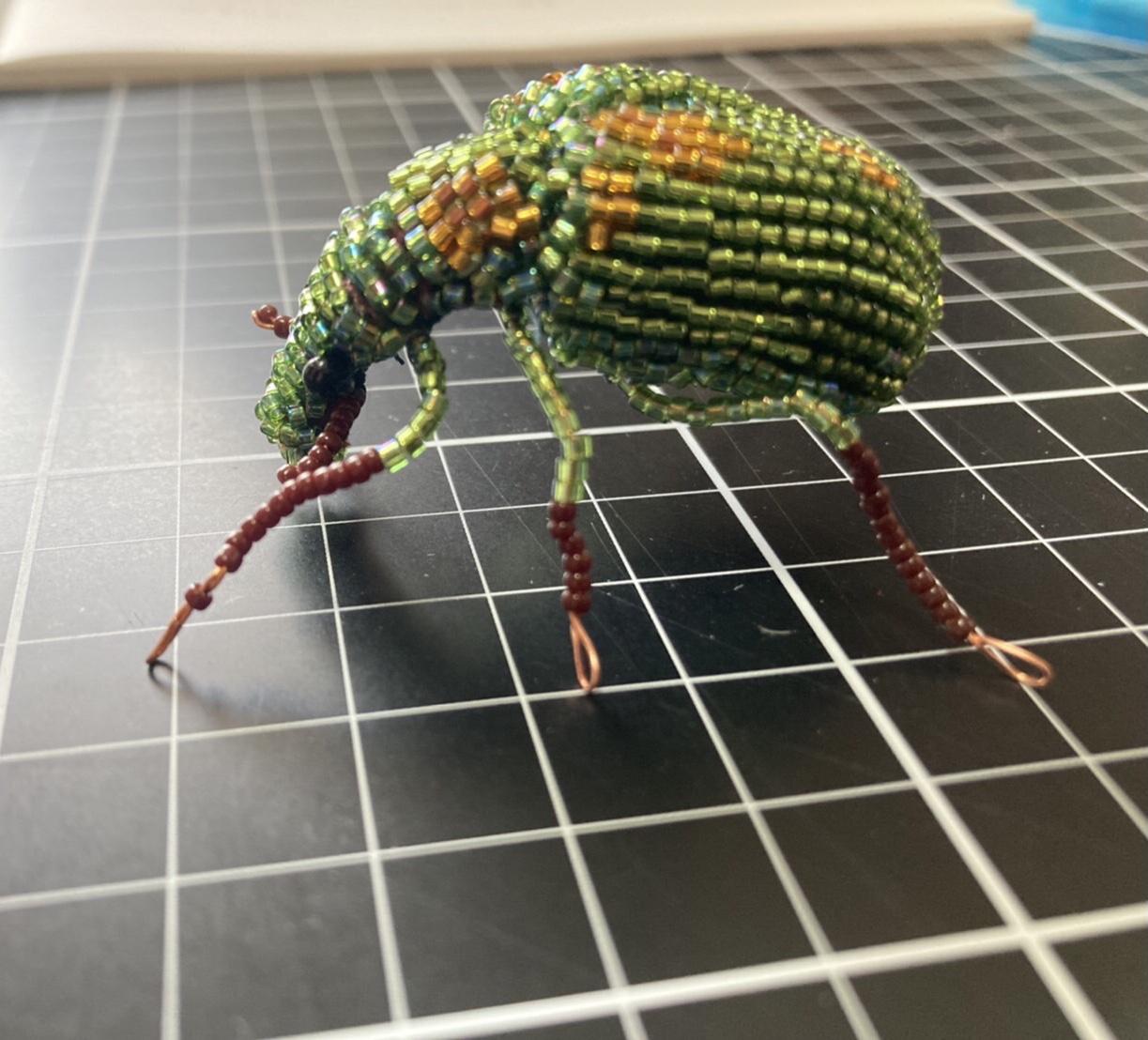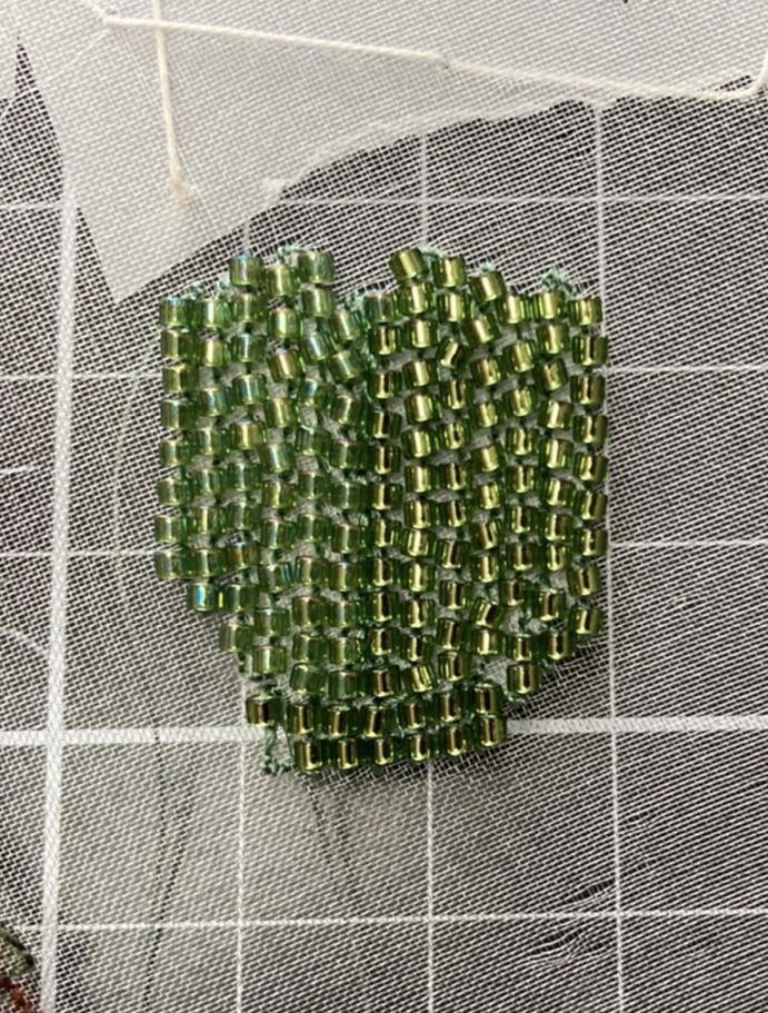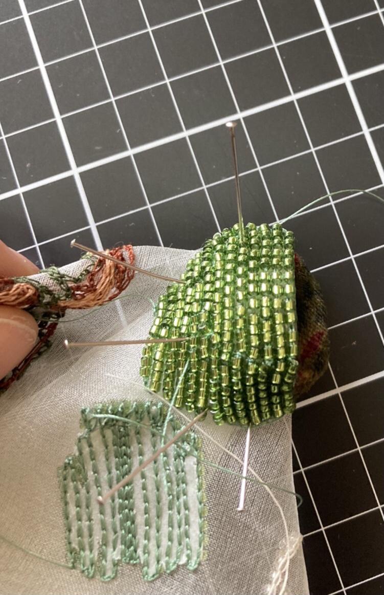 今回はスペシャリストコースのリュネビル法のビーズ刺繍の生徒作品をご紹介します。。平面ではなく立体的な丸みを形にすることを踏まえて図面を作成し、昆虫のシルエットが形作られました。