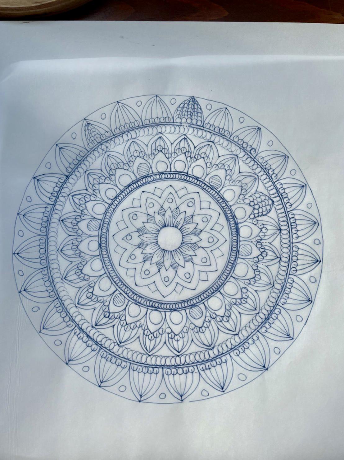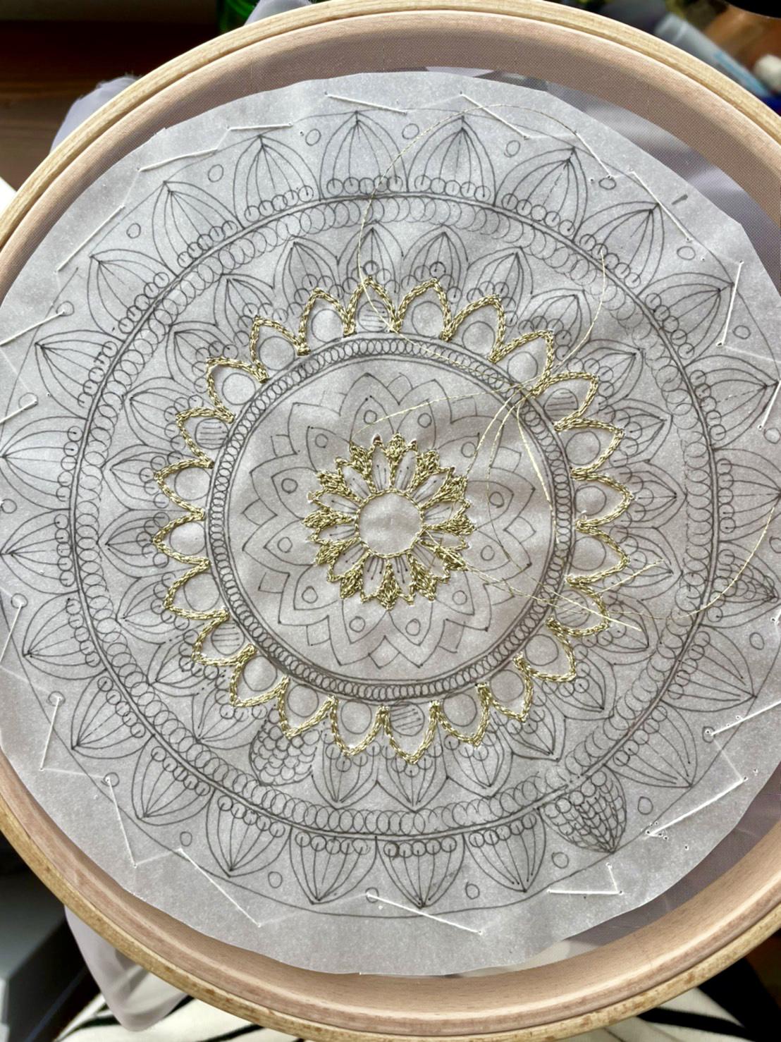 均整のとれた緻密な図面が描かれ、ひと針ひと針着実に宝石のような刺繍が敷き詰められていきます。