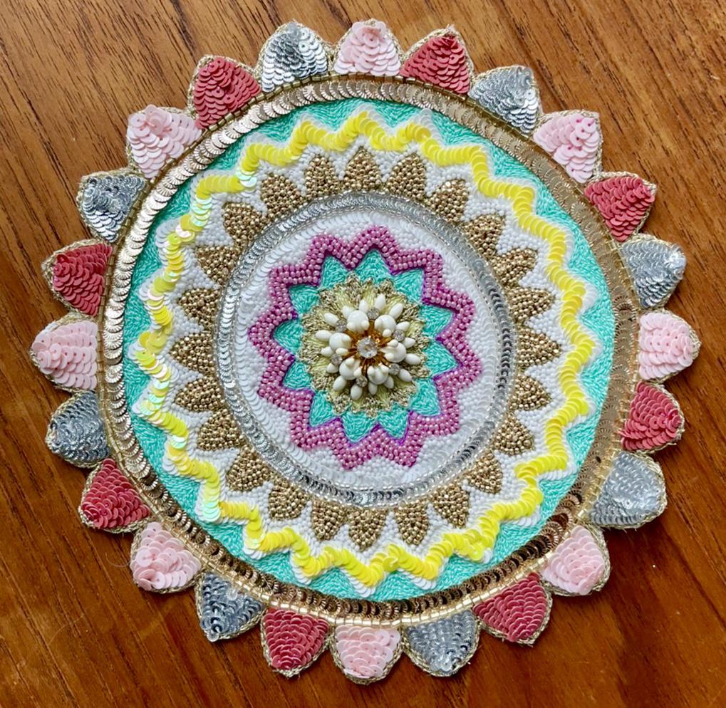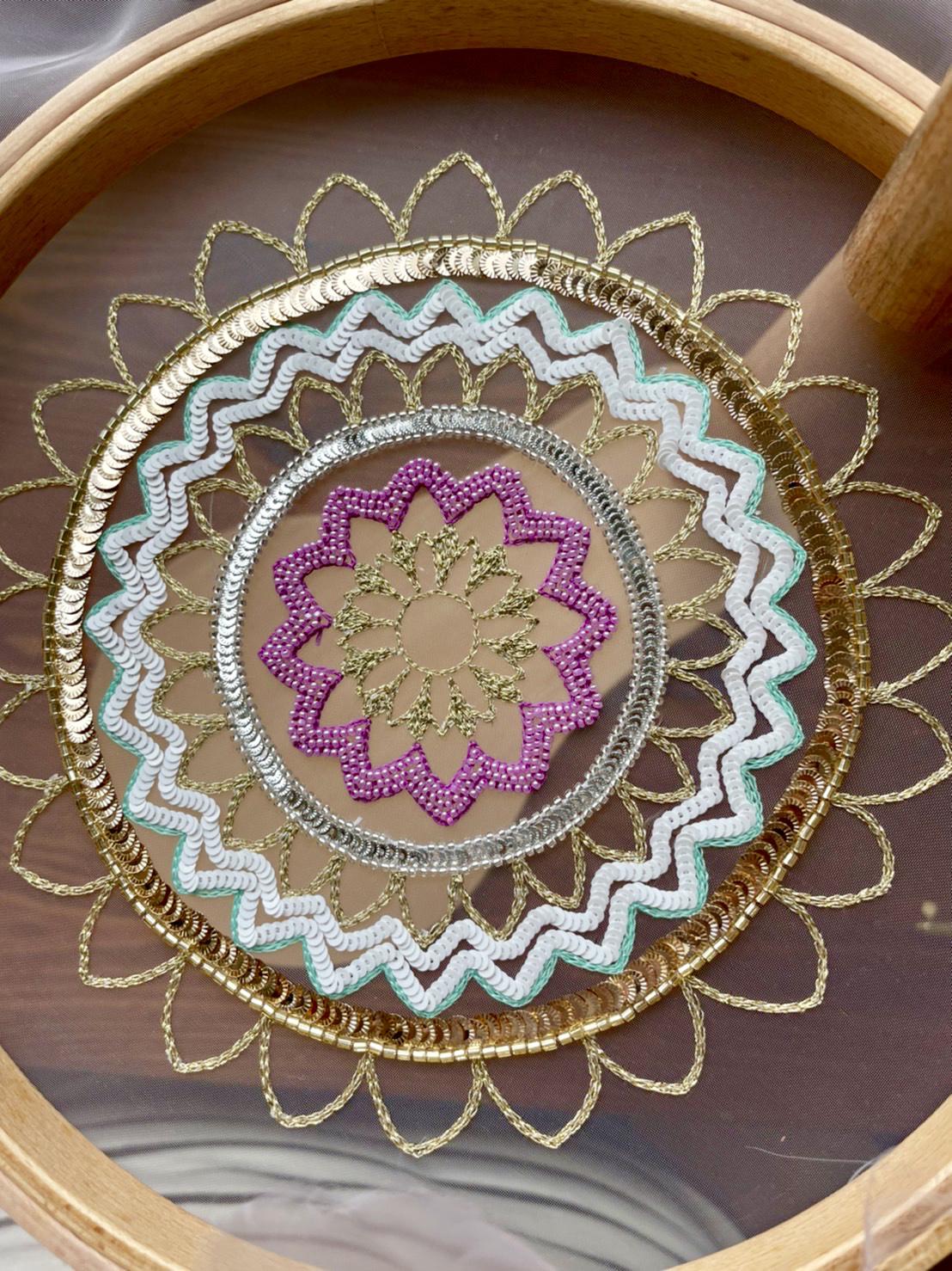 ぎっしり敷き詰められたビーズやスパンコールの煌めき、色彩、並び。そのバランスのどれもが魅力的です。イメージされた美しく鮮やかな世界観に引き込まれます。