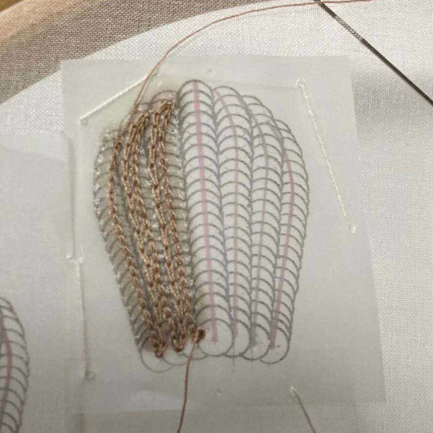 こちらは準備された図面に、各自で自由にデザインをし好きなスパンコールで刺繍をしていく課題です。花の中心も、パールやクリスタルでデコレーションする方もいらっしゃれば、今回のように竹ビーズを使用し、立体的にされる方もいらっしゃいます。ナチュラルなカラーで立体的な存在感のある作品に仕上がりました。