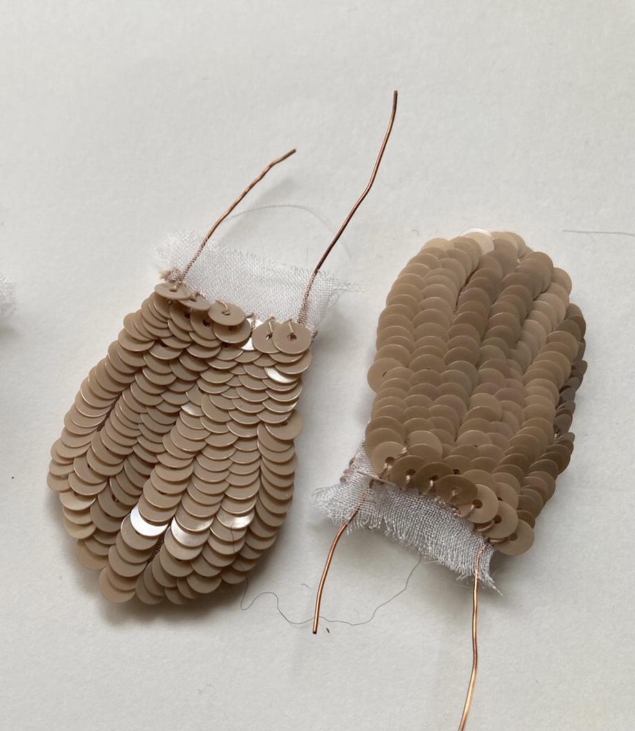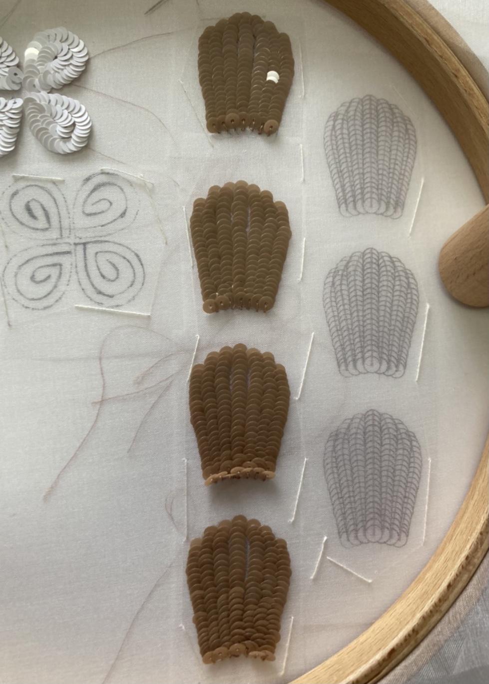 スパンコールの刺繍は糸の引き加減によって、配列などの落ち着きが変わりますが、枚数を重ねられる度に美しく整ってきました。モダンさとナチュラルな雰囲気のある素敵な作品になりました。