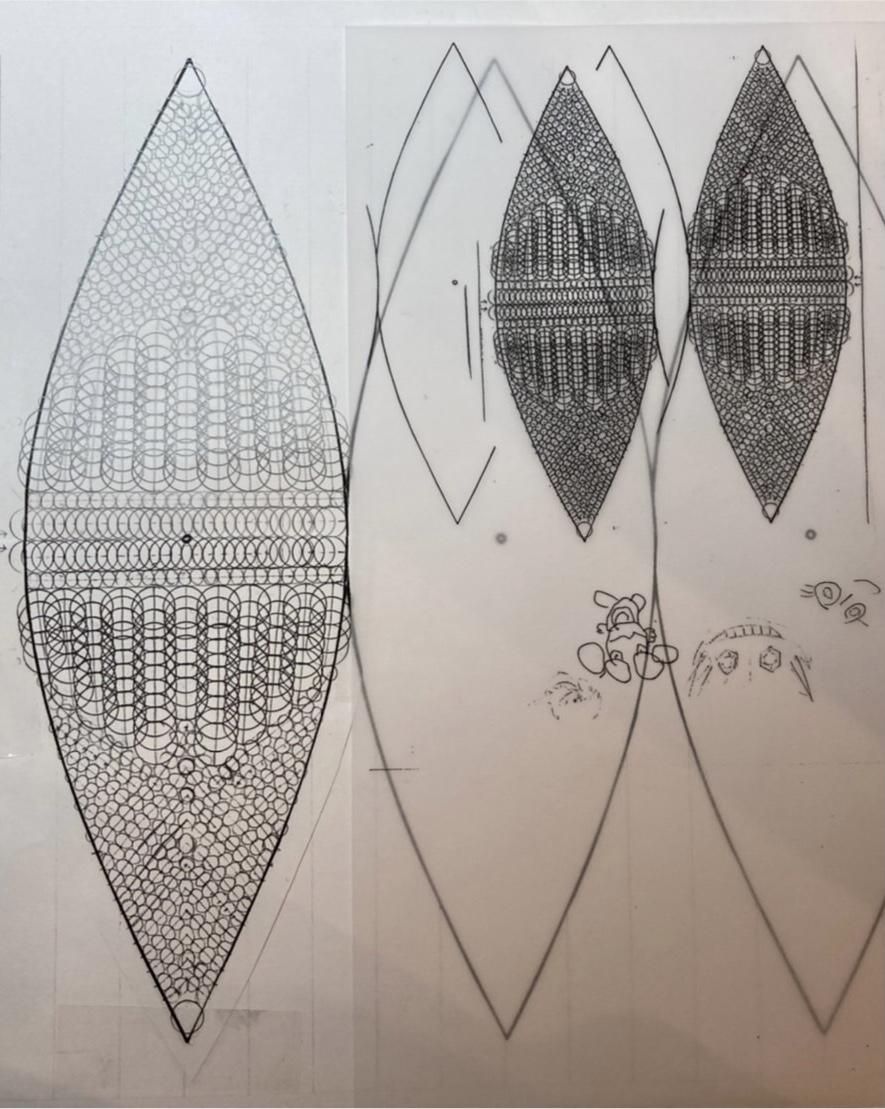 丹念に描かれた図面が美しい刺繍のパーツをいくつも再現しました。