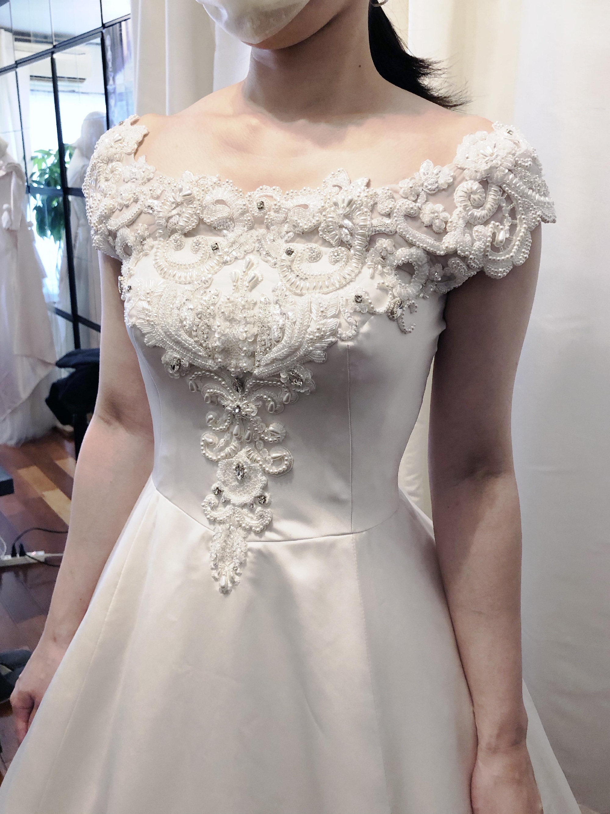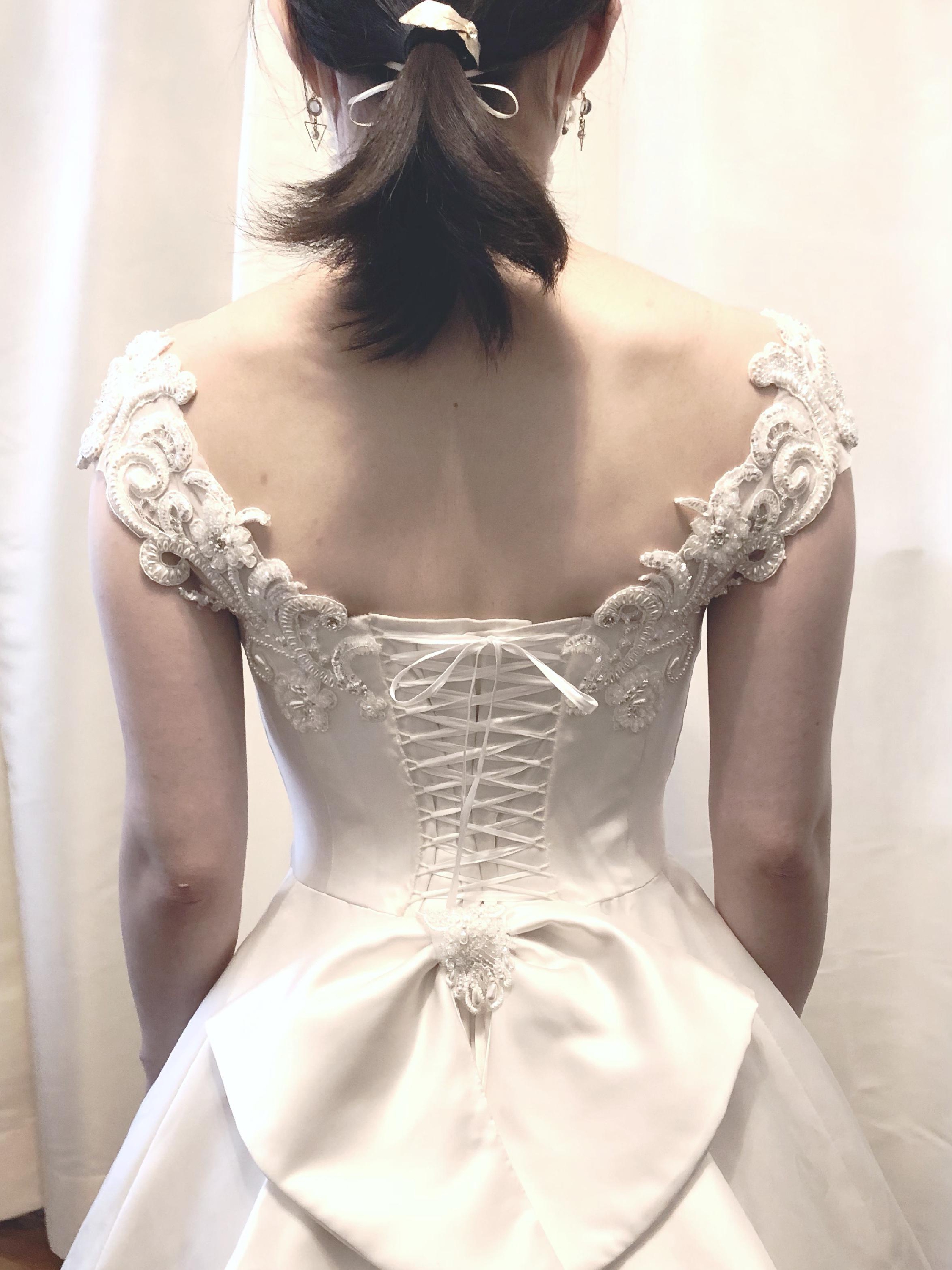モチーフに刺繍を重ねたウェディングドレスは、ご自身の体型にしっかりフォット。オートクチュールコースで制作するドレスの内部のコルセットは16本のボーンとが構成する立体パターンにより、ウェストを6〜16㎝ほどシェイプします。3回ほどレースアップの紐を締めていき、帯を締めているような引き締め感になります。一つ一つのディティールが存在感のあるものになり、細部まで美しく完成しました。(写真・・・ドレーピングの様子)