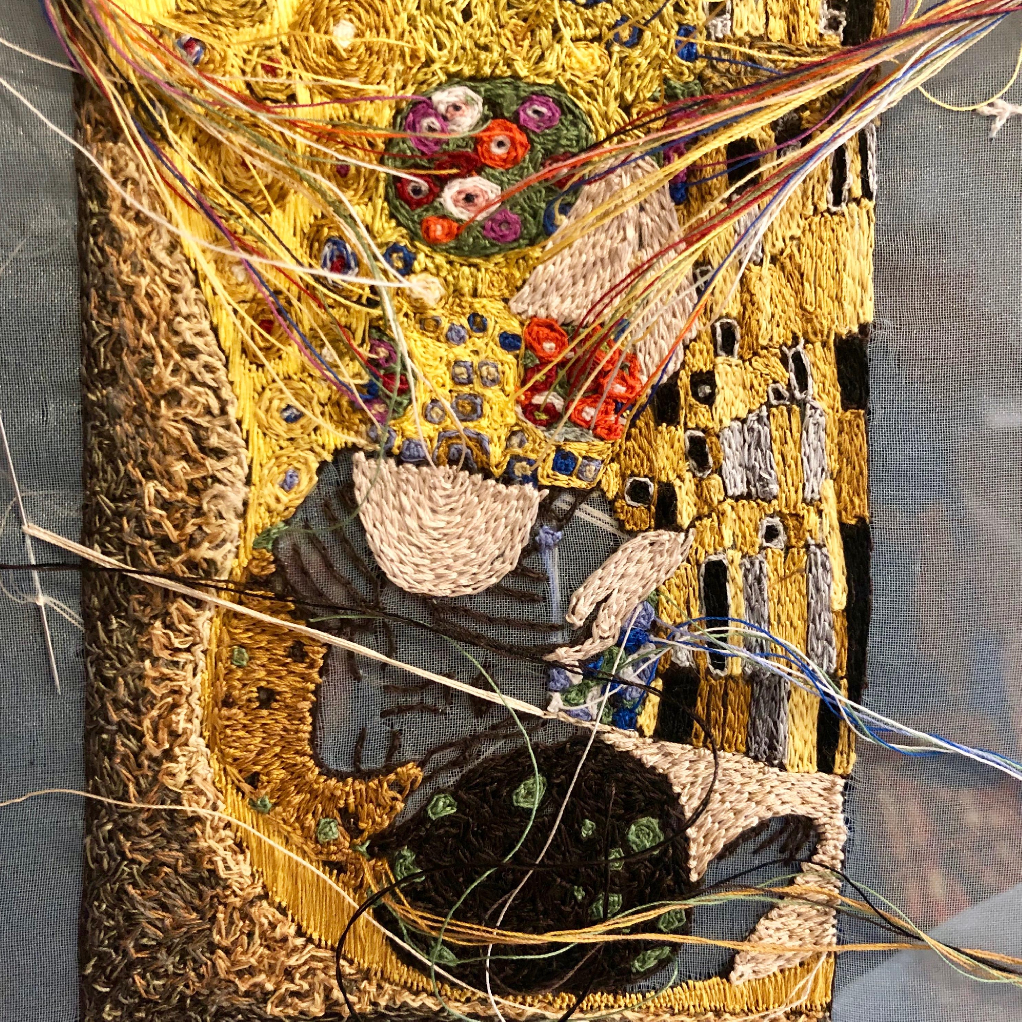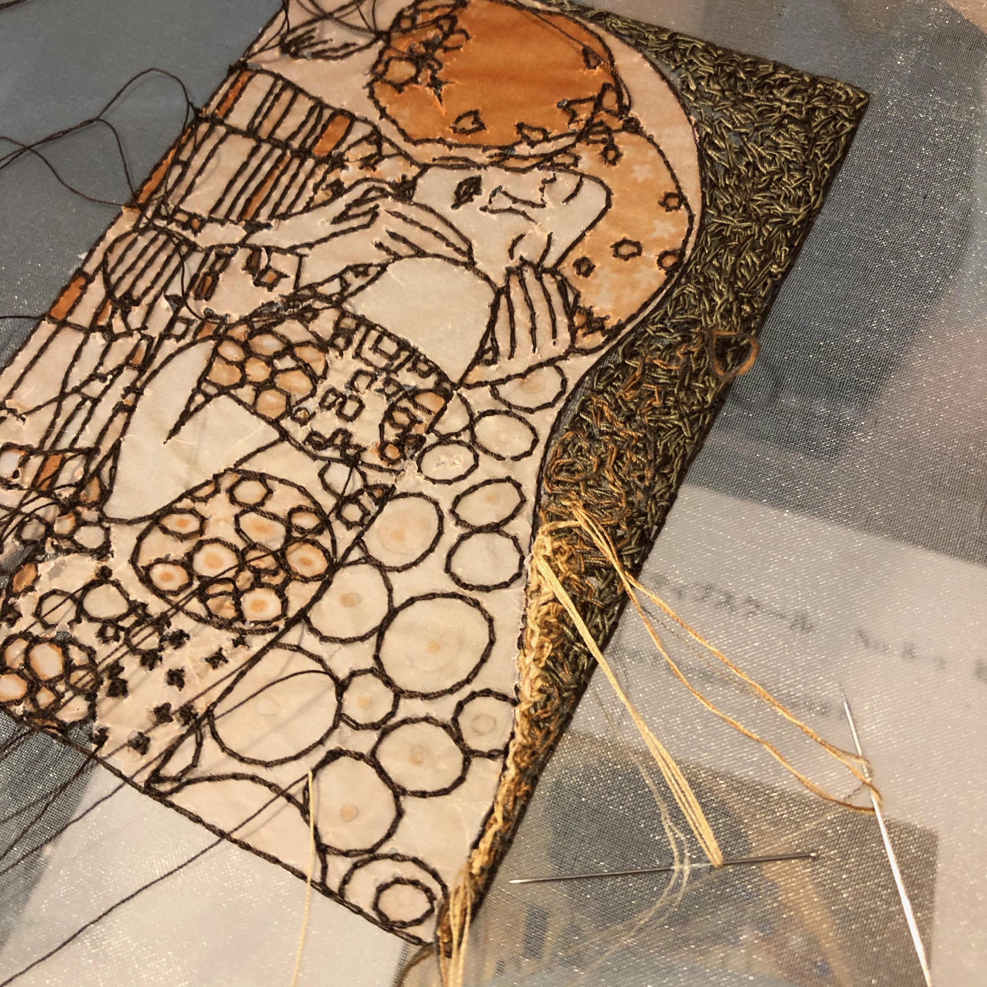 Photo↓クリムトの絵画の刺繍 刺し途中 生徒作品