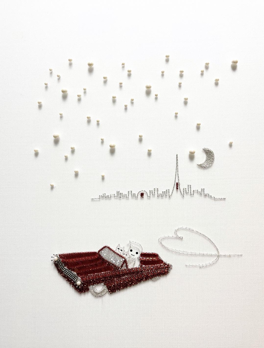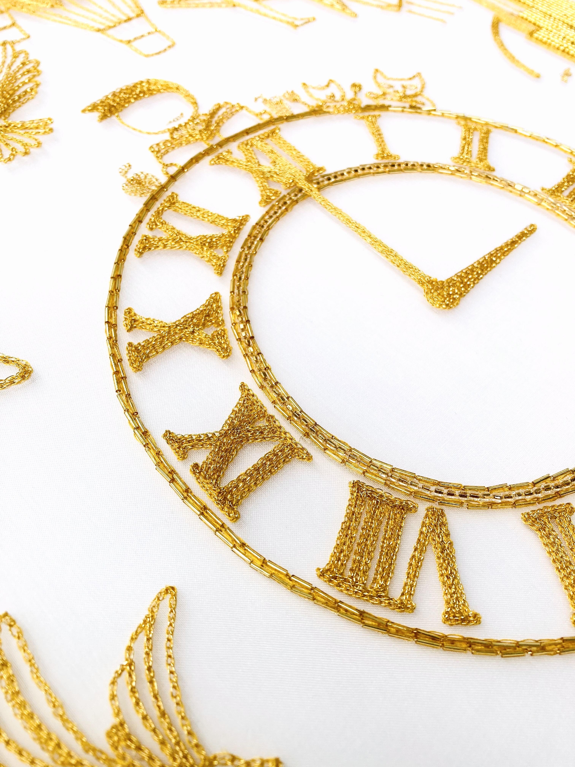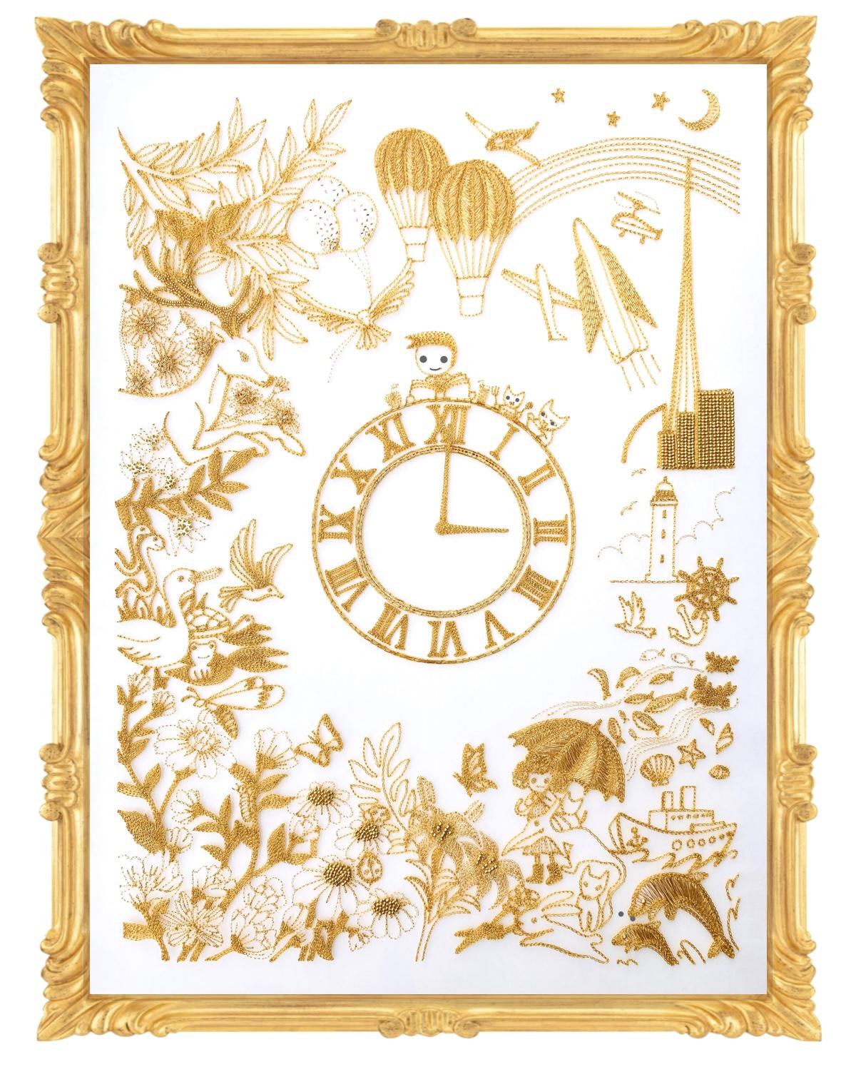 金糸と銀糸で描く刺繍アートとして立ち上げたMusse Elieux(ミュゼ・エリュー)。そのアートブランドとしてのコンセプトを刷新するようなビーズ刺繍を用いた作品として仕上げられました。ビンテージのビーズやスパンコールの味のある「古き良き時代の世界観を作品に纏わせる」ということに挑戦され、見事に形にされました。金糸や銀糸は、普通糸に比べ張りがあり、糸調子も強くなりやすく難易度が高くなります。しかしそれを制する鍛錬された技術に加え、刺繍による豊かなクリエーションの魅力が詰まったアートとして完成されました。この作品が、絵画の刺繍のブランドとしてもビーズ刺繍やスパンコール刺繍を取り入れていくという新たな方向性を見出すきっかけも下さいました。一目でインプレッションを与えられる存在感のある1作となりました。おめでとうございます!