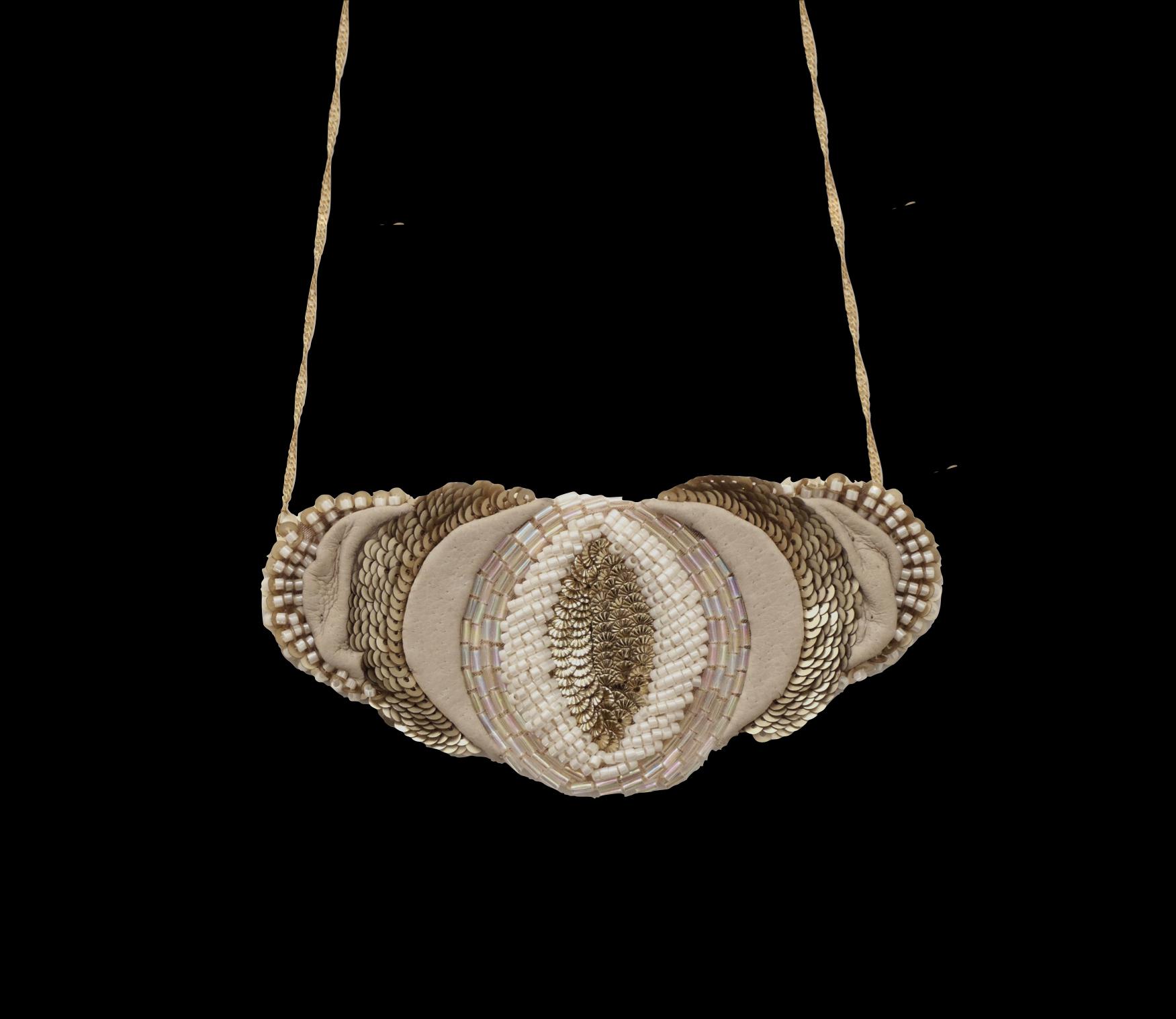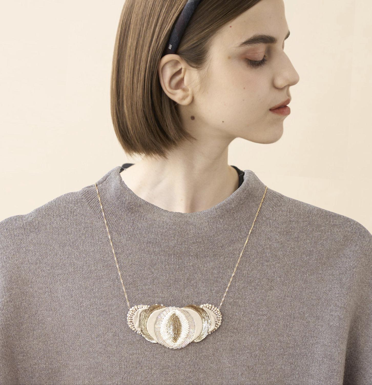 スパンコールを用いた応用課題で、自分でデザインしていく課題として作成されました。オリジナルのデザインやイメージを、モダンでありながらナチュラルな質感とカラーでまとめられました。ベージュのレザーやオーロラカラーのビーズ、デザインの入ったスパンコールなど、特徴的なそれぞれの素材を融合されました。そしてシンプルさをも感じさせるような洗練されたアクセサリーとして仕上げられました。皮の端の始末を細部までこだわって仕上げられ、また刺繍図面もミリ単位の修正をされながら、細かな各パーツの配置を整えて作成されました。常に前倒しで作業を進められ、その安定した仕事も、作品に感じられる安定感として滲み出ています。おめでとうございます!