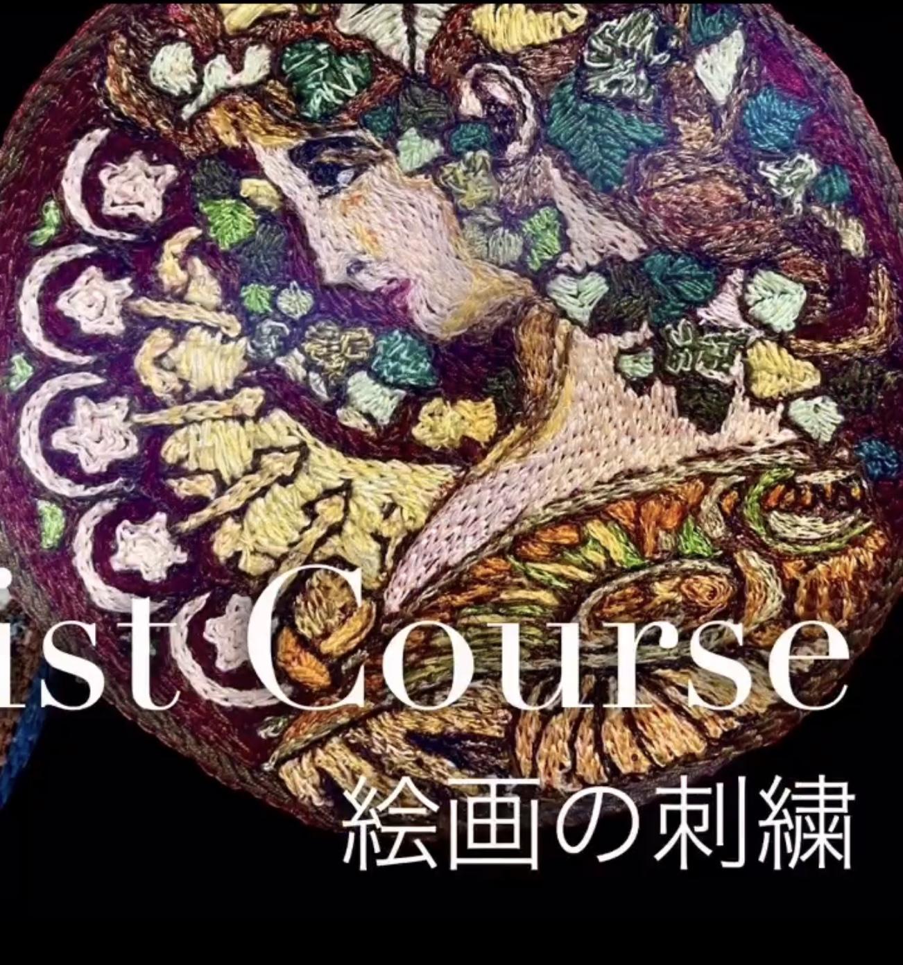 ミュシャの絵画を自分のオリジナルカラーで刺繍する課題です。この課題は糸の引き上げに慣れ、ステッチの精度を極めていく事と色彩表現をテーマにした課題です。ミュシャのテイストを残しながら、キュービズムのようなアーティスティックな表現をミックスされ、味わいのある絵画の表現をされました。内面に持たれている想像力や構想力を、確かな技術が支え、最高のクリエーションを生み出します。技術の習得だけでなく、そうしたデザインの力も磨かれてきています。