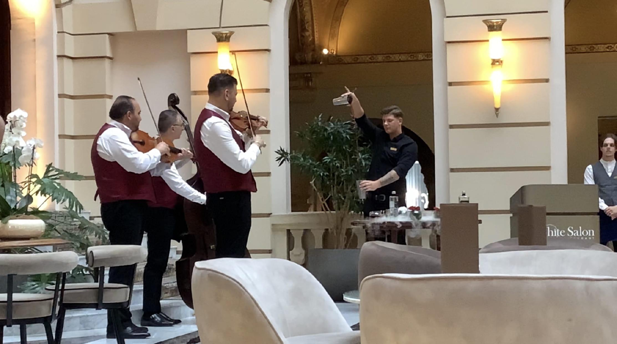 そんな事を思い出していたら、これを書いているブダペストのホテルのロビーでバイオリンの3重奏が始まり、マジックかな?と思ったらウェルカムドリンクのカクテルを作るショーでした。私は今日はもうチェックアウトの日なのに、頂いてしまいました。到着日は、知らなかったのですが、このくらいの時間に、部屋にチョコレートが届けられました。