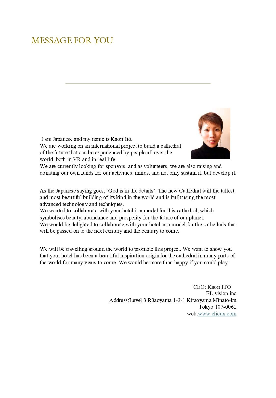 そしてそれは大聖堂のプロジェクトと一体になりました。 大聖堂のモデルとなって頂けるホテルとパートナー契約をしたいと考えました。 そのホテルが新たな未来の大聖堂のモデルとなっていることを、語り継がれるような唯一の存在としてお伝えして参ります。このホテルから、 女神の願いや祈りが発信されるSNSブースを設ける事を考えました。