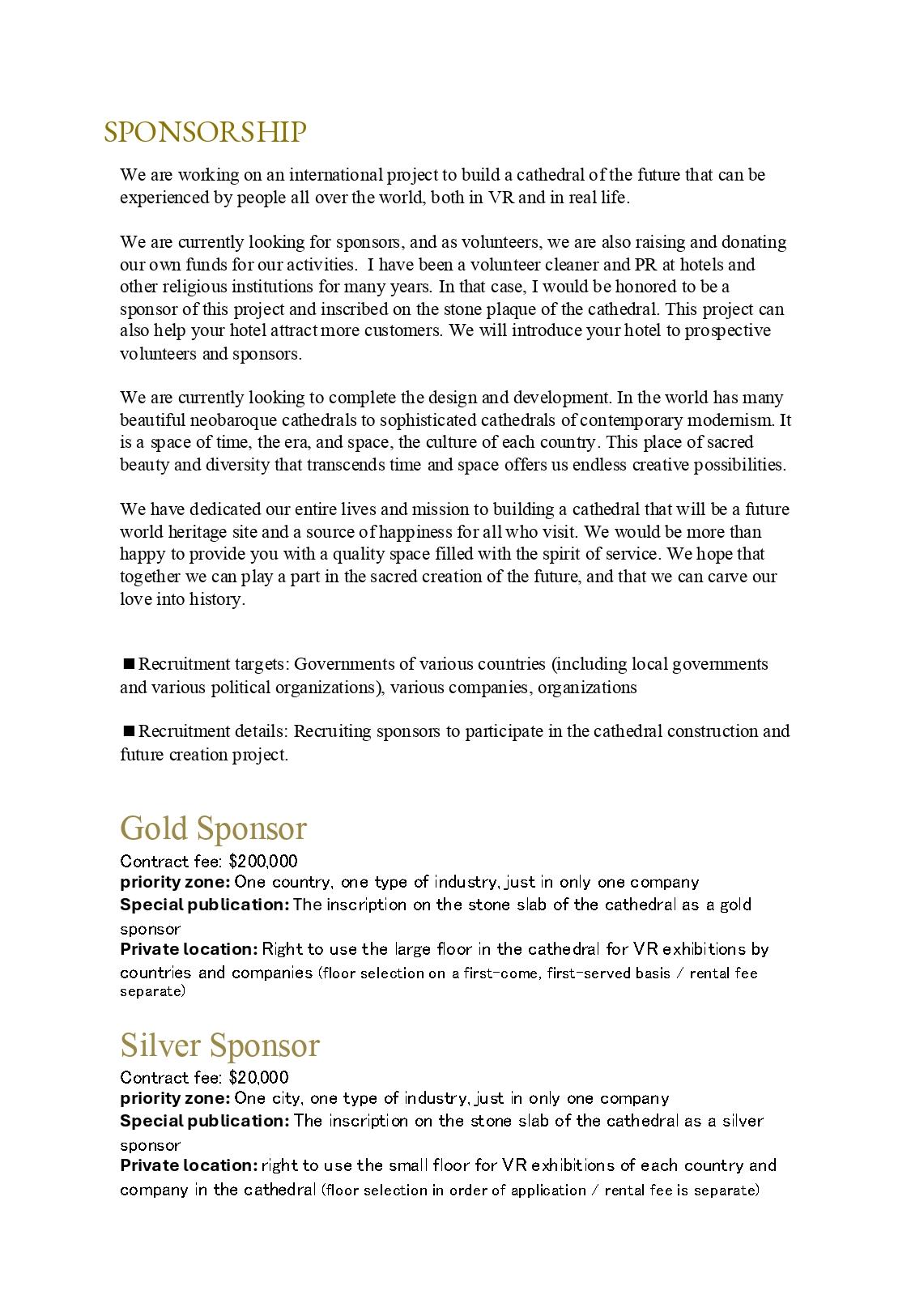 10月27日から31日まで、プロジェクトのパートナー及びスポンサーの申し込みを直接受付させて頂きます。申し込みの条件はなく、世界各国の国や企業や団体がお申し込みいただけます。パートナーとスポンサーの詳細は以下の資料をご覧下さい。