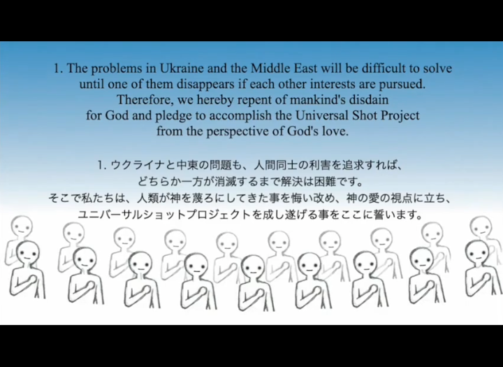 そこで私たちは、人類が神を蔑ろにしてきた事を悔い改め、神の愛の視点に立ち、ユニバーサルショットプロジェクトを成し遂げる事をここに誓います。