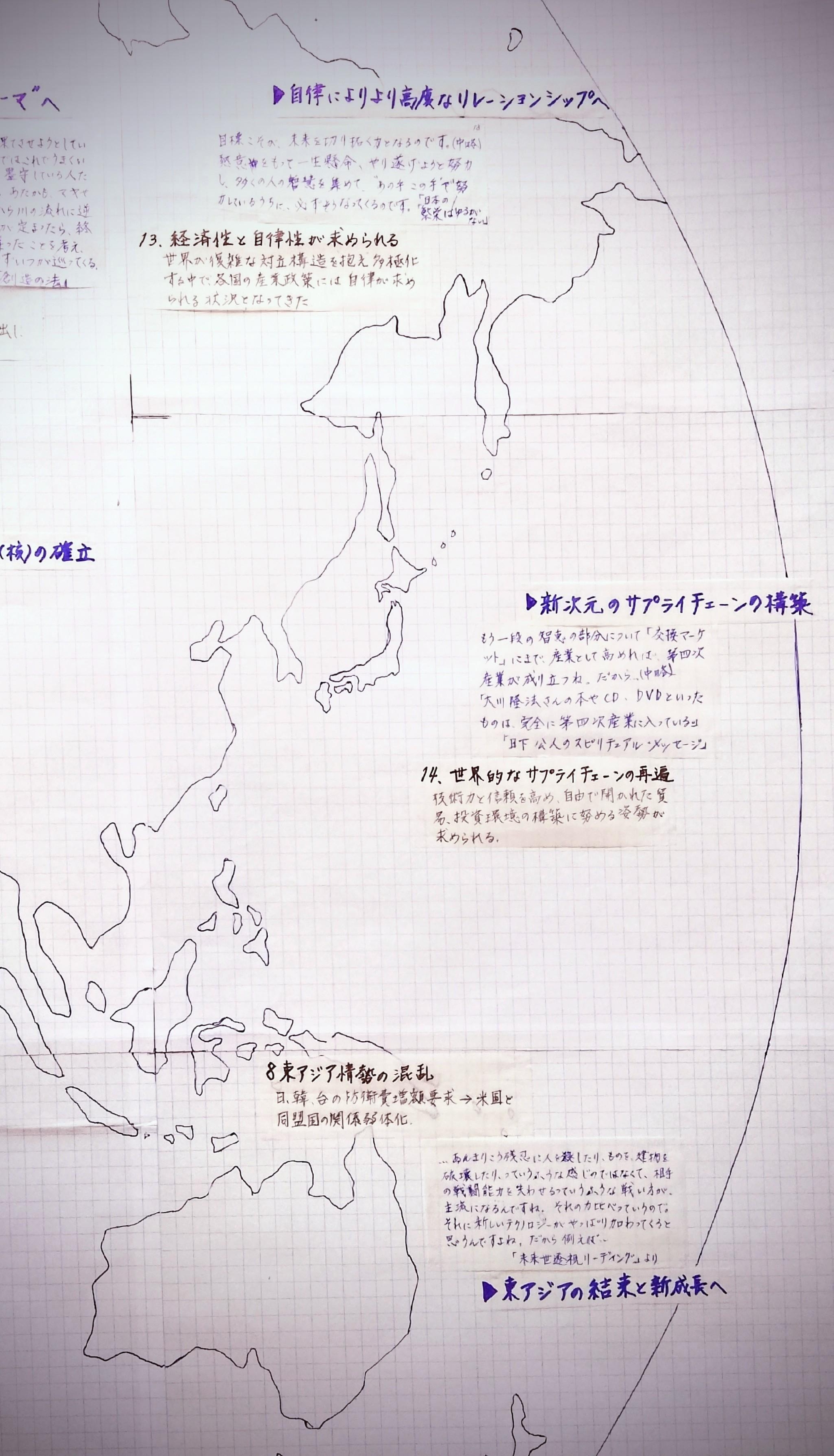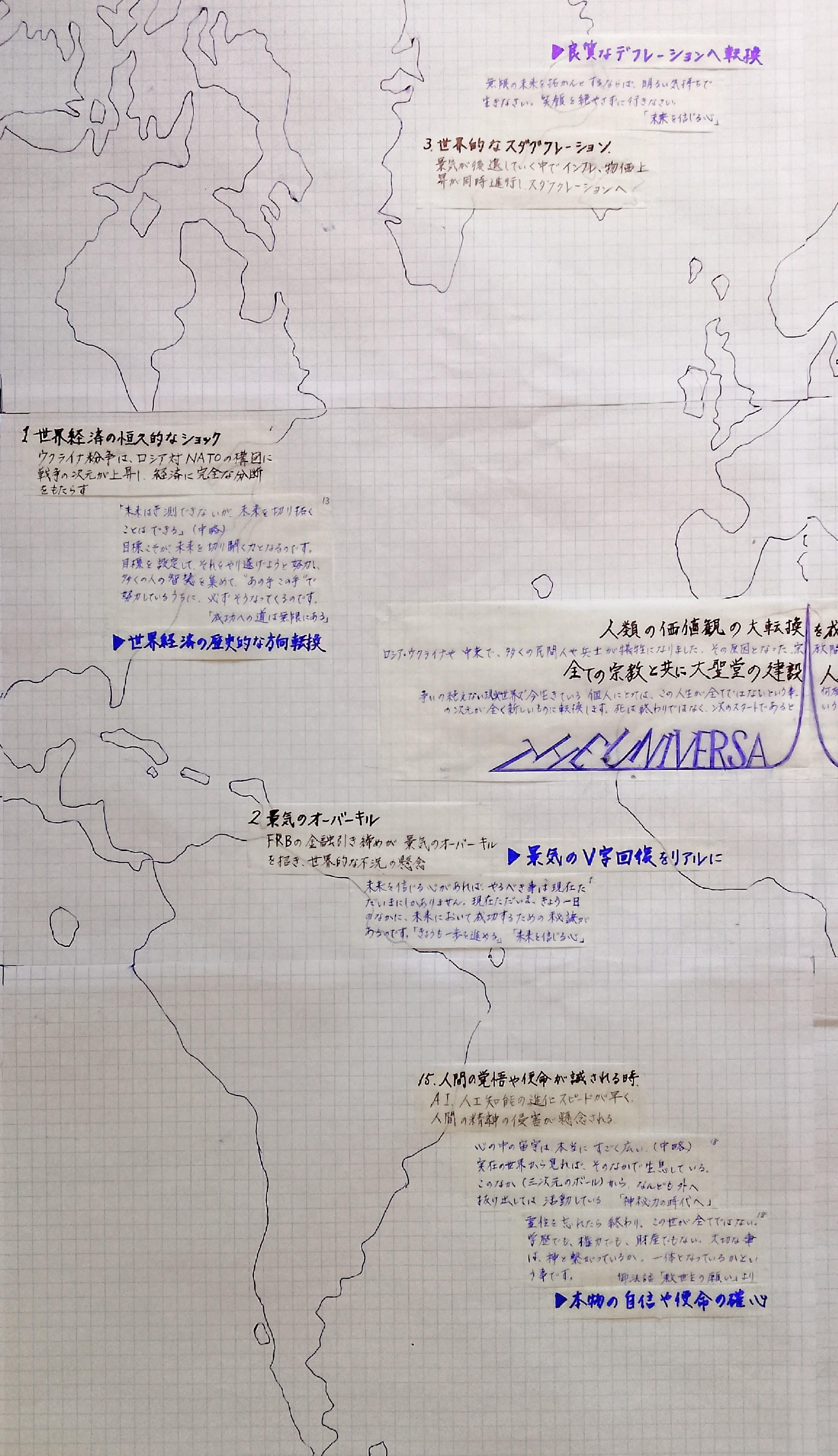 そして、このまま戦争の世界が続いた場合の世界を黒字。それをユニバーサルショットプロジェクトで方向転換した場合をブルーで記載しました。