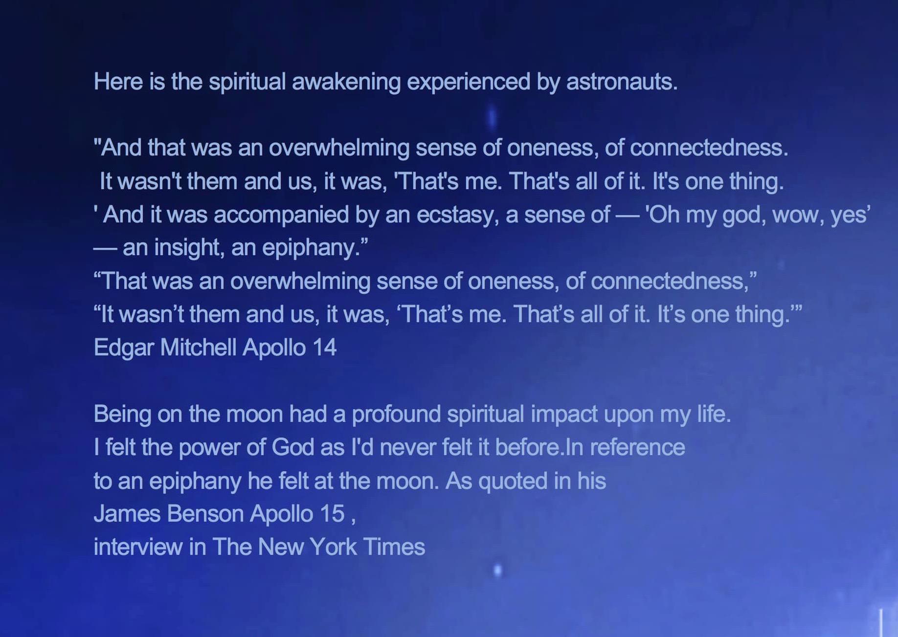 「宇宙飛行によって、それら(神の存在)の懐疑は吹き飛びました。 神がそこにいるということが如実に分かるのです。こんな精神的な内的変化に私自身も驚きました。その臨場感は知的認識を媒体にするのではなく、直接的な実感でした。」