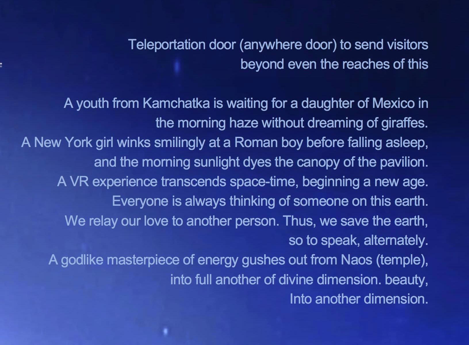 We will create a VR/AR experience floor in a cathedral utilizing Super AI, based on the concept of an enlightened approach to "value that resonates with the heart. Each country's floor will offer VR/AR experiences in a high-quality space (environment) that is completely brand-safe and protects a sophisticated image. Products related to these experiences can be displayed and sold. It is also a cutting-edge creative technology mall with new super AI and VR technology stations and state-of-the-art creative technology.