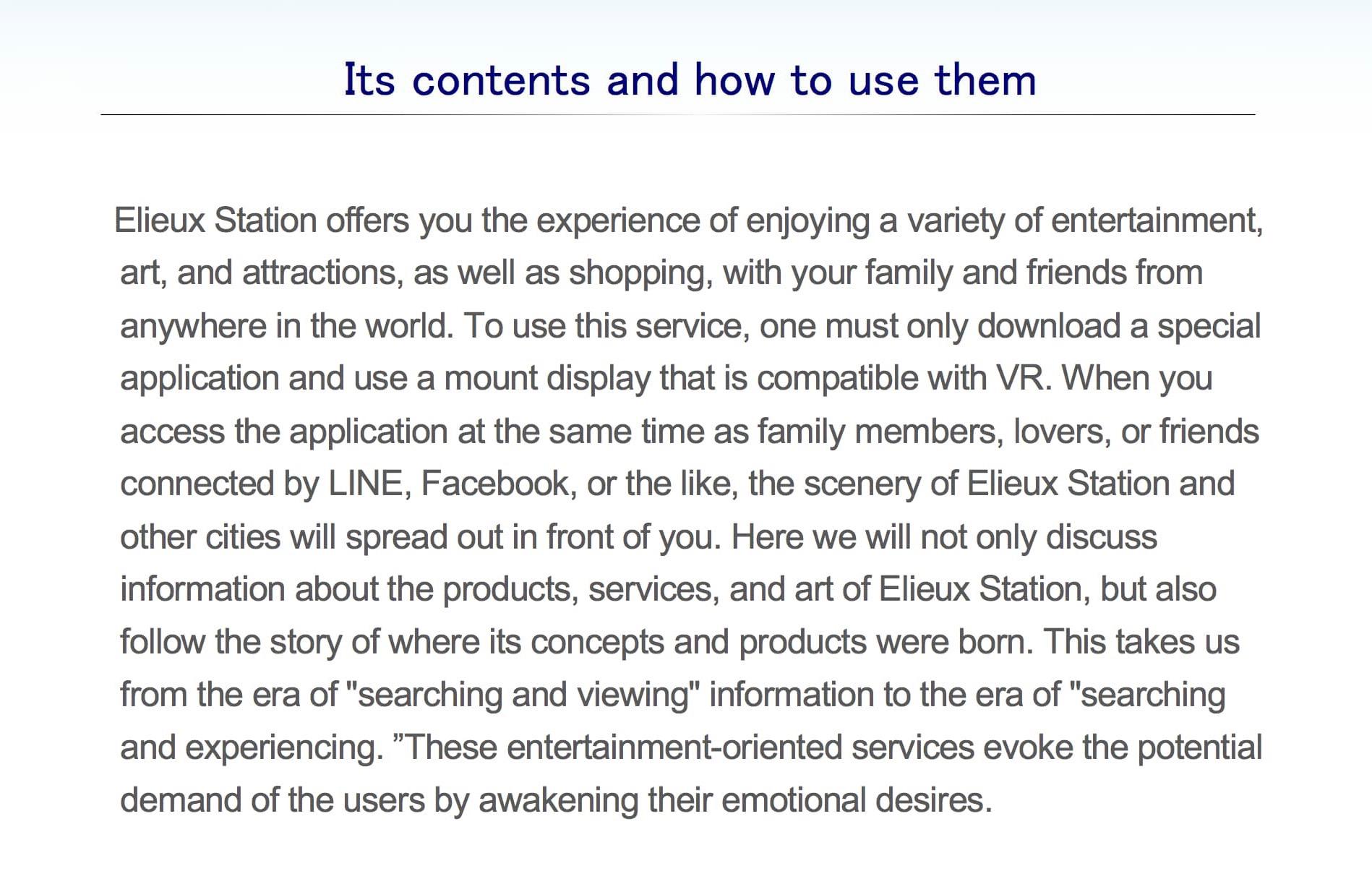 Elieux Station は、 世界のどこからでも家族や友人と一緒に、 様々なエンターティメント・アート・アトラクションや買い物を楽しめる体験を提供します。 利用方法は、 専用アプリをダウンロードし、VRを視聴できるヘッドマウントディスプレイにセット。 LINEやFacebook などでつながっている家族や恋人・友人とアプリにアクセスすると、 Elieux Stationを中心とした都市の全景が目前に広がる。