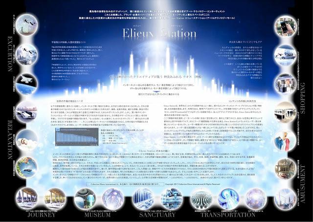 ここで移動手段を選択。 ピーターパンの様に自由に空を飛んだり、 雲の上で寝てみたり。 あるいは空飛ぶ車やジェットで都市の上空や宇宙をドライブ。 さらにワープ (瞬間移動)する事も出来る。 Elieux Stationエントランスでユーザー達は体験したいメニューをセレクト。 ユーザー専属ロボットからその時の気分や心境にシンクロさせたオリジナルプランの提案も受けられます。