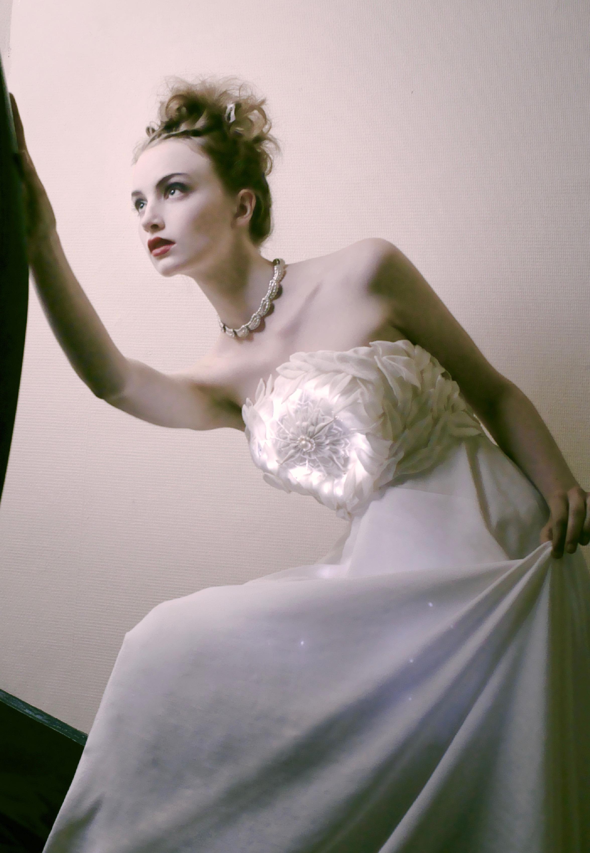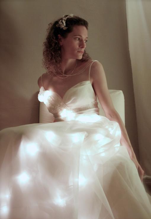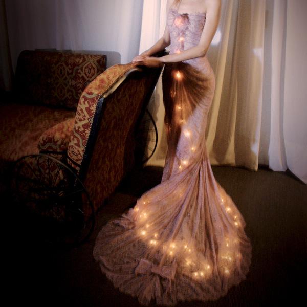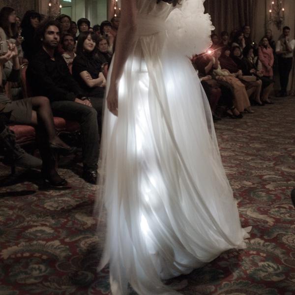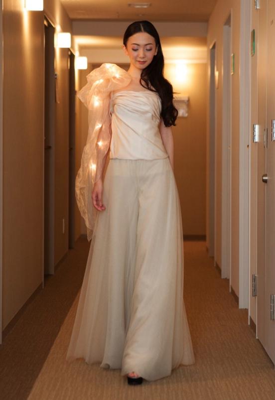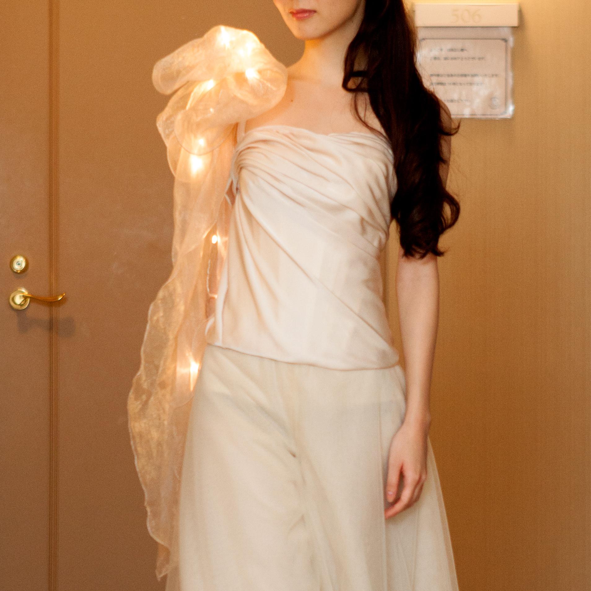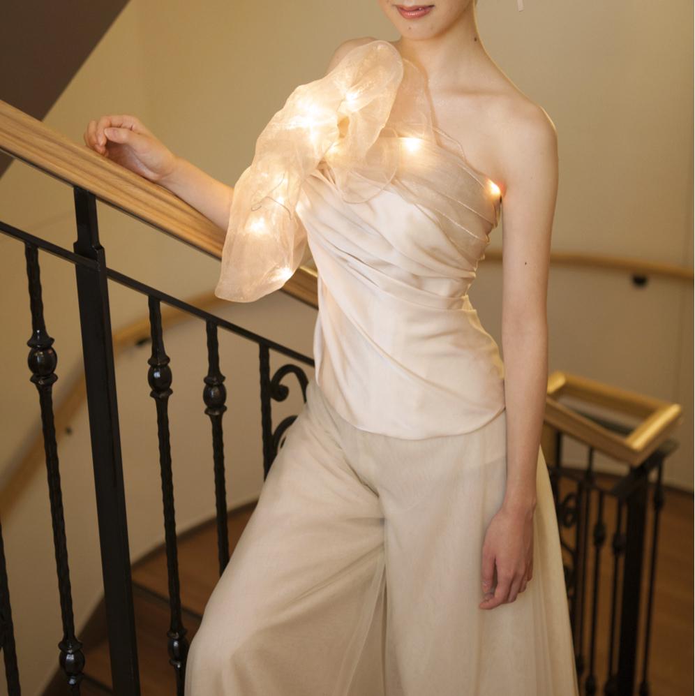 オーダープランのLEDを内蔵する光を取り入れると、バルーンスリーブの柔らかな素材の陰影が立体的に浮かび上がり、ドラマティックな表情を魅せます。