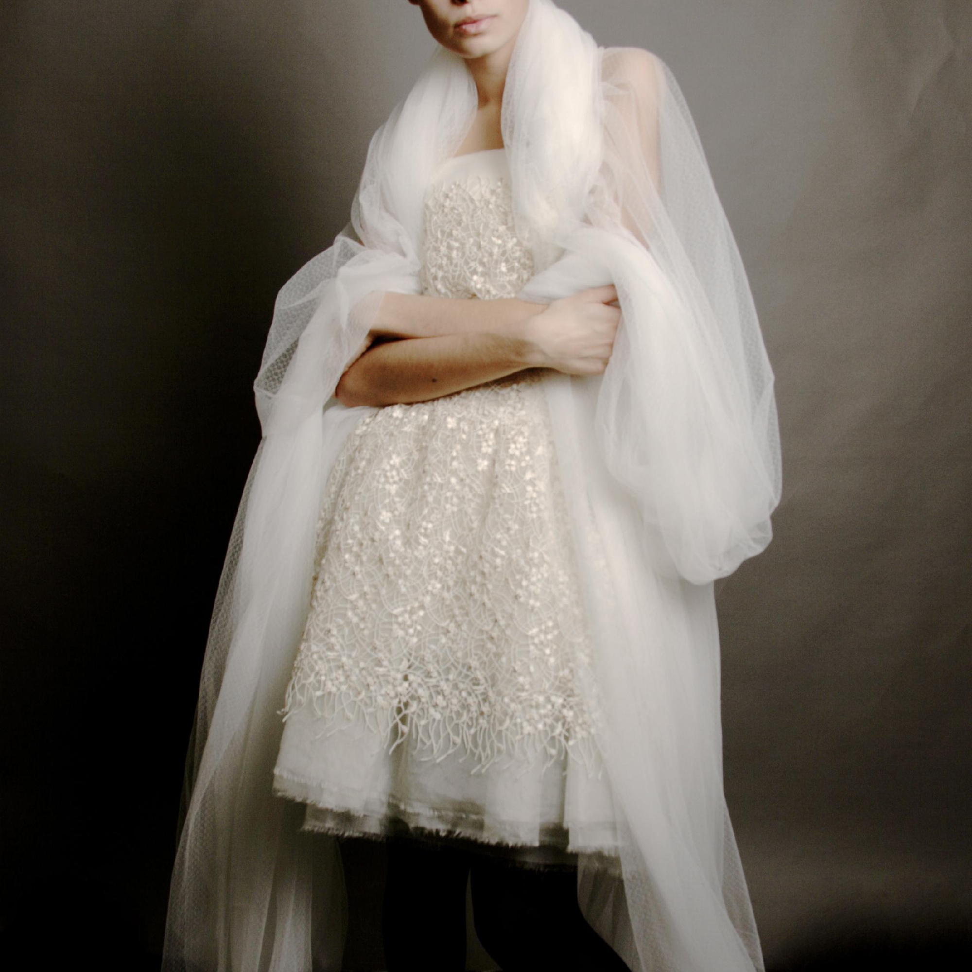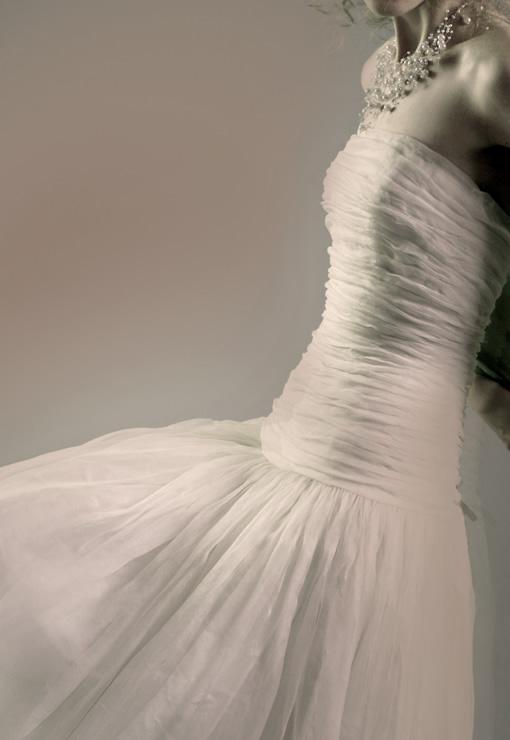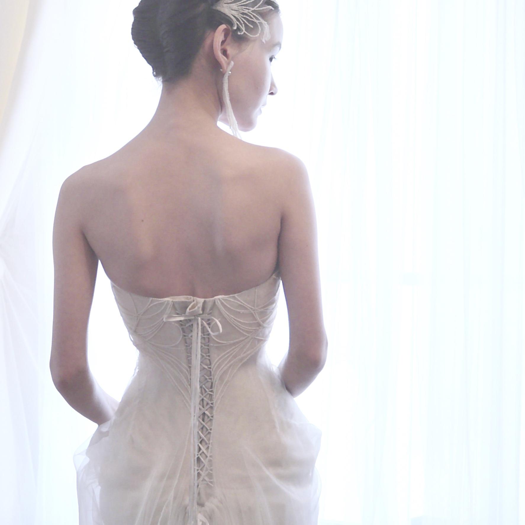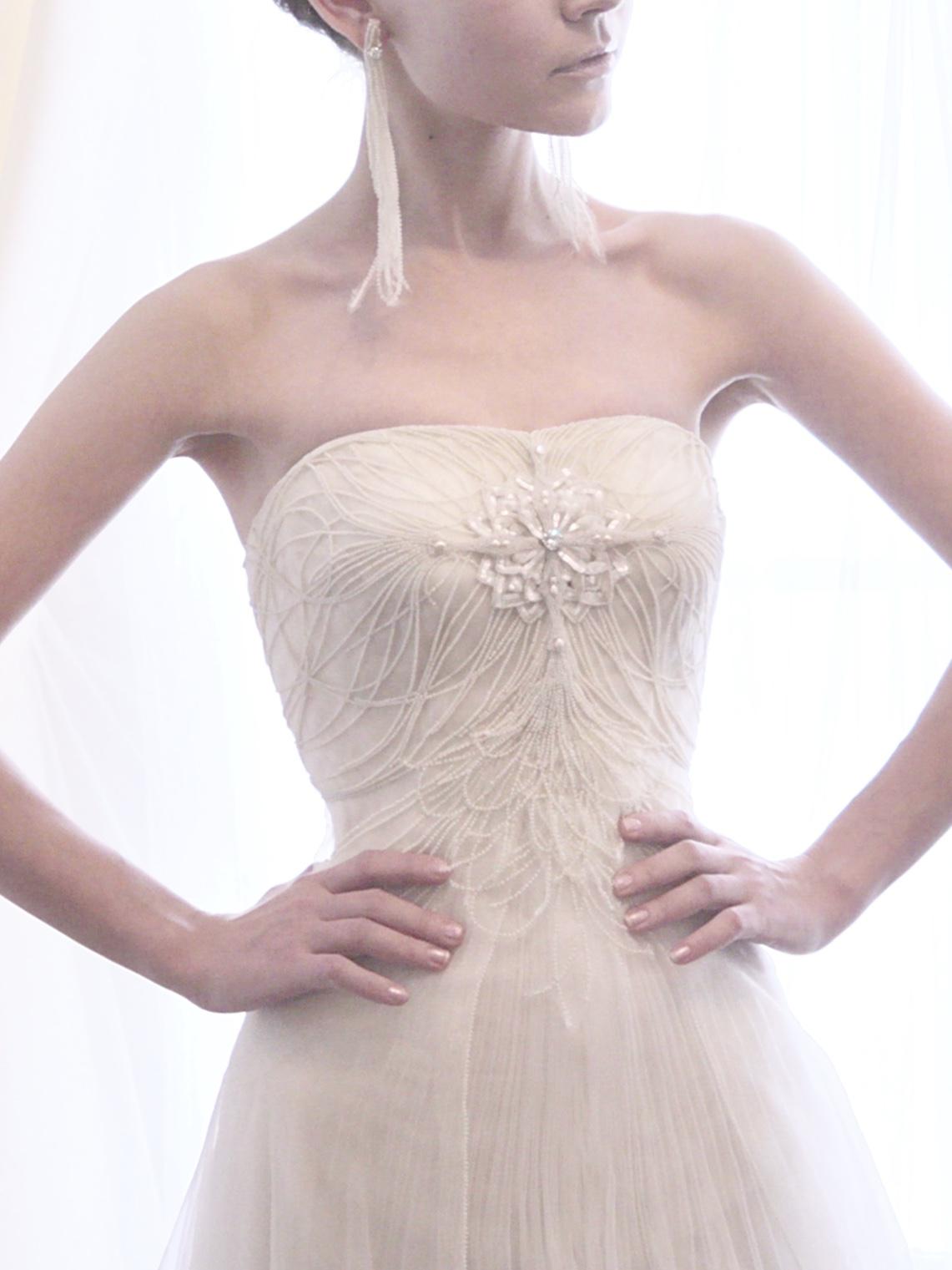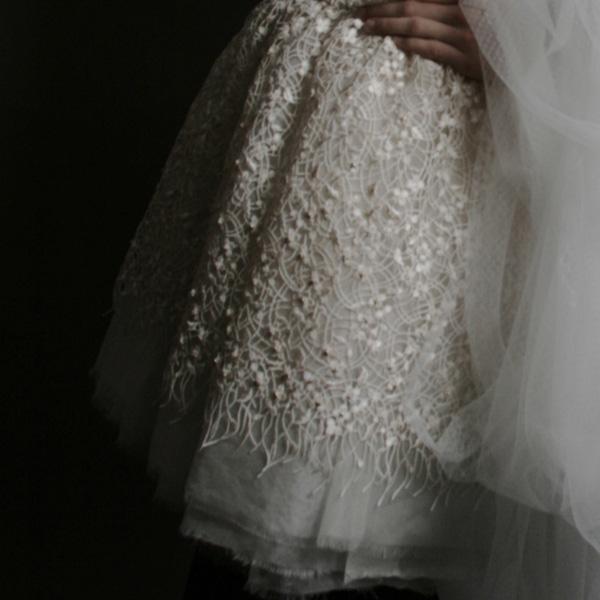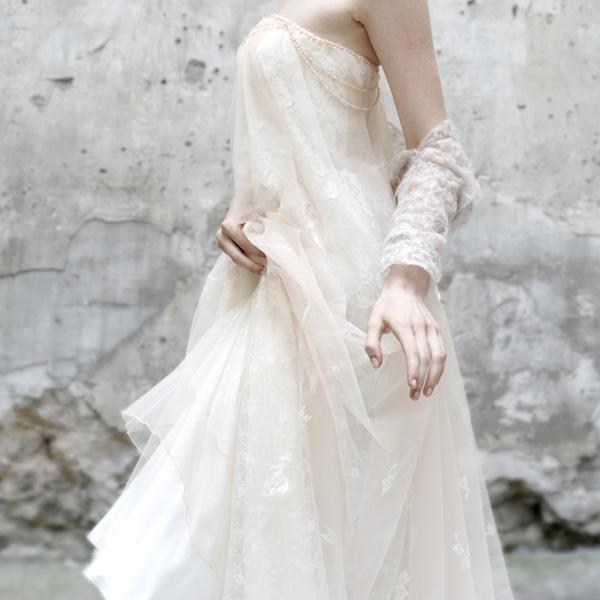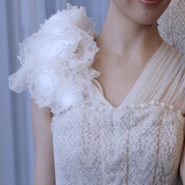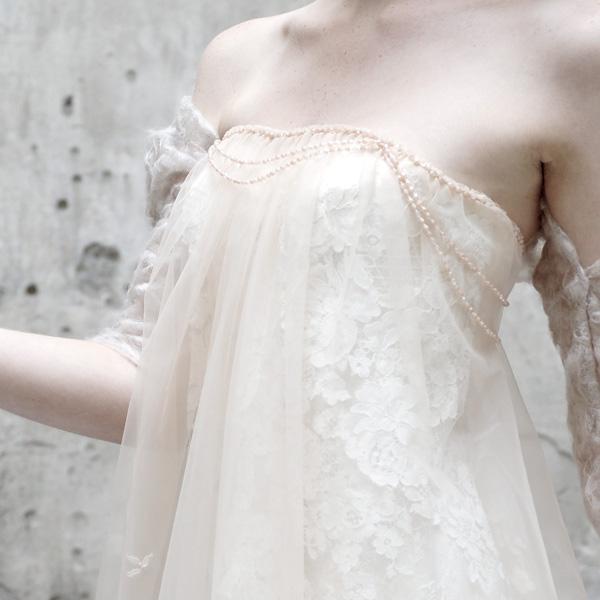 クチュールの手仕事により、柔らかなギャザーが、ごく自然なまま繊細に縫い止められます。流れるようなドレープのシルエットが優美さを醸し出し、バックトレーンへと、レース端のスカラップが弧を描きます。歩く度にトレーンのささやかな重みがスレンダーで美しいシルエットを魅せます。