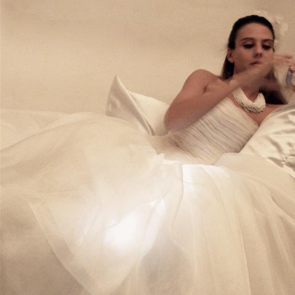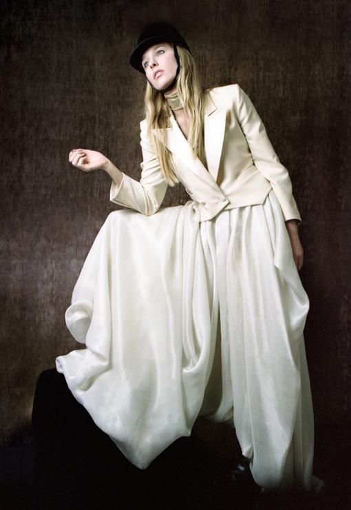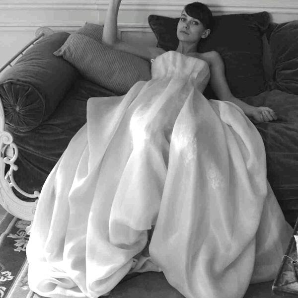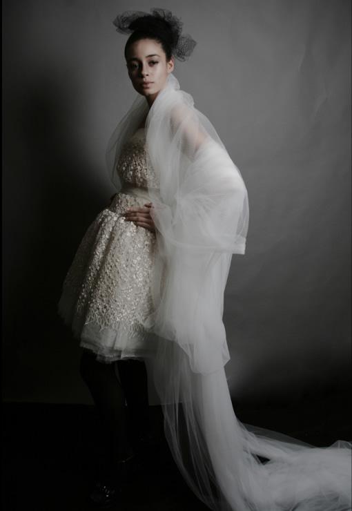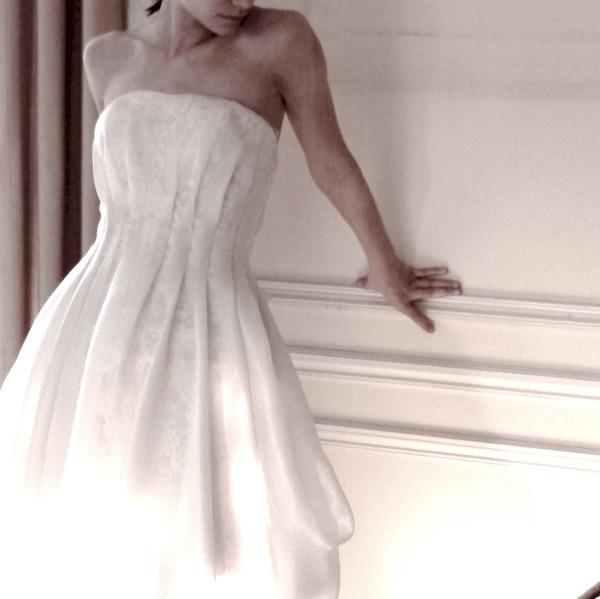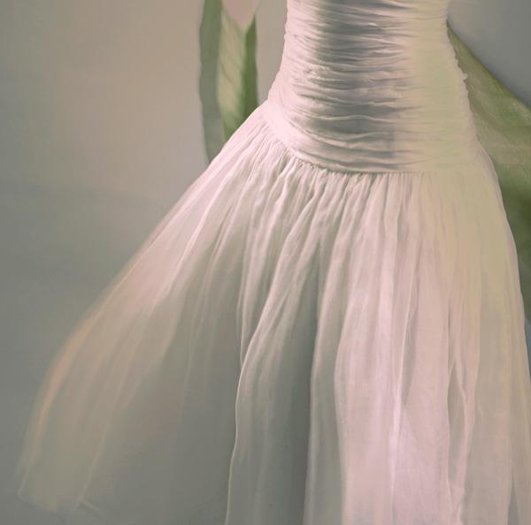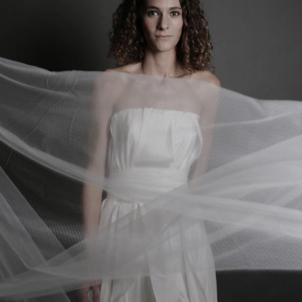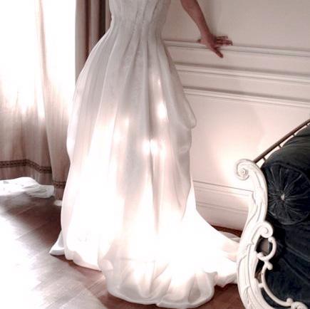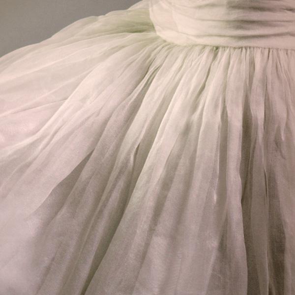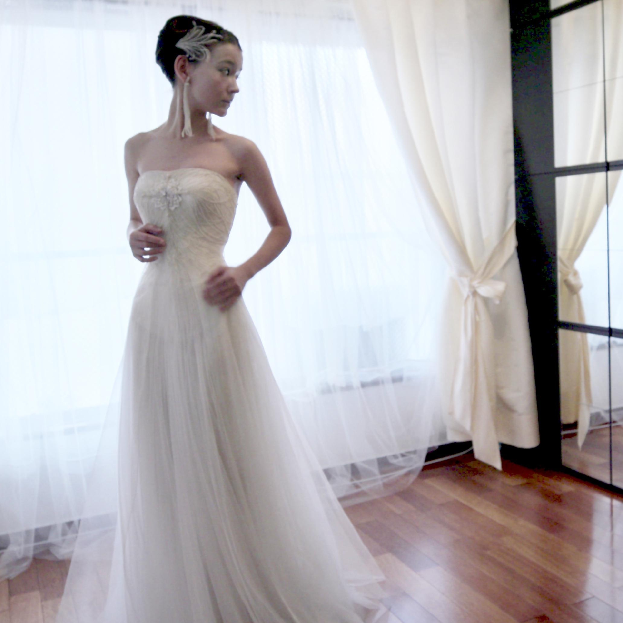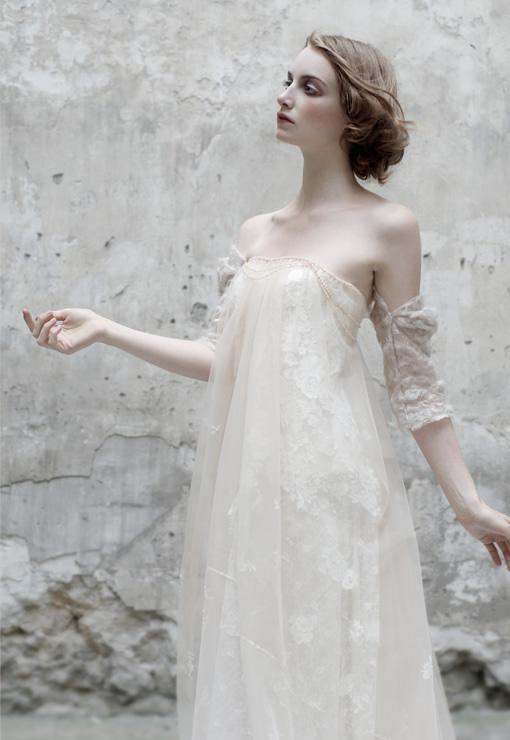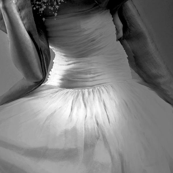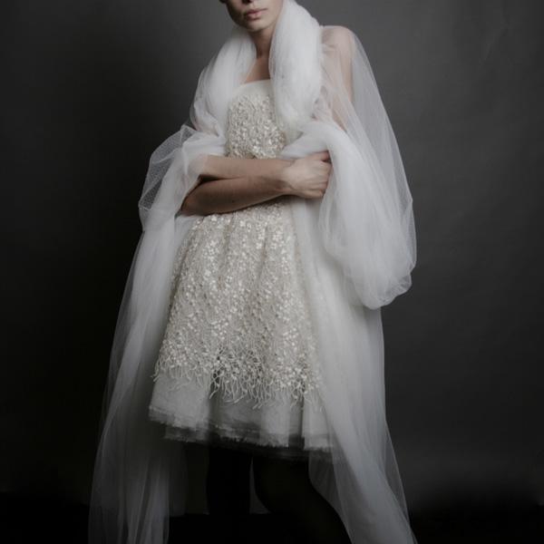 クチュールの手仕事により、柔らかなギャザーが、ごく自然なまま繊細に縫い止められます。流れるようなドレープのシルエットが優美さを醸し出し、バックトレーンへと、レース端のスカラップが弧を描きます。歩く度にトレーンのささやかな重みがスレンダーで美しいシルエットを魅せます。