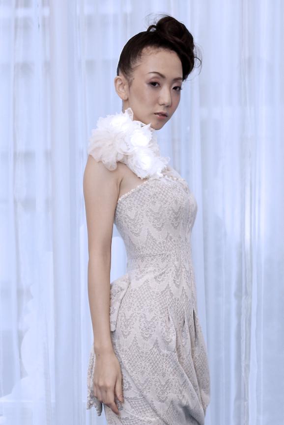 シンプルなデザインは内側のコルセットによる胸元からウェストへの自然なラインを強調し、肩にワンショルダーのポイントを持たせると背が高くスタイリッシュな印象に。