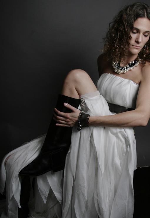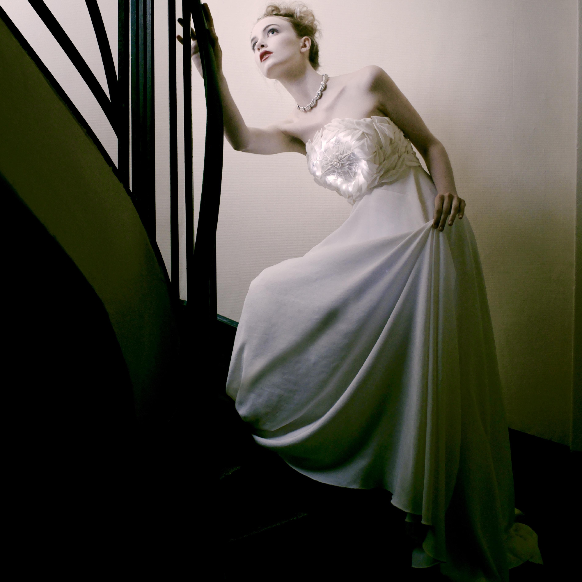 ナチュラルなドレープ感のある素材が、優美なシルエットを魅せ、バックのトレーンへと流れます。スタイリング次第で、クラッシックにもモダンにも変化し、コーディネイトを楽しむ事が出来るドレスです。内側のコルセットによる引き締めが、胸元からウエストへの美しいラインを強調し、スタイリッシュな印象に。