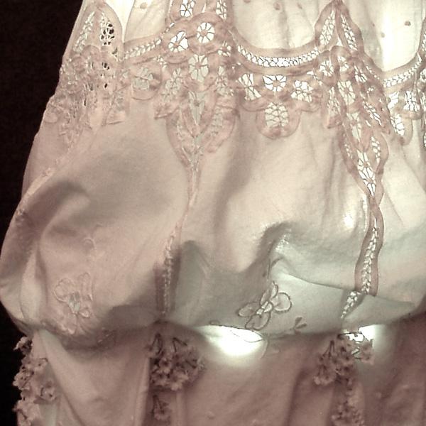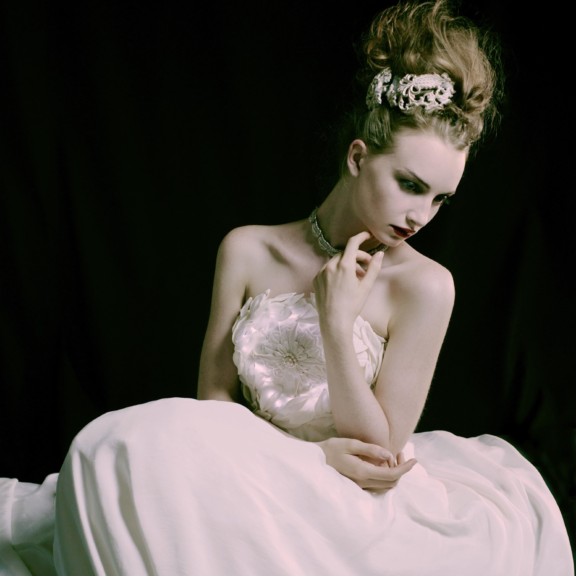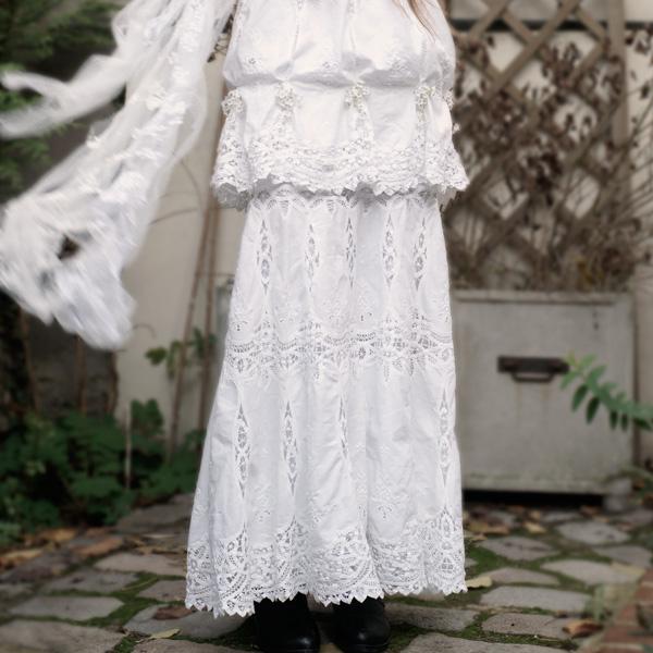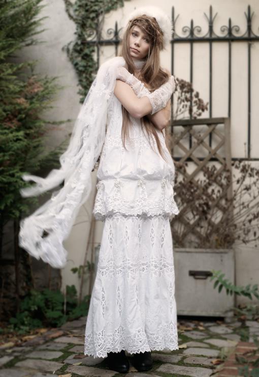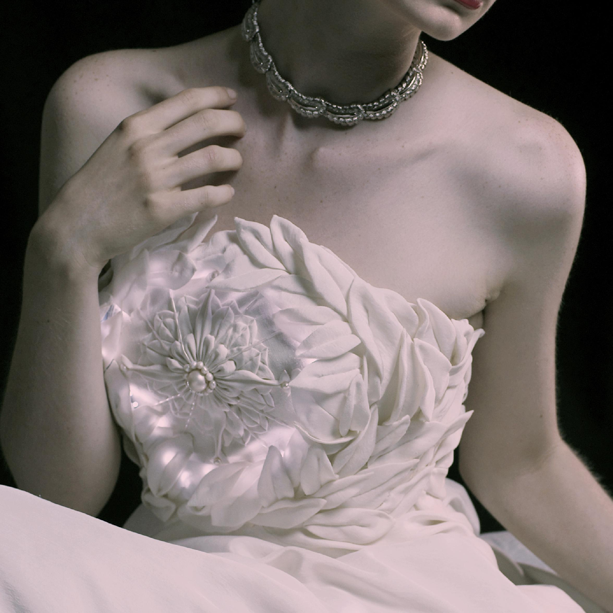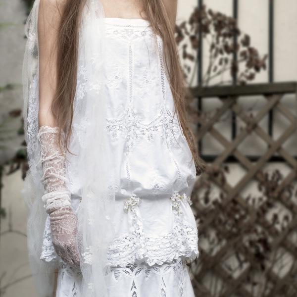 甘過ぎないシンプルなデザインは内側のコルセットによって胸元からしっかりとシェイプし、ウェストベルトで引き締めます。レース端の茎の一本一本を縢(かが)った手仕事が、モダンさとクチュール感をも漂わせます。