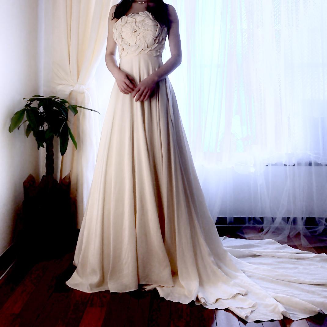 生地の柔らかさ、風合いを生かした手仕事のバイアスカットされたペタル(葉っぱ、花びら)が幾十にも重なり合うドレスは、ナチュラル、シンプル、モダンとコーディネイト次第で様々なイメージを表現します。 流れるようなナチュラルなAラインシルエットが、優美なラインを醸し出し、バックに向かってトレーンのように流れます。